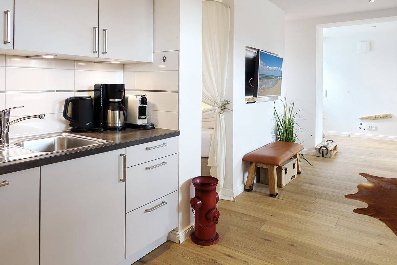 Das Lifestyle-Appartement Sylter Stubn® erwartet Sie im Herzen der Insel Sylt, aber dennoch fernab vom Trubel der Innenstadt von Westerland. Das 1-Raum-Appartement ist besonders gemütlich und modern eingerichtet und bietet Ihnen jede Menge kleine Details, die Ihren Urlaub besonders werden lassen. Der offene Wohnbereich überzeugt mit einer großen Couch, Flatscreen-TV und offener Küche, die mit einer Mikrowellen-Backofen Kombination und einer Geschirrspülmaschine ausgestattet ist. Der Schlafbereich für zwei Personen ist geschickt durch einen Raumtrenner vom Wohnbereich abgeteilt. Auf gleicher Ebene finden Sie ein modernes Badezimmer mit Regendusche und WC. Vom Wohnbereich aus betreten Sie des Weiteren eine kleine Terrasse, auf der Sie die Nordseeluft genießen können. Ausstattung: 1-Raum Appartement im Erdgeschoss mit ca. 42 m² Nutzfläche für bis zu zwei Personen EG: Wohnraum mit Flatscreen-TV, Harman-Kardon Bluetooth-Box, W-LAN, offene Küche mit Microwelle-Backofen-Kombi, Arbeitsplatz für Home-Office vorhanden, Geschirrspülmaschine, Kaffeemaschine, Schlafbereich mit Doppelbett (160x200cm), Duschbad, Terrasse Einen Parkplatz finden Sie direkt am Haus. Es handelt sich hierbei um ein Nichtraucherdomizil, in dem ein Hund willkommen ist.