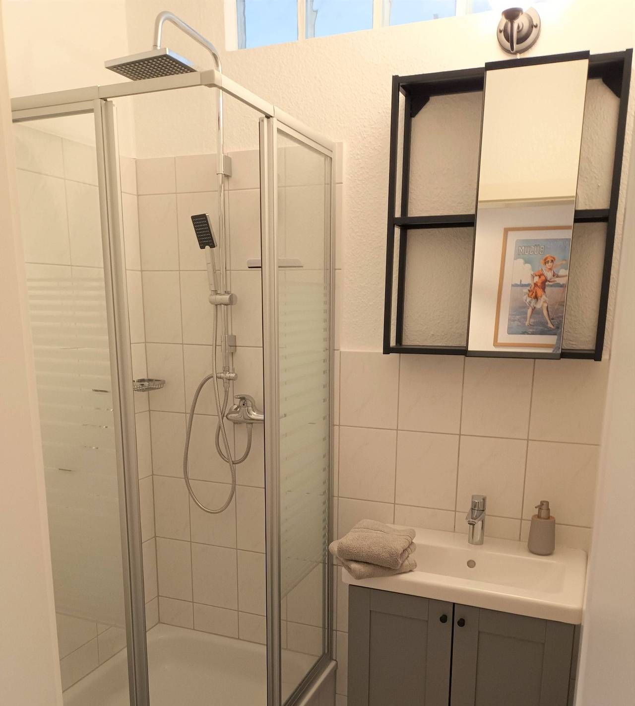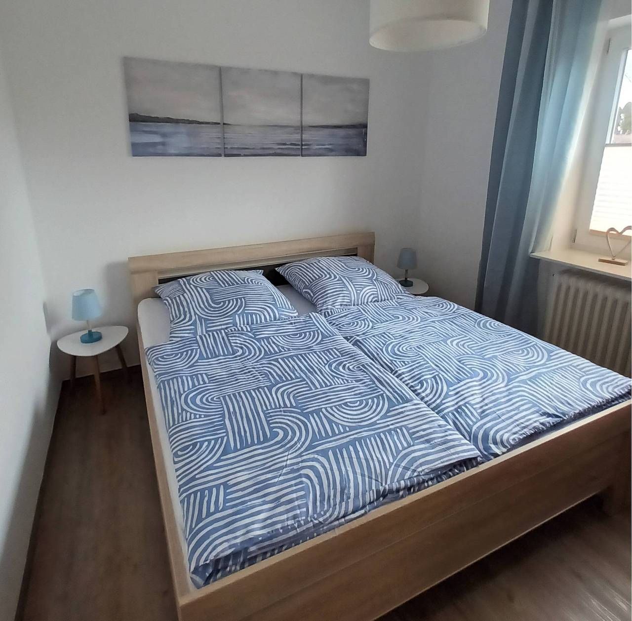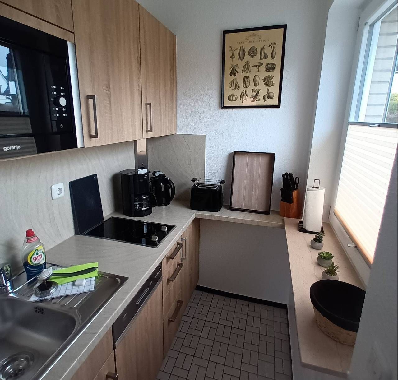 Unsere komfortable 2-Raum Ferienwohnung liegt im Erdgeschoss und bietet auf 2 Räumen verteilt genügend Platz für 2 Personen. Das hell und freundlich eingerichtete Wohnzimmer ist mit einer gemütlichen Couch, einem Esstisch mit 4 Stühlen, Sat-TV, DAB+Radio ausgestattet. Von hier aus gelangst du über einen kleinen Absatz auf die nach Süden ausgerichtete Terrasse, die zum Verweilen einlädt. Die kleine Küche mit 2-Platten-Kochfeld, Geschirrspülmaschine, Mikrowelle und Kühlschrank mit Gefrierfach bietet dir die Möglichkeit, sich gut zu versorgen. Das Schlafzimmer mit seinem großen Kleiderschrank und einem Doppelbett lädt zum Träumen ein. Das kleine Bad ist mit Dusche (erhöhter Eckeinstieg mit ca. 34 cm breit), WC und Handwaschbecken ausgestattet. In der gesamten Wohnung gibt es an allen Fenstern elektrische Außenjalousien. Für Fahrräder gibt es hinter dem Haus einen nicht überdachten Fahrradständer; wir empfehlen, die Fahrräder auf die zur Wohnung zugehörigen Terrasse zu stellen, da diese überdacht ist.