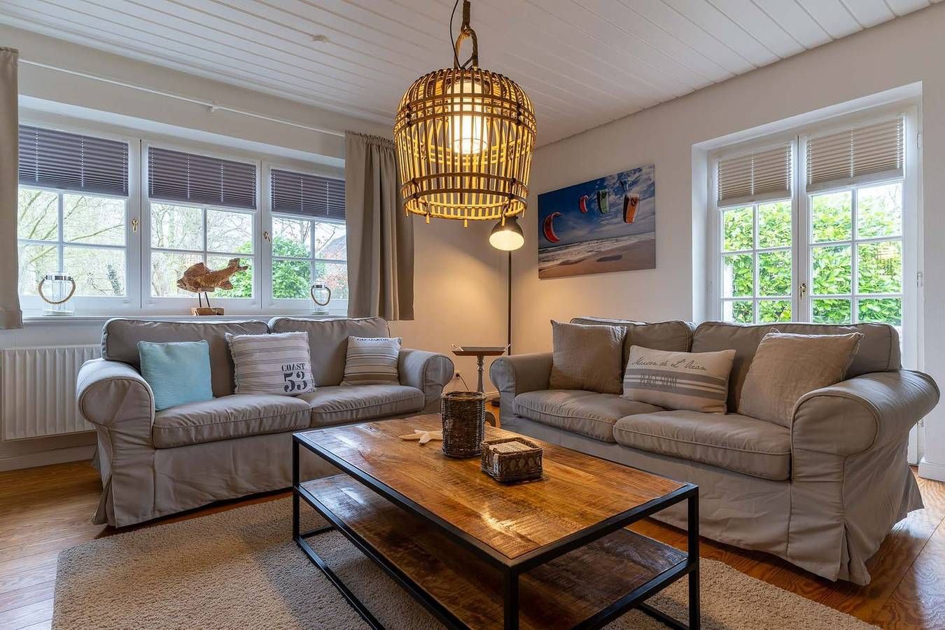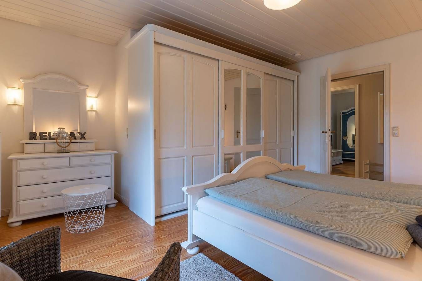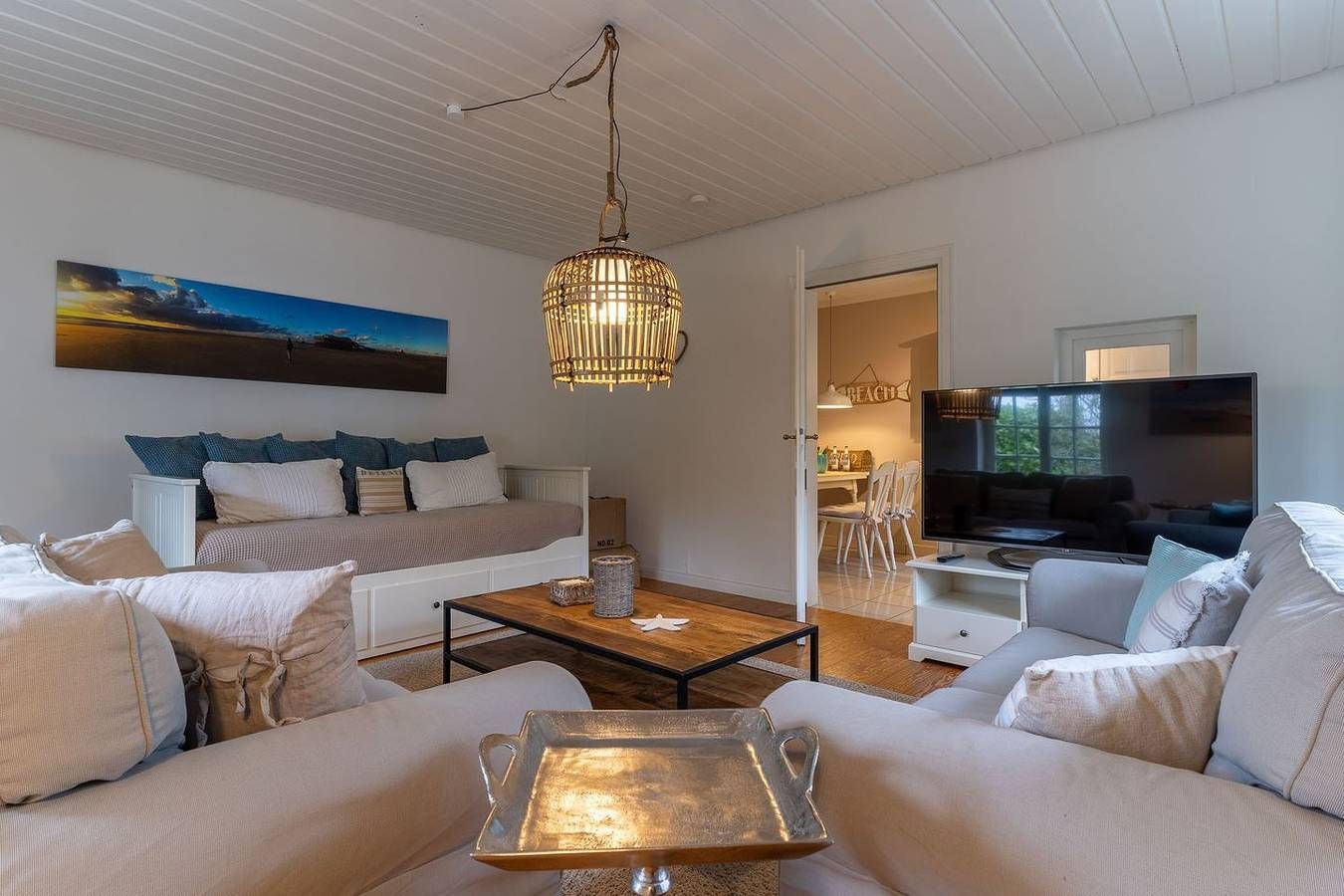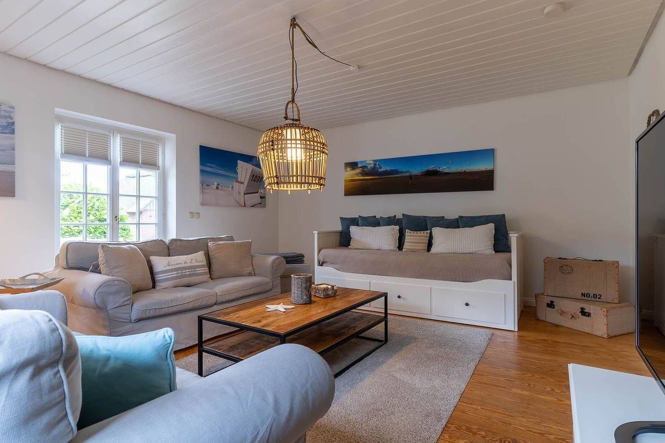Die gemütliche 3-Zimmer Wohnung im Strandhausstil mit eigenem Eingang befindet sich im Erdgeschoss und erstreckt sich über ca. 85 qm. Die Wohnung besteht aus einem Eingangsbereich mit einer offenen Küche und einem gemütlichen Essbereich für 4 Personen mit einem ausziehbaren Esstisch, einem separaten Wohnzimmer, zwei separaten Schlafzimmern, einem großen Duschbad mit WC und einem praktischen Abstellraum. Eine eigene, schöne, geschützte Terrasse mit Terrassenmöbeln, 2 Liegen, einer elektrischen Markise, einem Sonnenschirm und einem kleinen Vorgarten gehören zur Wohnung dazu und ein wunderschöner großer, parkähnlicher Garten mit Sonnenliegen, Spielplatz, Bänken und einem Grillplatz für die Sommerzeit stehen allen Gästen zur Verfügung. Schlafzimmer 1 mit einem 1,8 x 2 m Doppelbett mit 2 einzelnen Matratzen und geschlossenem Fußende. Schlafzimmer 2 mit einem 1,8 x 2 m Boxspringbett mit offenem Fußende und mit TV.