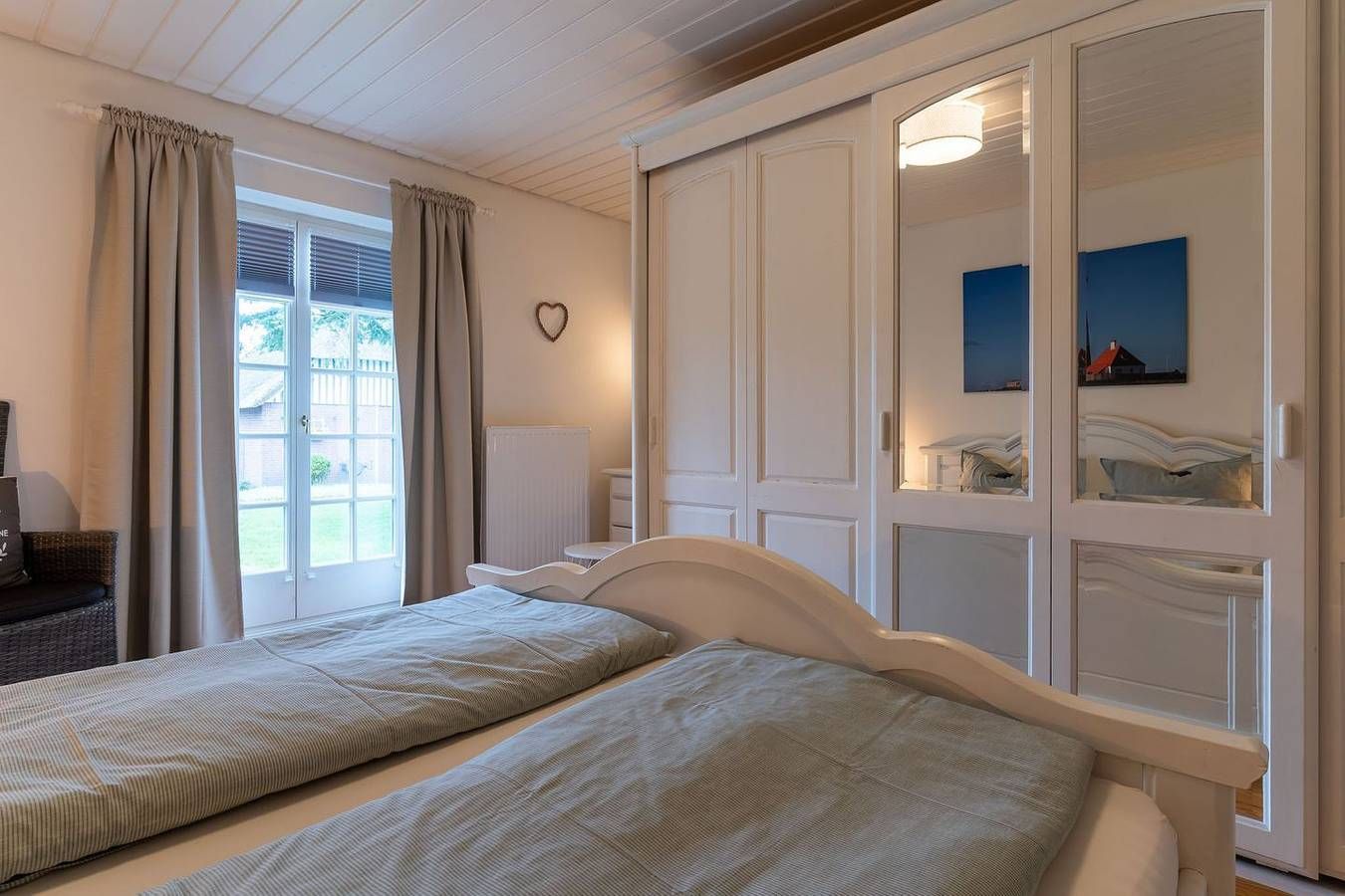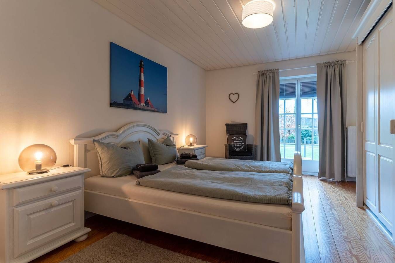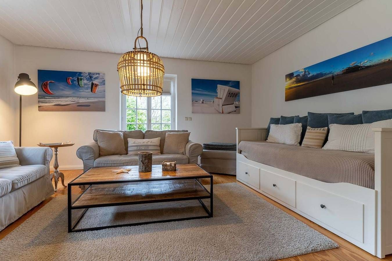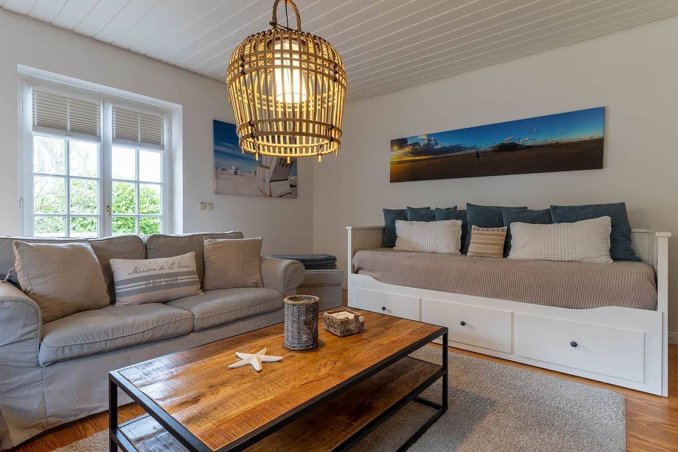 Die gemütliche 3-Zimmer Wohnung im Strandhausstil mit eigenem Eingang befindet sich im Erdgeschoss und erstreckt sich über ca. 85 qm. Die Wohnung besteht aus einem Eingangsbereich mit einer offenen Küche und einem gemütlichen Essbereich für 4 Personen mit einem ausziehbaren Esstisch, einem separaten Wohnzimmer, zwei separaten Schlafzimmern, einem großen Duschbad mit WC und einem praktischen Abstellraum. Eine eigene, schöne, geschützte Terrasse mit Terrassenmöbeln, 2 Liegen, einer elektrischen Markise, einem Sonnenschirm und einem kleinen Vorgarten gehören zur Wohnung dazu und ein wunderschöner großer, parkähnlicher Garten mit Sonnenliegen, Spielplatz, Bänken und einem Grillplatz für die Sommerzeit stehen allen Gästen zur Verfügung. Schlafzimmer 1 mit einem 1,8 x 2 m Doppelbett mit 2 einzelnen Matratzen und geschlossenem Fußende. Schlafzimmer 2 mit einem 1,8 x 2 m Boxspringbett mit offenem Fußende und mit TV.