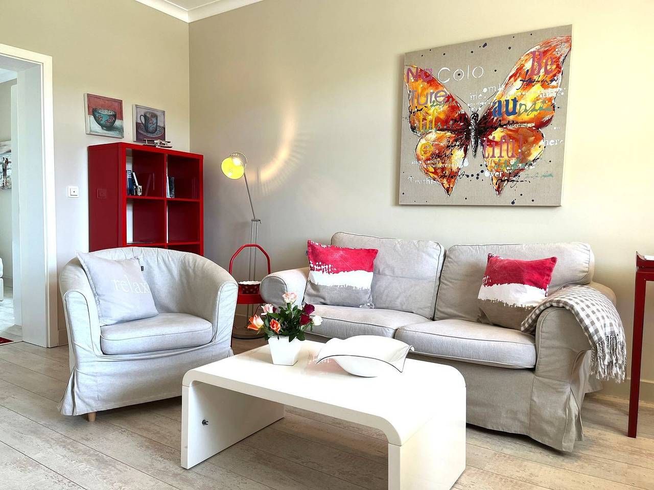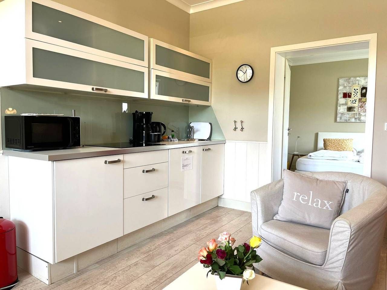 Die ebenerdige 2-Zimmer-Wohnung (ca. 40 m², Erdgeschoss) präsentiert sich modern, neu, aber auch gemütlich. Sie verfügt über einen schicken Wohn-/Essbereich mit elektrischem Kamin, großem Sofa, Essecke, Flachbildfernseher,...