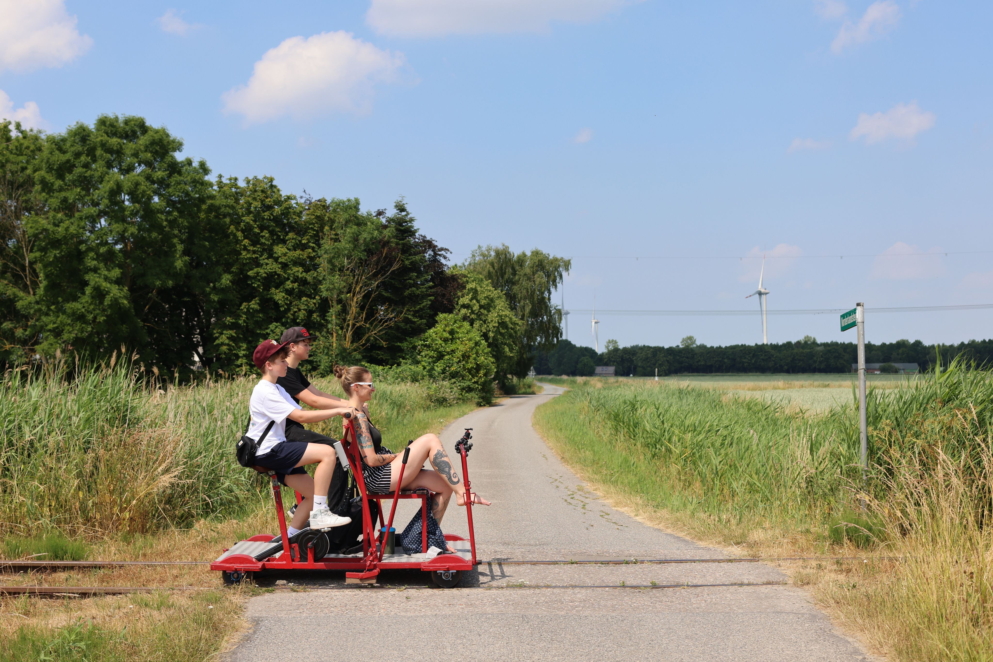 Die etwa neun Kilometer lange Strecke von St. Michaelisdonn nach Marne kann in etwa eineinhalb Stunden mit der Handhebelbahn zurückgelegt werden. „Die 90 Minuten schaffen fast alle“, sagt Lindner. Das Deutsche Rote Kreuz bietet einen Shuttleverkehr an.