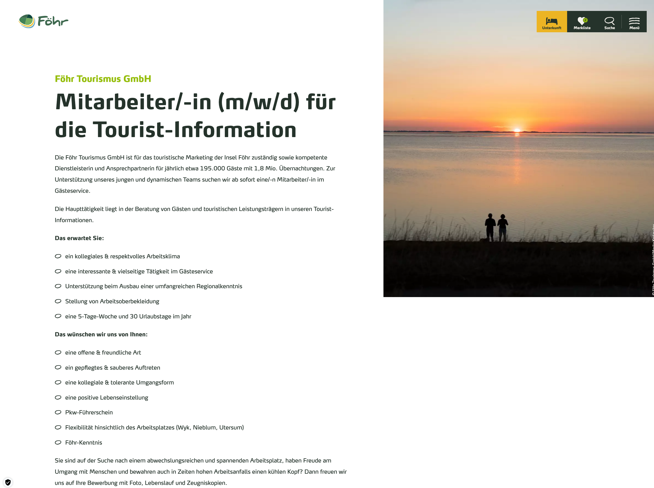 Die Jobbörse von Föhr bietet Betrieben, deren Arbeitsort auf Föhr liegt, die Möglichkeit, kostenlos unter https://www.foehr.de/jobs eine oder mehrere Stellenanzeigen hochzuladen, woraufhin die Mitarbeiter*innen der Föhr Tourismus GmbH diese Informationen auf ihre Internetseite einpflegen. Für insgesamt drei Monate erscheint die Stellenanzeige dann auf der oben genannten Seite – sollte bereits früher jemand eingestellt werden, wird sie, nach einem kurzen Hinweis des Unternehmens, gelöscht. Wenn Sie als Arbeitnehmer dann mehr über die ausgeschriebene Stelle erfahren möchten, können Sie auf die Detailseite der Anzeige gehen und finden dort weitere Informationen zur Bewerbung.
