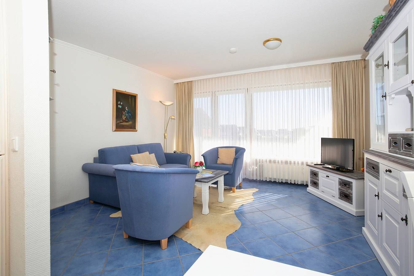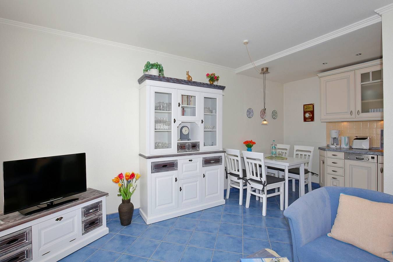 Gemütlich, direkt hinter den Dünen – Mit eigenem Stellplatz! Erleben Sie entspannte Urlaubstage in dieser gemütlichen 2-Zimmer-Nichtraucher-Ferienwohnung mit ca. 48 m² Wohnfläche, ideal für maximal 4 Personen. Die Wohnung befindet sich in der 1. Etage zur Südseite und bietet einen großzügigen Südbalkon, der mit Balkonmöbeln und Auflagen ausgestattet ist und zum Verweilen in der Nachmittagssonne einlädt. Beim Betreten gelangen Sie über einen einladenden Vorflur mit Garderobe in den klar strukturierten Wohnbereich, das Schlafzimmer und das helle Duschbad/WC. Der Wohnbereich besticht durch eine komfortable Sitzgarnitur – bestehend aus einer 2-Sitzer-Couch mit Schlaffunktion und zwei Sesseln – sowie einen separaten Essplatz. Zusätzlich sorgen Radio, Flachbild-TV, WLAN und Telefon für beste Unterhaltung. Von hier aus haben Sie direkten Zugang zum Südbalkon. Die zum Wohnbereich offene Kochnische ist voll ausgestattet mit einem Geschirrspüler, einer Mikrowelle, einem Ceranfeld mit 4 Kochfeldern, einem Kühlschrank mit 3-Sterne-Gefrierfach und einem Fenster. Zur Grundausstattung zählen zudem Kaffeemaschine, Wasserkocher und Toaster. Das gemütliche Schlafzimmer ist mit einem Doppelbett eingerichtet, während das Badezimmer über eine Dusche, ein WC und einen Waschtisch verfügt. Weitere Annehmlichkeiten umfassen einen PKW-Außenstellplatz direkt am Haus sowie eine Waschküche im Kellergeschoss, in der Waschmaschine und Trockner gegen Münzeinwurf zur Verfügung stehen. Bitte beachten Sie, dass Haustiere in dieser Anlage nicht gestattet sind.