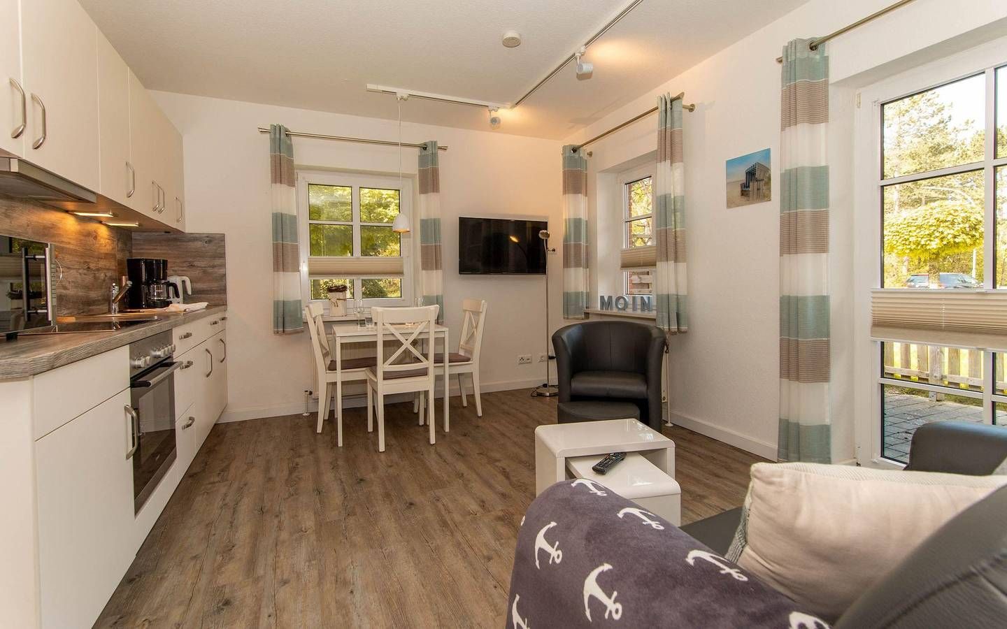 Garantiert nicht seekrank! Willkommen 'An Bord' Im Herzen von St. Peter-Ording in beliebter Lage im Ortsteil Bad liegt dieses schöne Appartementhaus mit 4 Wohnungen. Hier sollte man für einen erholsamen Urlaub anheuern. In 'Steuerbord' befindet sich eine helle Wohnkabine mit Essbereich, eine offene voll ausgestattete Kombüse für den Smutje und ein Schlafbereich mit Doppelkoje. Dann gibt es eine weitere Schlafkoje mit Kleiderschrank, ein Duschbad und komplettiert wird das Ganze mit einer möblierten Terrasse mit Strandkorb, welche direkt von der Wohnkabine aus zugänglich ist. - Im Herzen von St. Peter-Ording in beliebter Lage im Ortsteil Bad liegend. Bitte beachten Sie, dass eine eventuell anfallende Kurabgabe nicht im Gesamtpreis enthalten ist. Diese ist vor Ort zu leisten.