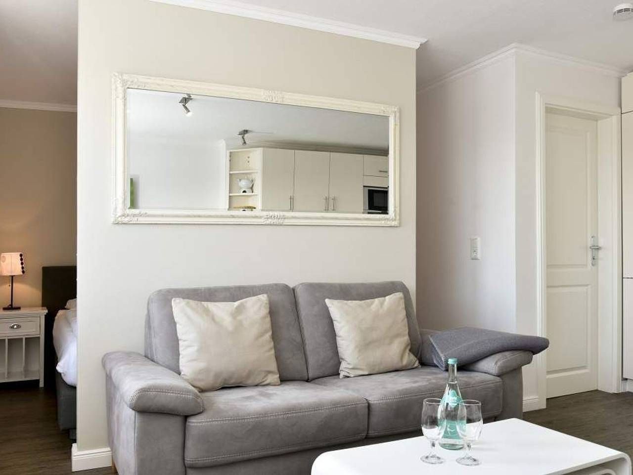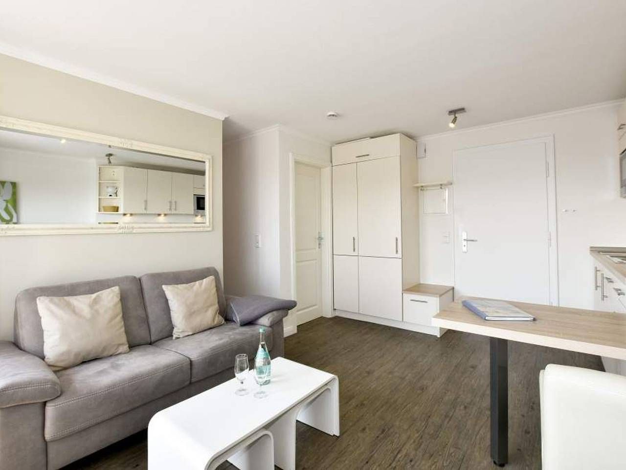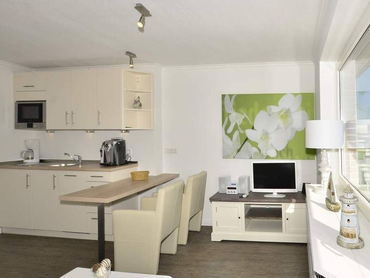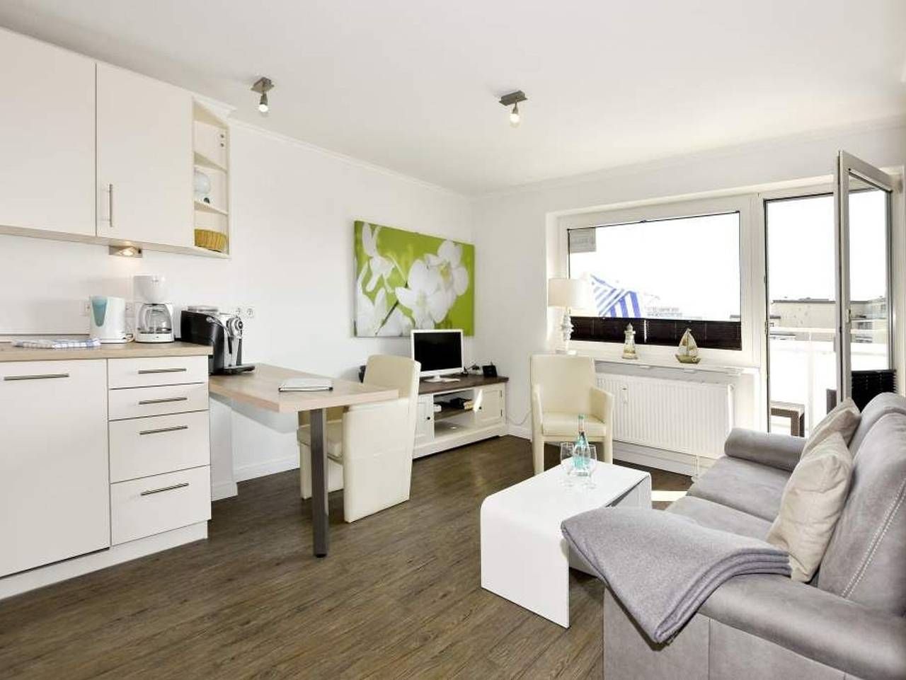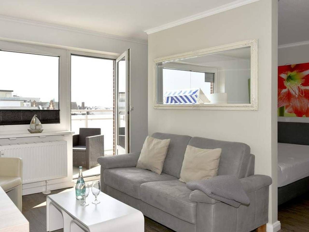 Geschmackvoll, modernen, im Strandhausstil! Gemütliche, moderne 1-Zimmer-Nichtraucher-Ferienwohnung mit abgeteiltem Schlafbereich, ca. 35 qm, 4. Etage zur Südostseite mit extra großem Balkon. Genießen Sie Ihr Frühstück in...