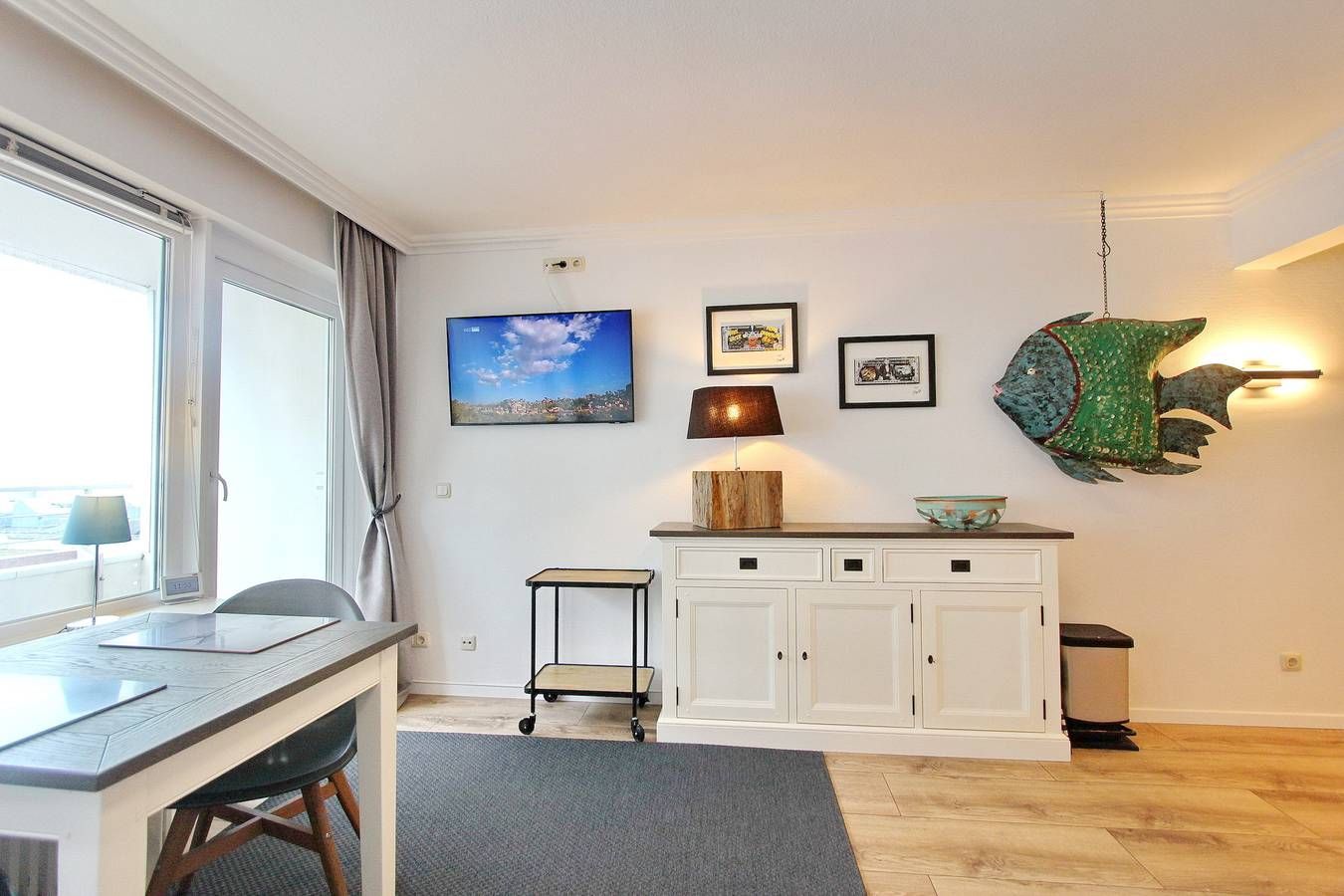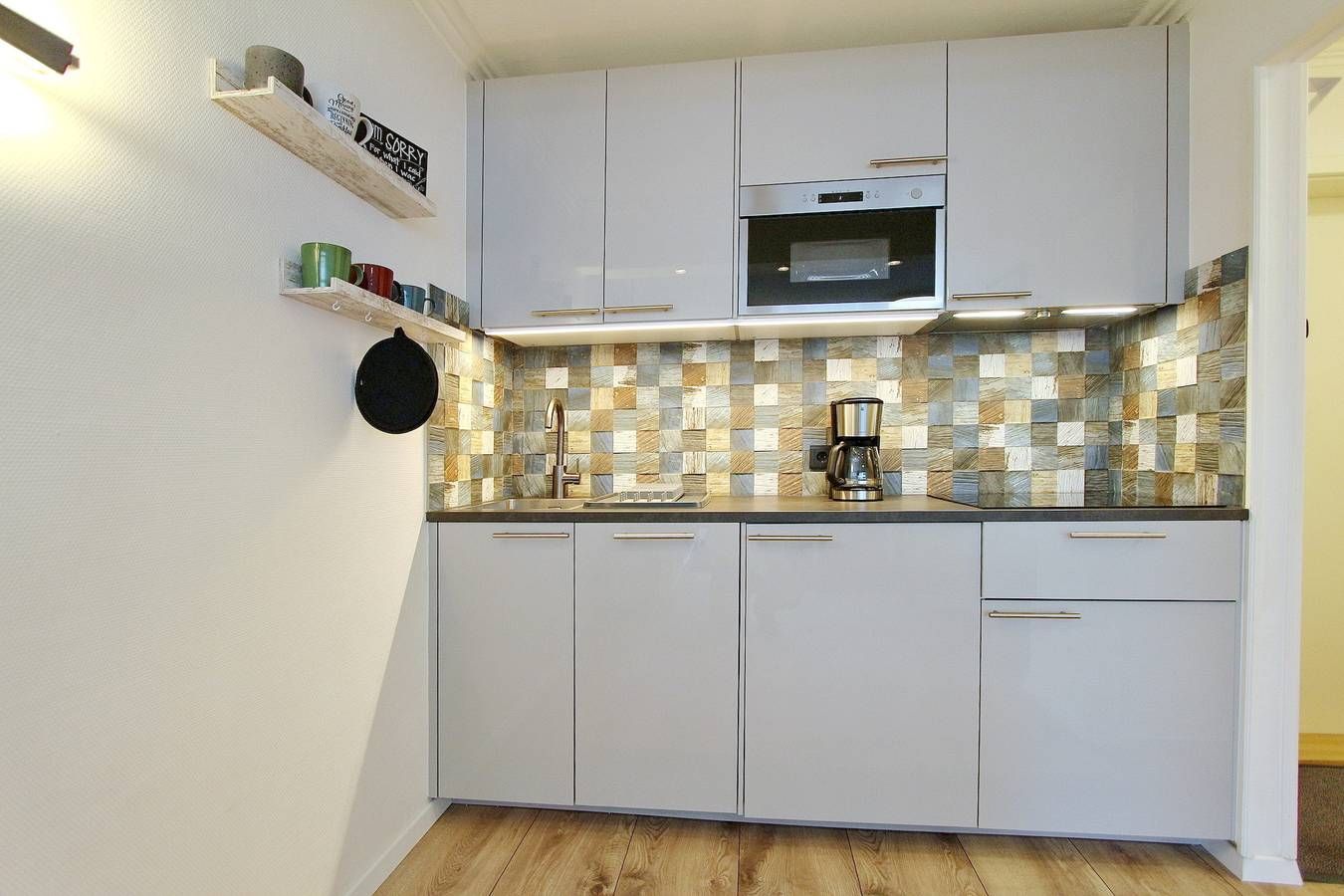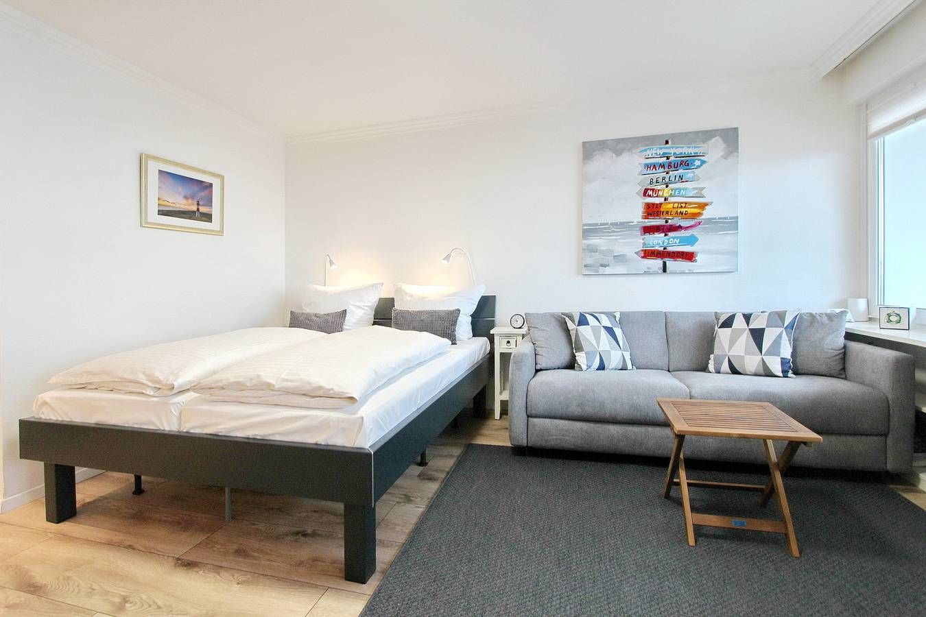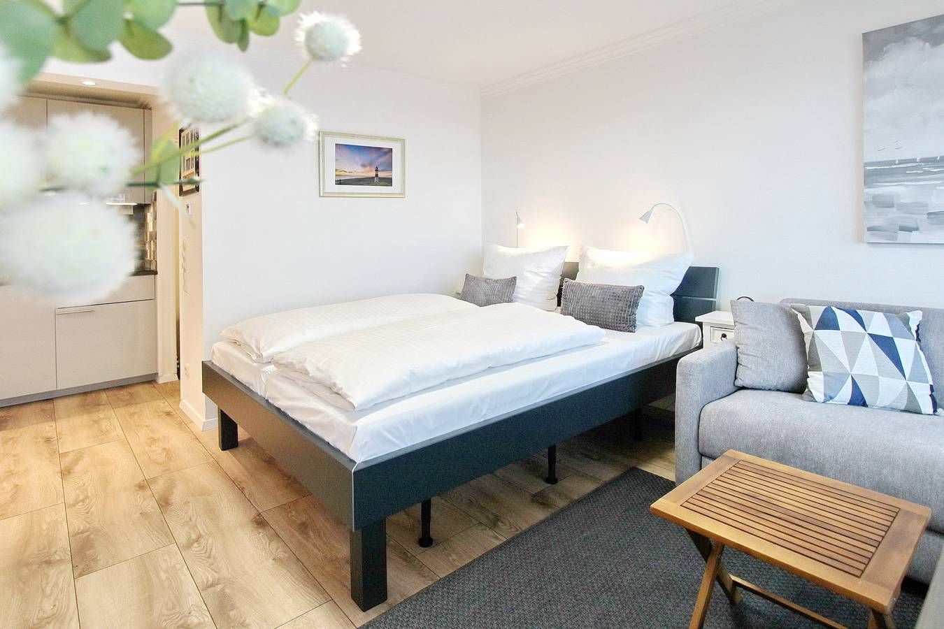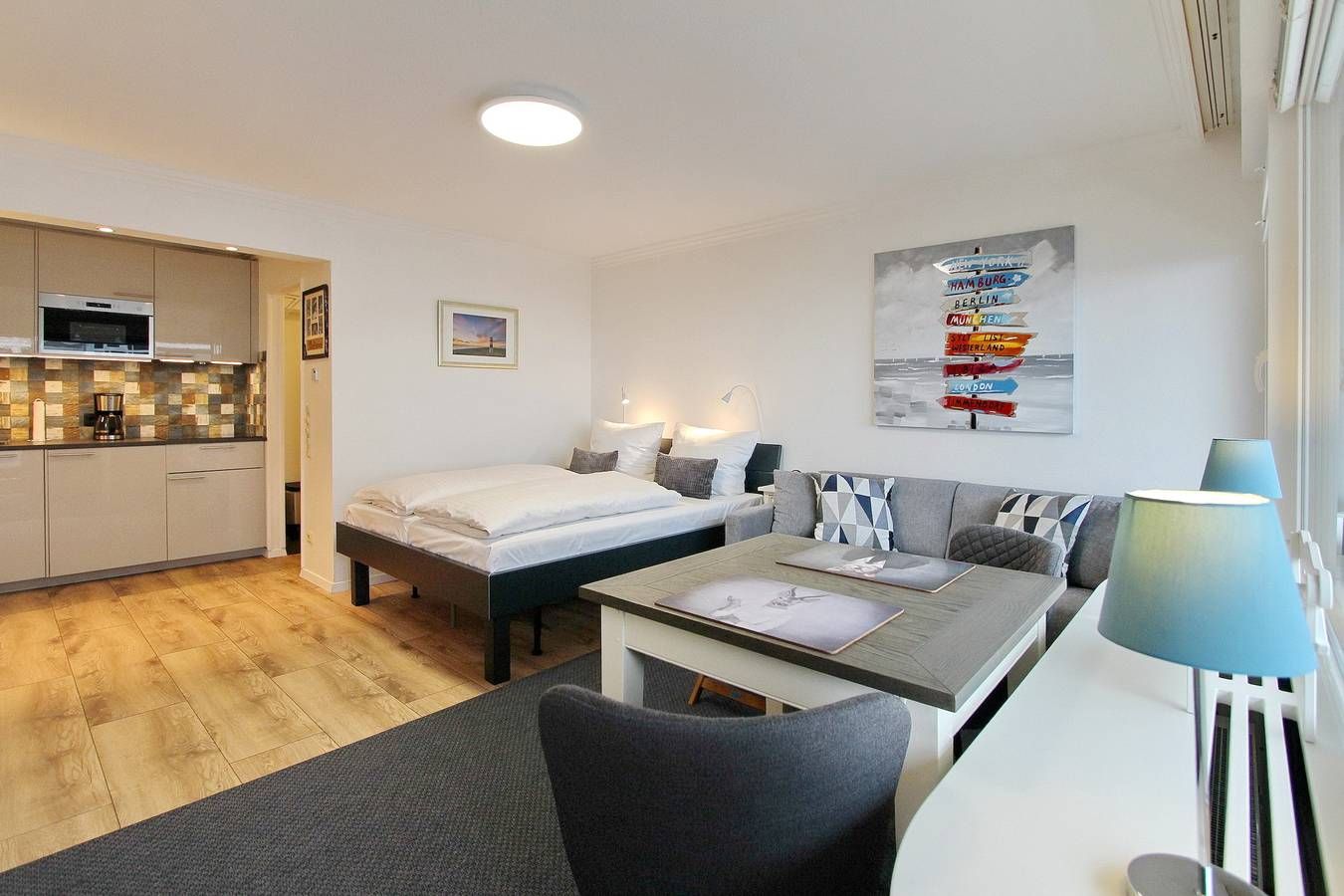 Modern und exklusiv eingerichtete 1 Zimmer-Wohnung im Herzen unserer Inselmetropole Westerland. Von der Wohnung und vom vorgelagerten Balkon zur Westseite haben Sie einen traumhaften Blick die Strandstraße hoch auf die Nordsee. Der kombinierte Wohn-/Schlafraum verfügt über ein feststehendes Doppelbett, einer gemütlichen Couchgarnitur und einem Essplatz mit zwei Stühlen. In der Küchenzeile, die ebenfalls im Wohnzimmer integriert ist, finden Sie eine Mikrowelle, einen Geschirrspüler, ein großes Induktion-Cerankochfeld und einem Kühlschrank mit Gefrierfach. Modernes Duschbad/WC mit einer Eckdusche mit tiefen Einstieg und einem Handtuchheizkörper. Smart-TV. Der Eigentümer hat ein eigenen Internetzugang ( Zugangsdaten in der Wohnung), der es Ihnen ermöglicht zu streamen oder zu arbeiten oder was das Herz begehrt. Haustiere sind nicht erlaubt. Nichtraucherwohnung. Wohnungsgröße ca. 31m²