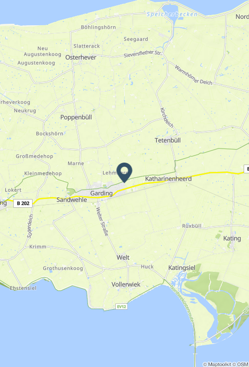Ferienwohnung, ca. 47 qm, Nichtraucher, 2 Personen 1. Obergeschoß: Wohn-Essraum mit Einbauküche, Geschirrspülmaschine, Tchibo Cafissimo Kapselmaschine, Mikrowelle und Kühlgefrierkombination. Wohnbereich mit Sofa, Sessel, Sat-TV, DAB-Radio und Bluetooth. Ausgang zum Balkon Schlafzimmer mit Doppelbett (160 x 200cm) und Kleiderschrank. Duschbad (Die Waschmaschine gehört nicht zur Aussattung!) Dachgeschoss: Es führt eine schmale (ca. 47 cm breit) und steile Raumspartreppe in das Dachgeschoss (Treppe ist für ältere Personen und Kinder nur mit Vorsicht nutzbar). Doppelbett (180 x 200cm) und Kleiderschrank. Zum Appartement gehören 2 Parkplätze, sowie ein abschließbarer Schuppen für Fahrräder Die Ferienwohnung verfügt über einen Balkon und liegt in der ersten und zweiten Etage eines kleineren Appartementhauses in einer ruhigen Sackgassenlage. Sie genießen die Ruhe und Erholung dieses Hauses mit einem unvergleichlichen Blick vom Balkon auf die Landschaft. Sind aber auch in nur 10 Minuten mit dem PKW an den weiten Sandstränden von St. Peter- Ording. Im Sommer laden der Spezialitätenmarkt der Landfrauen und die Musikantenbörse zum Verweilen ein. Die Musikantenbörse findet immer Dienstagsabend in der Innenstadt statt. Hier können Sie "handgemachte" Musik auf mehreren Bühnen genießen. Für das leibliche Wohl ist selbstverständlich auch gesorgt. Wenn Sie einmal nicht nach St. Peter- Ording (ca. 10 Autominuten) zum Baden möchten, besuchen Sie doch die Badestelle in Vollerwiek (ca. 5 Autominuten). Sie ist auch gut mit dem Fahrrad zu erreichen. An der DLRG- bewachten Badestelle finden Sie alles, was Sie für einen erholsamen Urlaubstag benötigen. Parkplätze, Süßwasserduschen, Liegeflächen auf dem Gründeich, Sandkasten, Treppen ins Wasser. Hinter dem Deich befindet sich ein beliebter Strandimbiss.