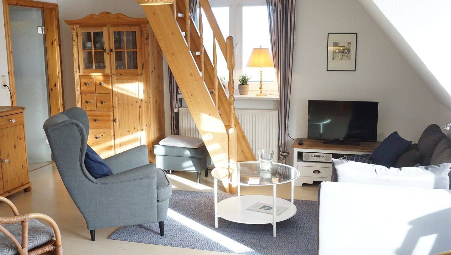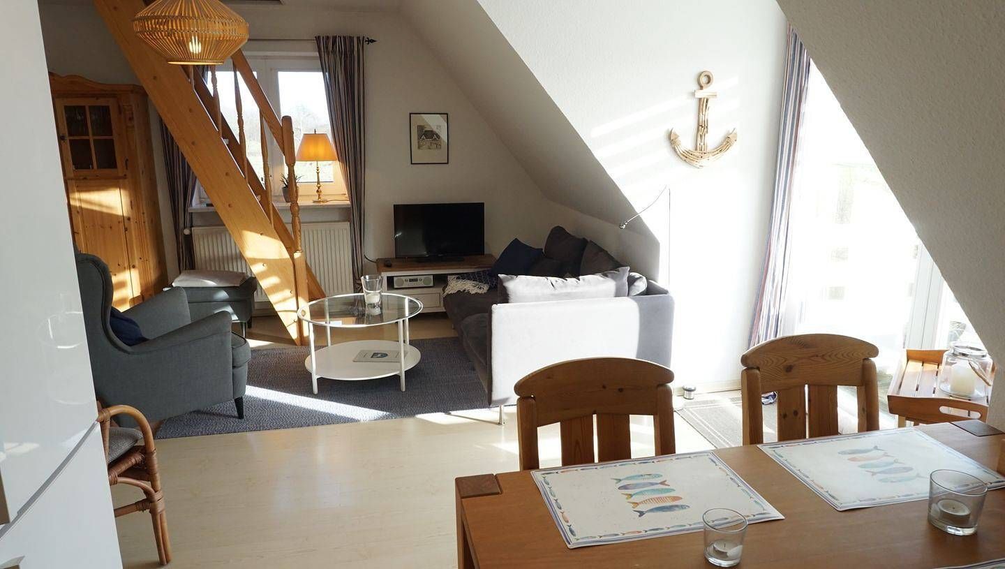 Ferienwohnung, ca. 47 qm, Nichtraucher, 2 Personen 1. Obergeschoß: Wohn-Essraum mit Einbauküche, Geschirrspülmaschine, Tchibo Cafissimo Kapselmaschine, Mikrowelle und Kühlgefrierkombination. Wohnbereich mit Sofa, Sessel,...