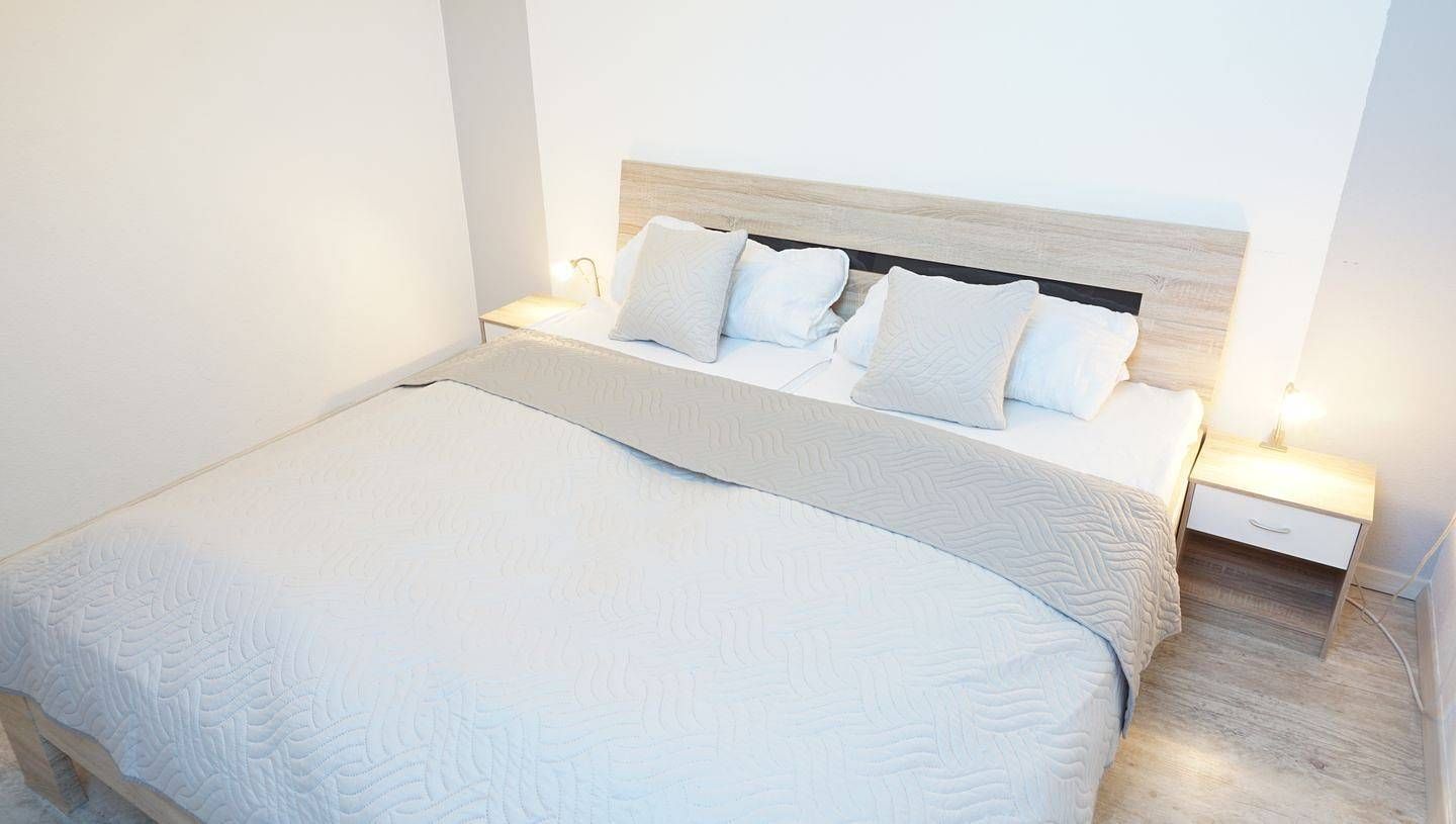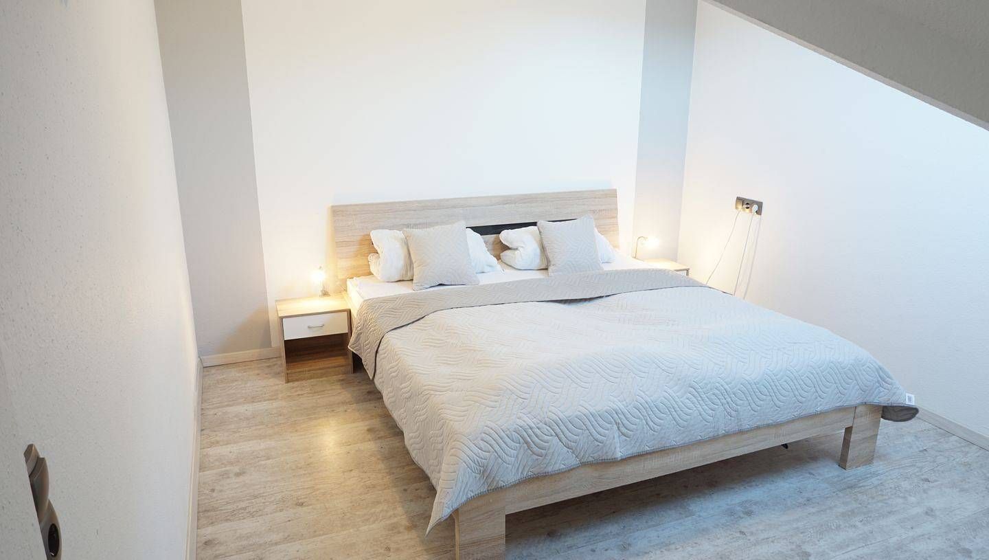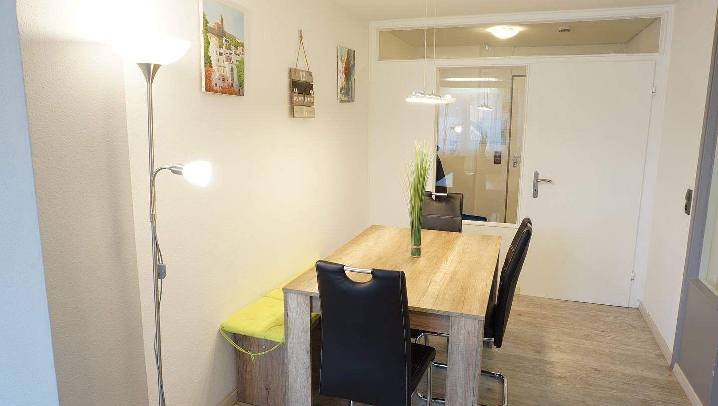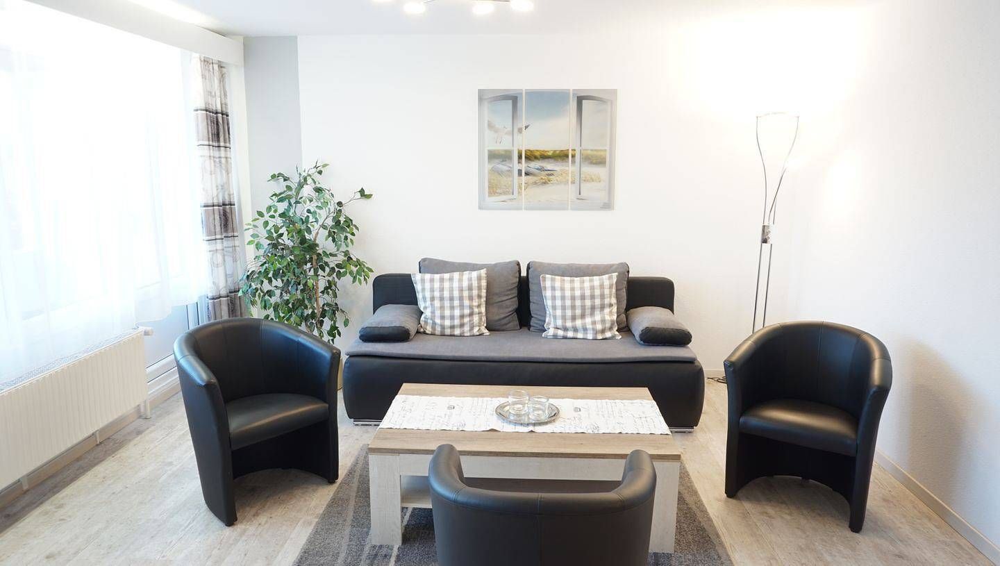 Appartement, ca. 58 qm, 2. OG (ohne Aufzug), 1-5 Personen, WLAN nicht vorhanden Wohn-Essraum mit Schlafsofa, Sessel, Kommode, 2 schmalen Kleiderschränken, Essbereich, Flachbildschirm Das Schlafsofa ist für Dauerschläfer...