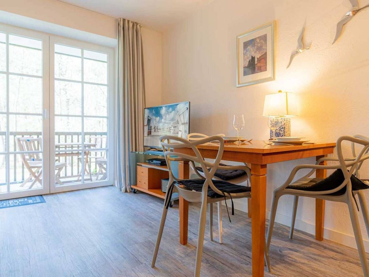 Zentral. Komfortabel. Komfortable 2-Zimmer-Ferienwohnung Flunder in der Friesenresidence mit ca. 55 qm auf 1 Ebene (EG) für bis zu 4 Personen (Wohlfühlbelegung: max. 2 Erwachsene). In zentrumsnaher Lage im Ortsteil Bad in St. Peter-Ording. Alle Geschäfte und Restaurants des Kurzentrums sind in wenigen Gehminuten erreichbar. Für einen Urlaub zum Verwöhnen! Hunde sind herzlich willkommen. Wohnzimmer mit ausklappbarem (Schlaf-) Sofa (140x190cm), Sessel, großem TV (Kabel), Sony Playstation 3, Bluetooth-Lautsprecher von Marshall, Kleiderschrank und Esstisch mit 3 Stühlen. Direkter Zugang zum möblierten Balkon nach Südwesten mit Ausblick auf das Kurwäldchen. Halboffene Küche mit Herd mit 2 Ceran-Kochstellen, Mikrowelle mit Grillfunktion, Geschirrspüler, Kühlschrank (ohne Gefrierfach) und DeLonghi Nespresso Kapsel-Kaffeemaschine. Schlafzimmer mit Doppelbett (2x 90x200cm), Herrendiener und TV (Kabel). Badezimmer (Duschbad) mit Dusche, WC und Föhn. Kleiner Flur mit Garderobe und Spiegel im Eingangsbereich. Neben dem Hauseingang befindet sich eine kleine Terrasse nach Nordosten. Tiefgaragen-Stellplatz (max. Höhe 190cm, Breite 270cm) und überdachte Fahrradabstellmöglichkeiten (links am Haus) vorhanden. Gemeinschaftliche Sauna vorhanden. Waschmaschine und Trockner gegen Gebühr. Kostenloses WLAN. Die Bettwäsche wird gestellt. Handtücher können dazugebucht werden. Rauchen ist nicht erlaubt. Die Friesenresidence bietet die ideale Lage für einen schönen Urlaub an der Nordsee. Vom Balkon aus haben Sie Blick auf einen grünen Hain und direkt neben dem Haus führt ein Fußweg zur Promenade und dem Seedeich. Von dort aus sieht man bereits die bekannte Seebrücke und das Ortszentrum Bad. Dort befinden sich alle Geschäfte und Restaurants sowie die Dünentherme. Alle volljährigen Mitreisenden sind kurabgabenpflichtig.