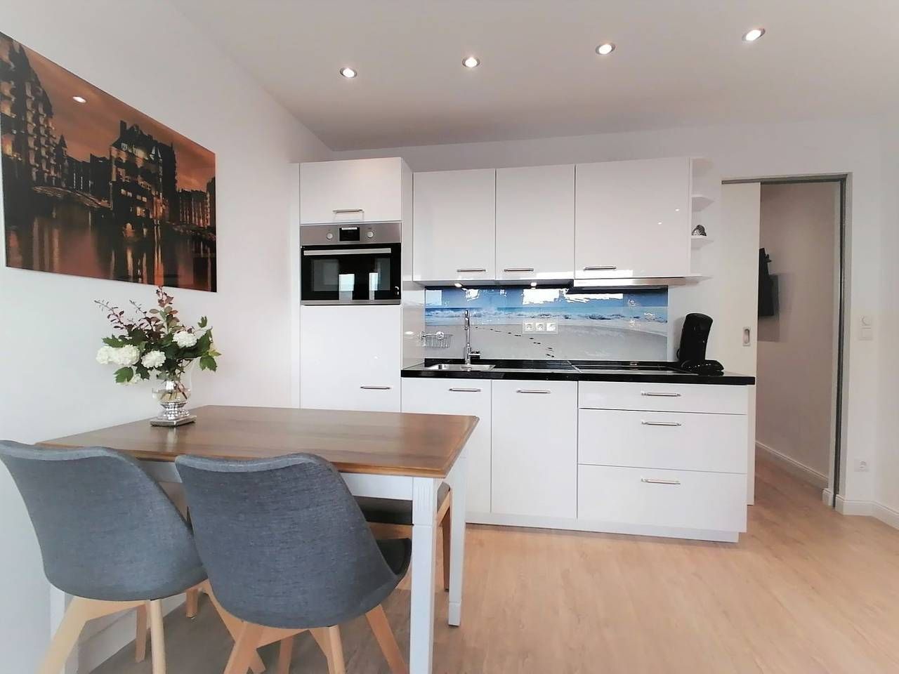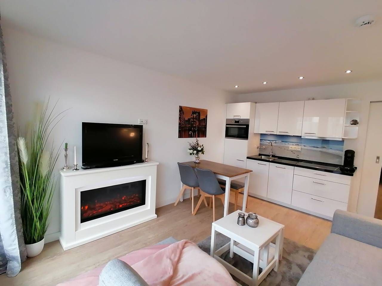 Hochwertig saniertes 2-Zimmer Appartement in zentraler und ruhiger Lage, nach Osten 25980 Westerland, Strandstr. 4, ca. 36 m², für 2 Personen. Entfernung zum Strand und Bahnhof ca. 300m. Die moderne Einrichtung besteht aus einem Wohn/Schlafraum ,Essbereich mit Ecksitzgarnitur , Smart TV, stillvollen Elektrokamin , hochwertigen Design Fußboden, Hamburger Fußleisten und integrierter vollausgestatteter Küche mit einer Granitarbeitsfläche. Das kuschelige Schlafzimmer verfügt über ein Boxspringbett (1,60 x2,00m), einem maßgebauten Kleiderschrank und einem Smart TV Das Bad überzeugt mit einer großen Dusche (1,40x 0,9m) , Glasschiebetür, großen Spiegel und großzügiger Granitablagefläche. Waschmaschine und Trockner sind im Haus.