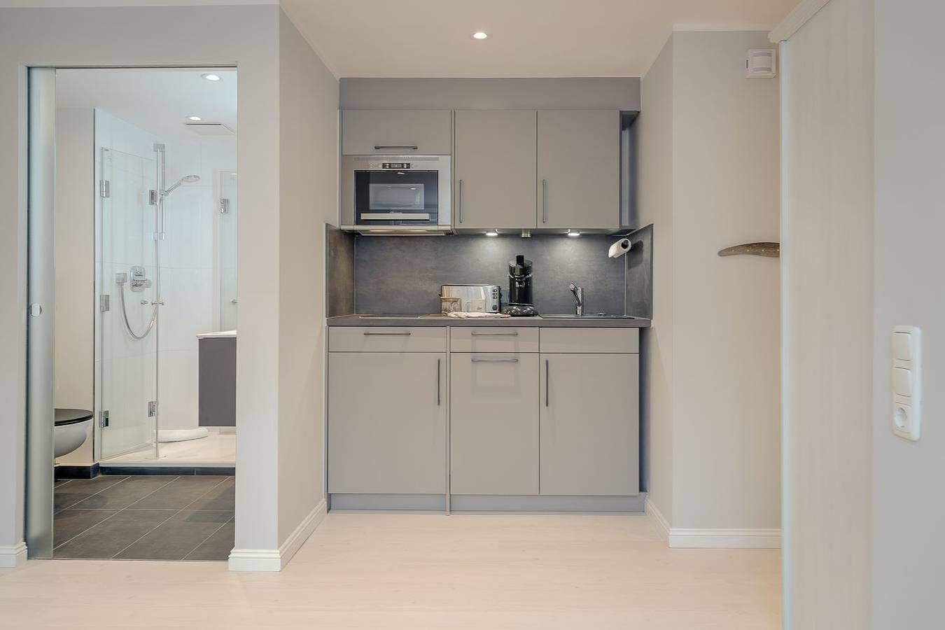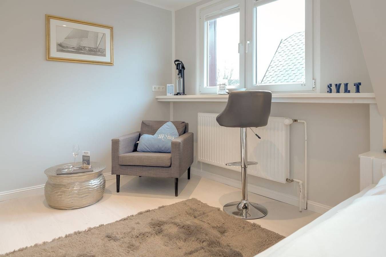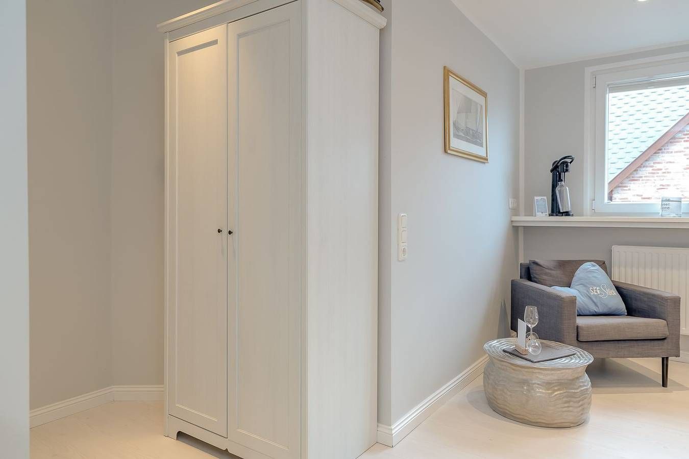 Um die Wohnung luftig und dennoch gemütlich zu gestalten wurde hier auf viel Weiß und als Kontrast dazu warmes Grau sowie clevere Stauraumlösungen gesetzt. Die passgenaue Küchenzeile fügt sich harmonisch in den Raum ein und kann es in puncto Ausstattung auch locker mit größeren Küchen aufnehmen. Gegessen wird mit Ausblick nach draußen direkt am Fenster. Ein gemütliches Bett und ein kleiner Sessel machen die Einrichtung komplett. Das Duschbad ist durch eine Schiebetür verbunden und auch hier sorgen Weiß und Grau für eine moderne Lässigkeit. Appartement Tom befindet sich unweit der Tinnumer Wiesen. Eine Bushaltestelle ist nur fünf Gehminuten und die Westerländer Innenstadt ca. 30 Gehminuten entfernt.