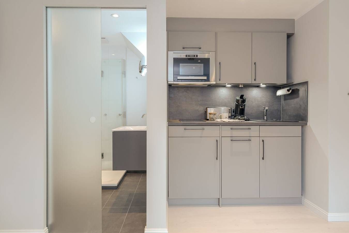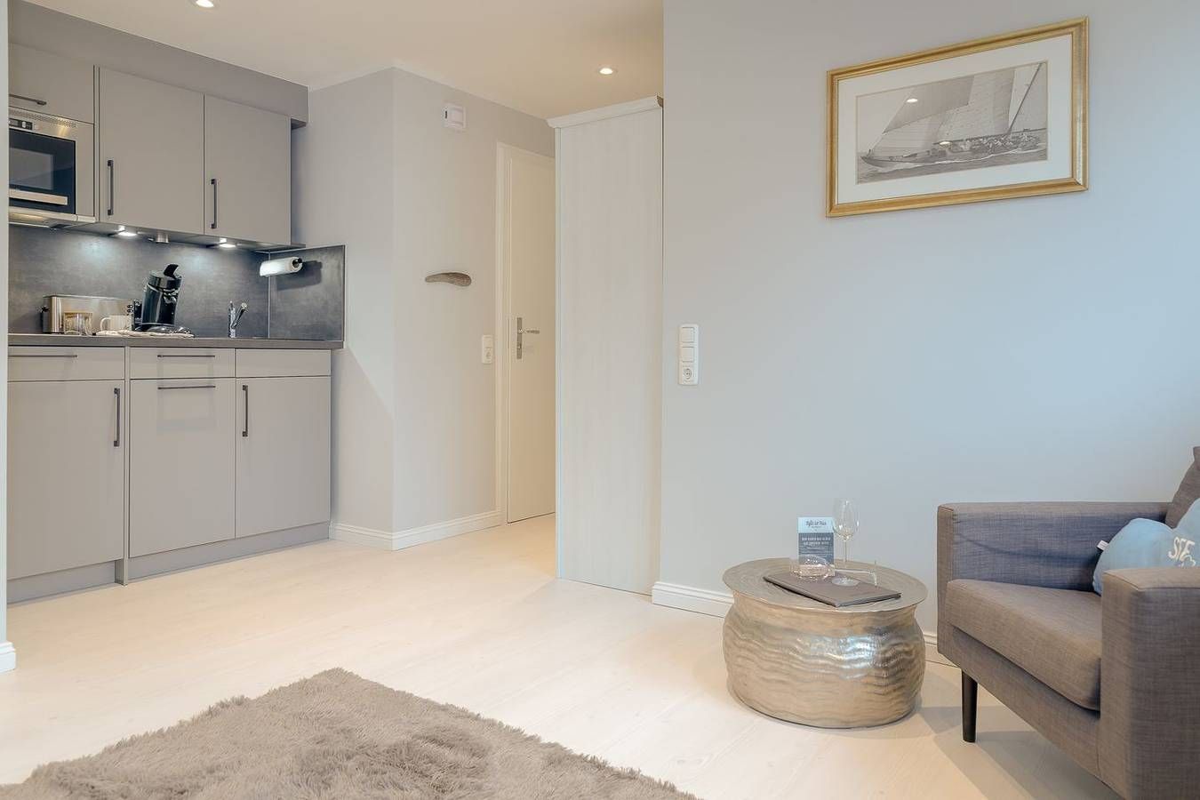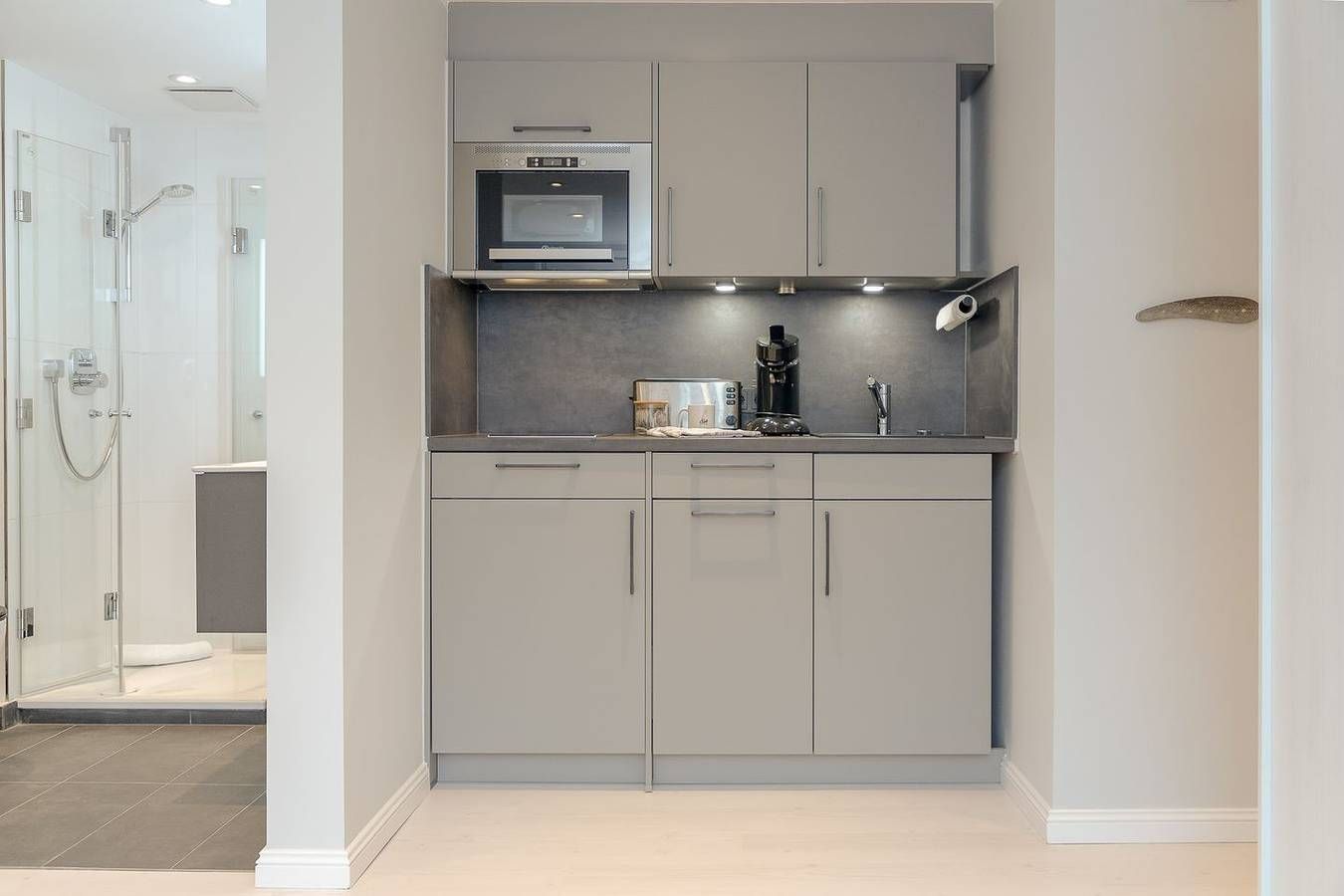 Um die Wohnung luftig und dennoch gemütlich zu gestalten wurde hier auf viel Weiß und als Kontrast dazu warmes Grau sowie clevere Stauraumlösungen gesetzt. Die passgenaue Küchenzeile fügt sich harmonisch in den Raum ein und kann es in puncto Ausstattung auch locker mit größeren Küchen aufnehmen. Gegessen wird mit Ausblick nach draußen direkt am Fenster. Ein gemütliches Bett und ein kleiner Sessel machen die Einrichtung komplett. Das Duschbad ist durch eine Schiebetür verbunden und auch hier sorgen Weiß und Grau für eine moderne Lässigkeit. Appartement Tom befindet sich unweit der Tinnumer Wiesen. Eine Bushaltestelle ist nur fünf Gehminuten und die Westerländer Innenstadt ca. 30 Gehminuten entfernt.
