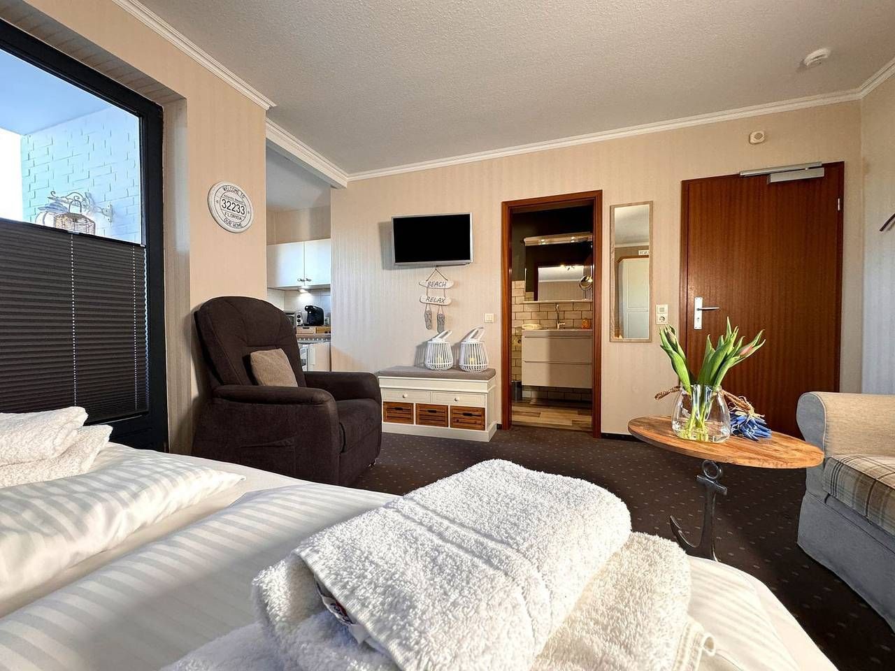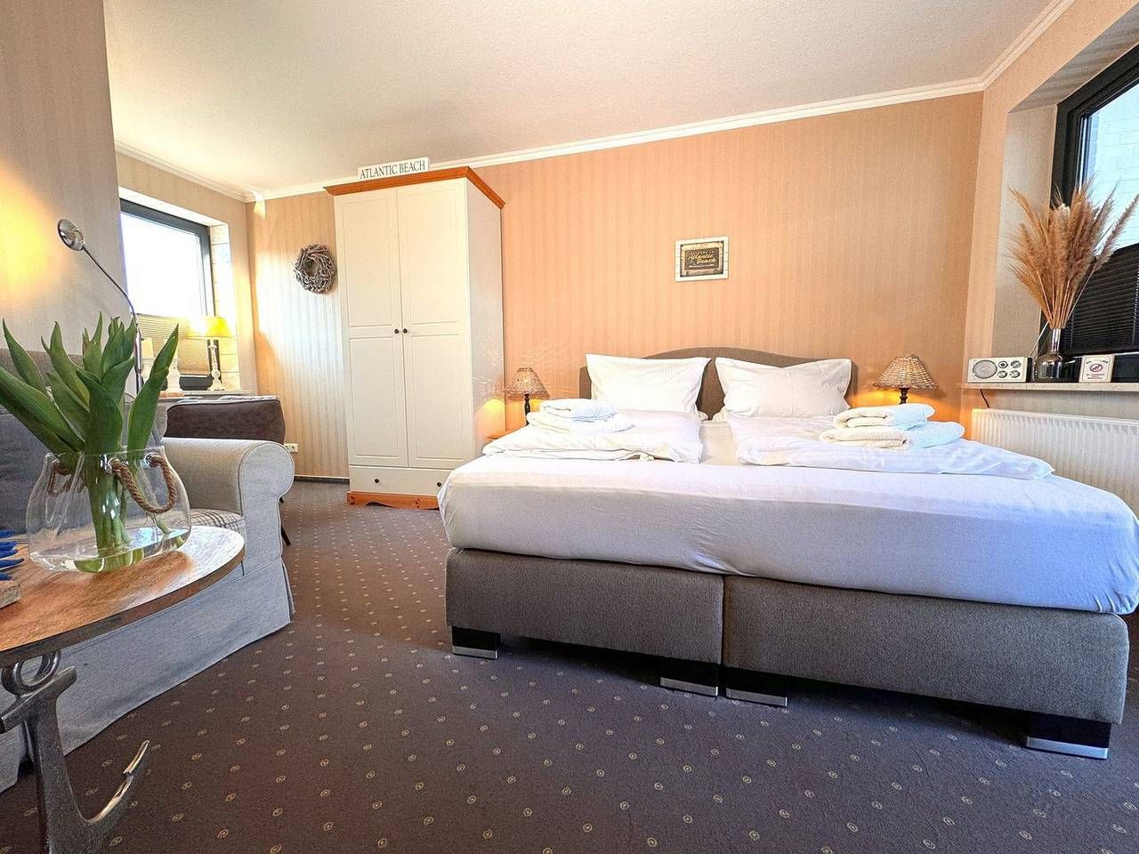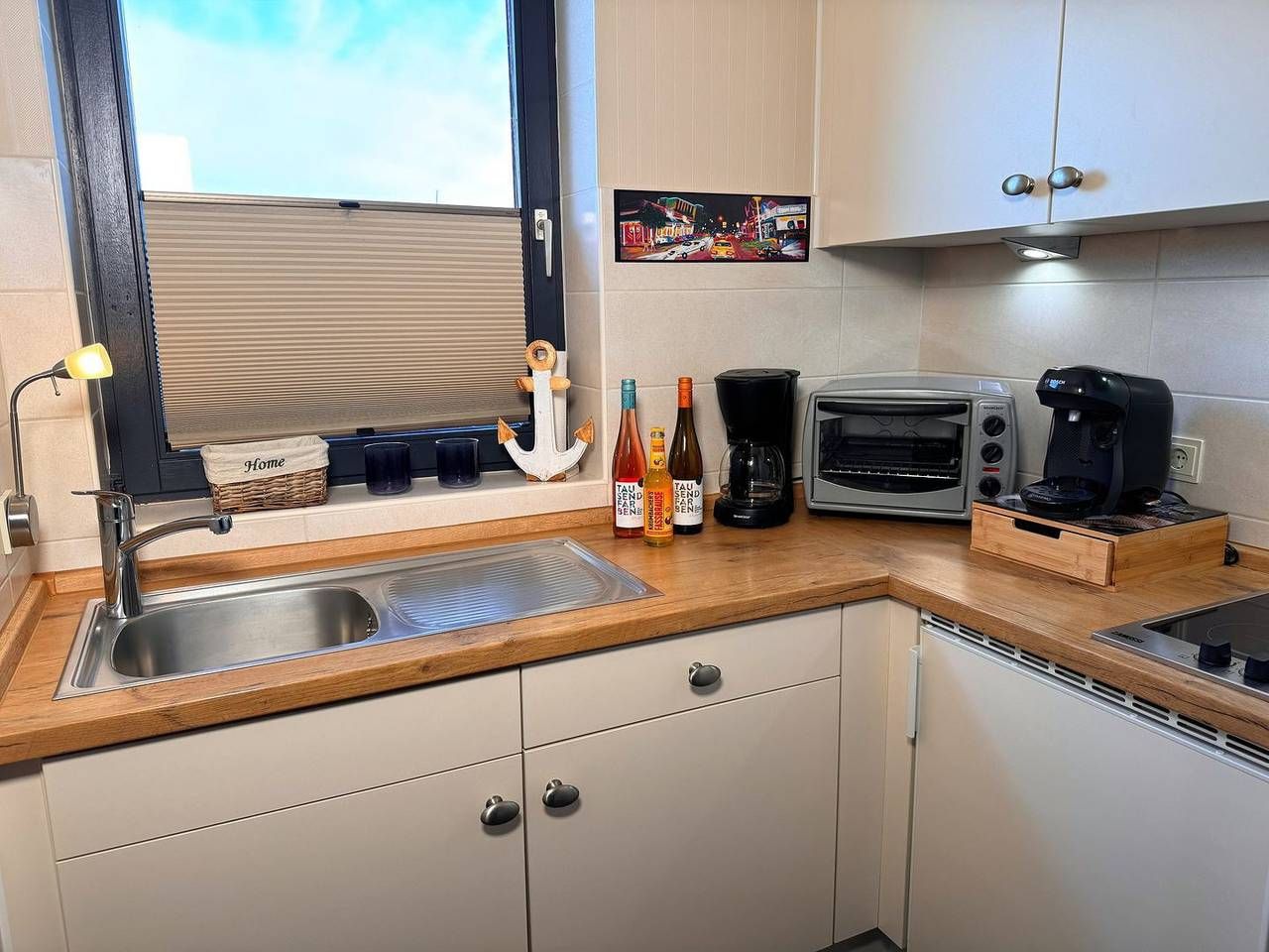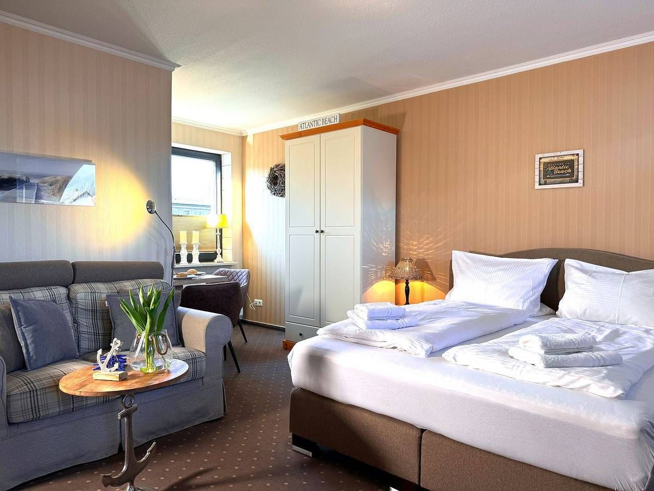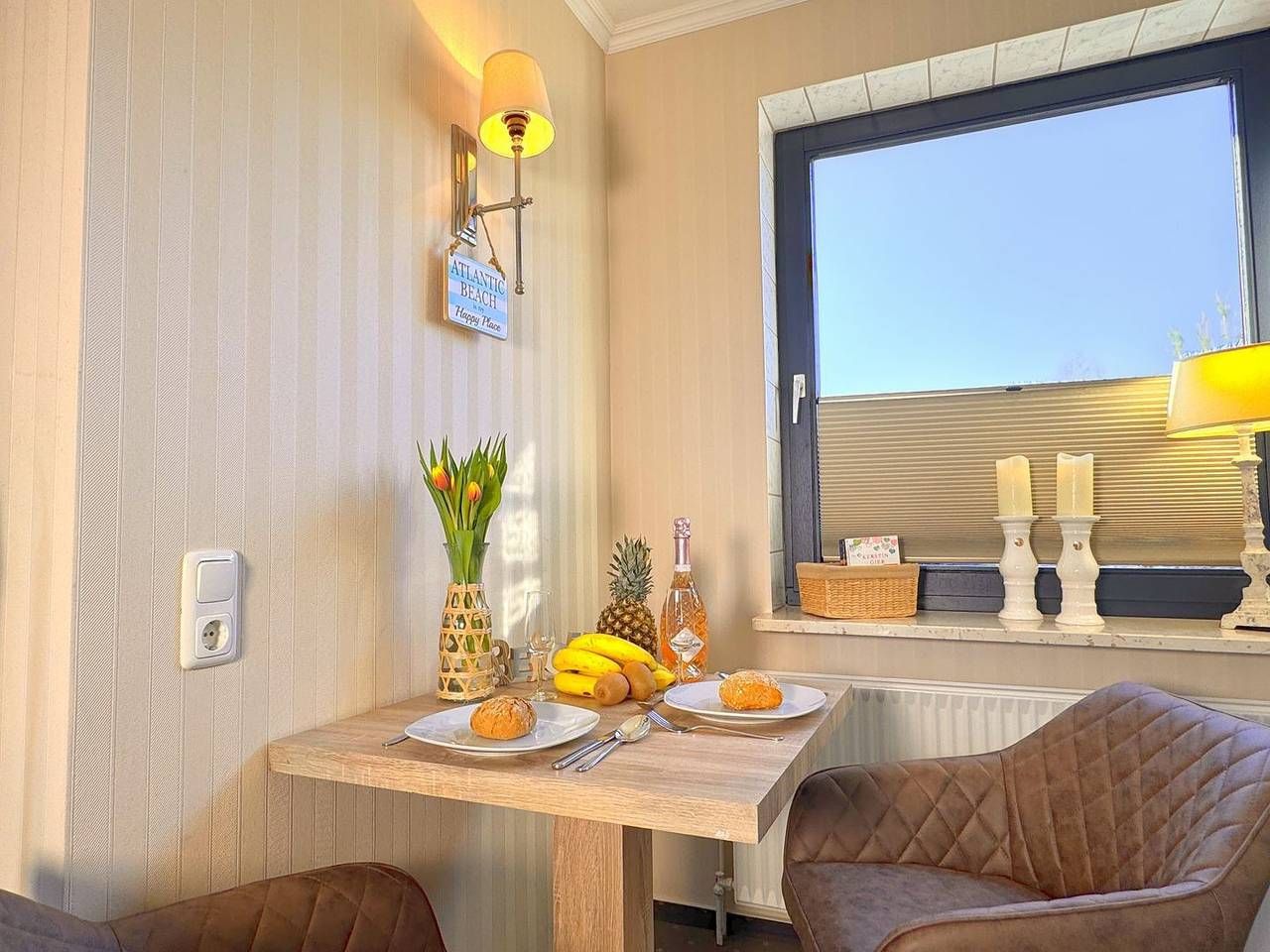 Unsere schöne 1-Zimmer-Ferienwohnung "Atlantic Beach" bietet Platz für 2 Personen. Sie ist 33m2 groß, besitzt ein eigenes, modernes Bad mit Föhn, eine voll ausgestattete Küche (ohne Backofen, aber mit einer Ninja...