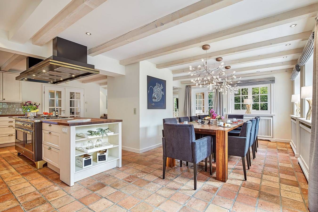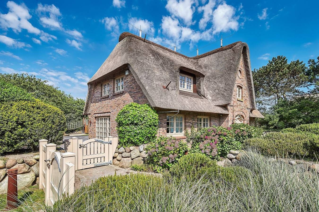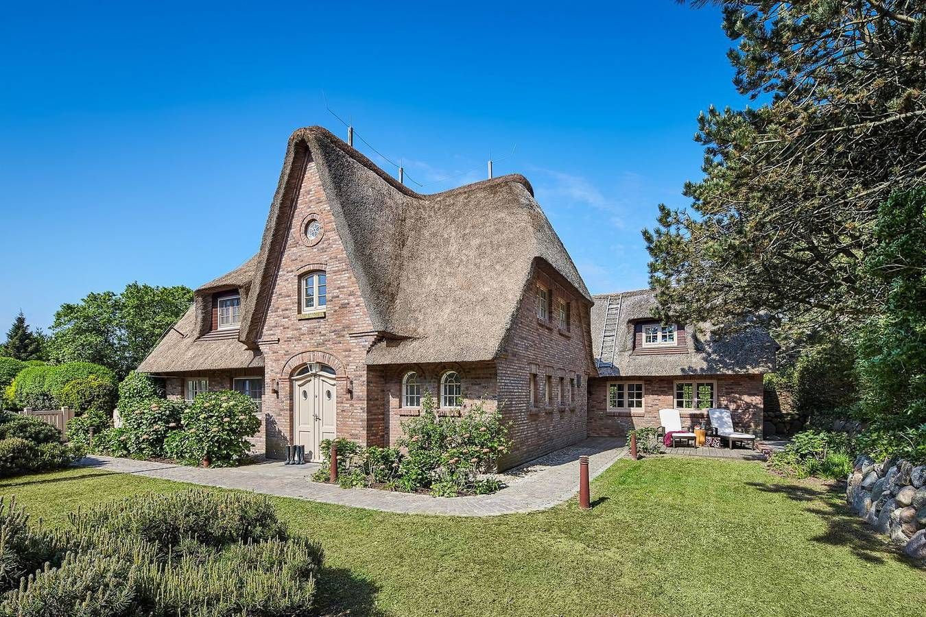 Diese Reetdachvilla befindet sich am Ortsrand von Braderup in wunderschöner wiesennaher Lage. Wer ein Feriendomizil für die ganze Familie sucht, hat hiermit sein Traumhaus gefunden. Das Erdgeschoss des Hauses empfängt Sie mit einem riesigen Wohnbereich mit zwei Sofaecken und einer offenen Küche mit angrenzendem Essbereich. Die Küche lässt mit Geschirrspüler und Gasherd keine Wünsche offen, sodass Sie sich unkompliziert Ihr Urlaubsdinner kochen können. Vom Wohnbereich aus erreichen Sie den liebevoll angelegten Garten mit mehreren möblierten Terrassen. Das Erdgeschoss bietet Ihnen außerdem ein Kinderschlafzimmer mit Doppelstockbett und eigenem Badezimmer. Zusätzlich verfügt diese Etage über ein Gäste-WC. Im Obergeschoss des Hauses finden Sie ein großes, sehr gemütlich eingerichtetes Schlafzimmer mit Doppelbett und großem En Suite Badezimmer mit Dusche, WC und Badewanne, in der es sich wunderbar relaxen lässt. Außerdem befindet sich hier ein weiterer Schlafraum mit zwei Einzelbetten und Duschbad und ein Kinderparadies mit Doppelstockbett zum Träumen. Ein weiteres Highlight des Hauses wartet im Untergeschoss auf Sie: Entspannen Sie in Ihrem privaten Wellnessbereich mit freistehender Badewanne, Sauna, Regendusche, beheizbaren Sitzbänken und WC. Außerdem befinden sich im Untergeschoss ein weiterer Raum mit Doppelbett und angrenzendem Badezimmer und ein Raum mit Einzelbett. Einen Parkplatz finden Sie direkt am Haus. Es handelt sich um ein Nichtraucher-Haus , in dem Haustiere herzlich willkommen sind. Wir freuen uns auf Ihre Anfrage! Ausstattung: EG: Großer Wohnbereich mit 2 Sofaecken, Flatscreen-TV, offene Küche mit angrenzendem Essbereich, Geschirrspüler, Gasherd. Gäste-WC, Kinderschlafzimmer mit Doppelstockbett und eigenem Badezimmer. Umlaufender Garten mit mehreren möblierten Terrassen. UG: Großer Raum mit Doppelbett und angrenzendem Badezimmer, von diesem Raum erreichen Sie einen weiteren Raum mit Einzelbett. Riesiger Wellnessbereich mit freistehender Badewanne, Sauna, Regendusche, beheizbaren Sitzbänken und WC. OG: Schlafzimmer mit Doppelbett und En Suite Bad mit Badewanne, Dusche und WC, ein Schlafzimmer mit Doppelstockbett, ein Schlafzimmer mit 2 Einzelbetten, zusätzliches Duschbad. Bitte beachten Sie: Das Domizil ist maximal für 6 Erwachsene und 4 Kinder buchbar. Nichtraucher Sämtliches Bildmaterial dieses Objektes wurde von Marco Richter Photography erstellt. www.marcorichterphotography.com