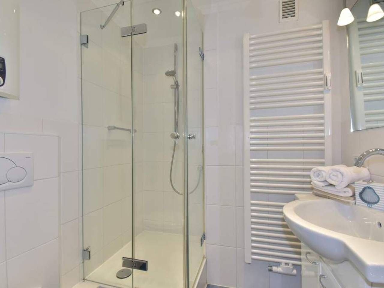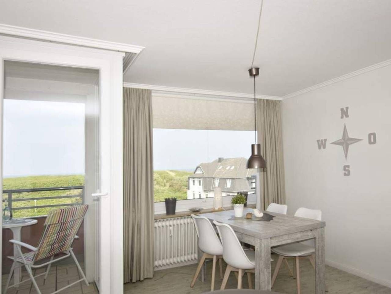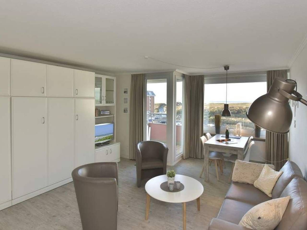 Schöne Meerblick-Ferienwohnung! Geschmackvoll eingerichtete 2-Zimmer-Nichtraucher-Ferienwohnung, ca. 44 qm, in der 4. Etage zur Westseite für max. 4 Personen mit Westbalkon und Meerblick (Nachmittagssonne, mit Balkonmöbeln und Auflagen). Vom Vorflur mit Garderobe gelangt man in das Wohnzimmer (mit Austritt zum Balkon), das Schlafzimmer und in das Duschbad/WC. Der Wohnraum besteht aus einer Sitzecke (Zweisitzer-Couch, 2 Sessel), einem Doppelschrankbett, einem Essplatz und Kabel-TV. Die Küche hat einen Geschirrspüler, einen Herd mit Backofen und Ceranfeld (4 Kochfelder), und einen Kühlschrank mit 3-Sterne-Gefrierfach. Kaffeemaschine (Filter), Wasserkocher und Toaster gehören zur Grundausstattung. Das neue Schlafzimmer ist mit einem Boxspringbett in Komfortliegehöhe (Liegefläche 1,60 x 2 m, mit 2 guten Einzelmatratzen mit Topper) ausgestattet. Im Bad befinden sich eine Dusche, ein WC, ein Waschtisch und ein Handtuchtrockner. Ein PKW-Außenstellplatz am Haus ist inklusive. Im Haus befindet sich ein kostenloses W-Lan-Netz, das für alle Appartements zugänglich ist.