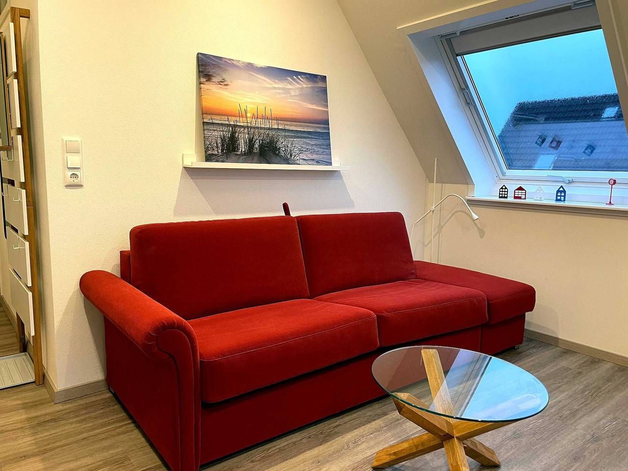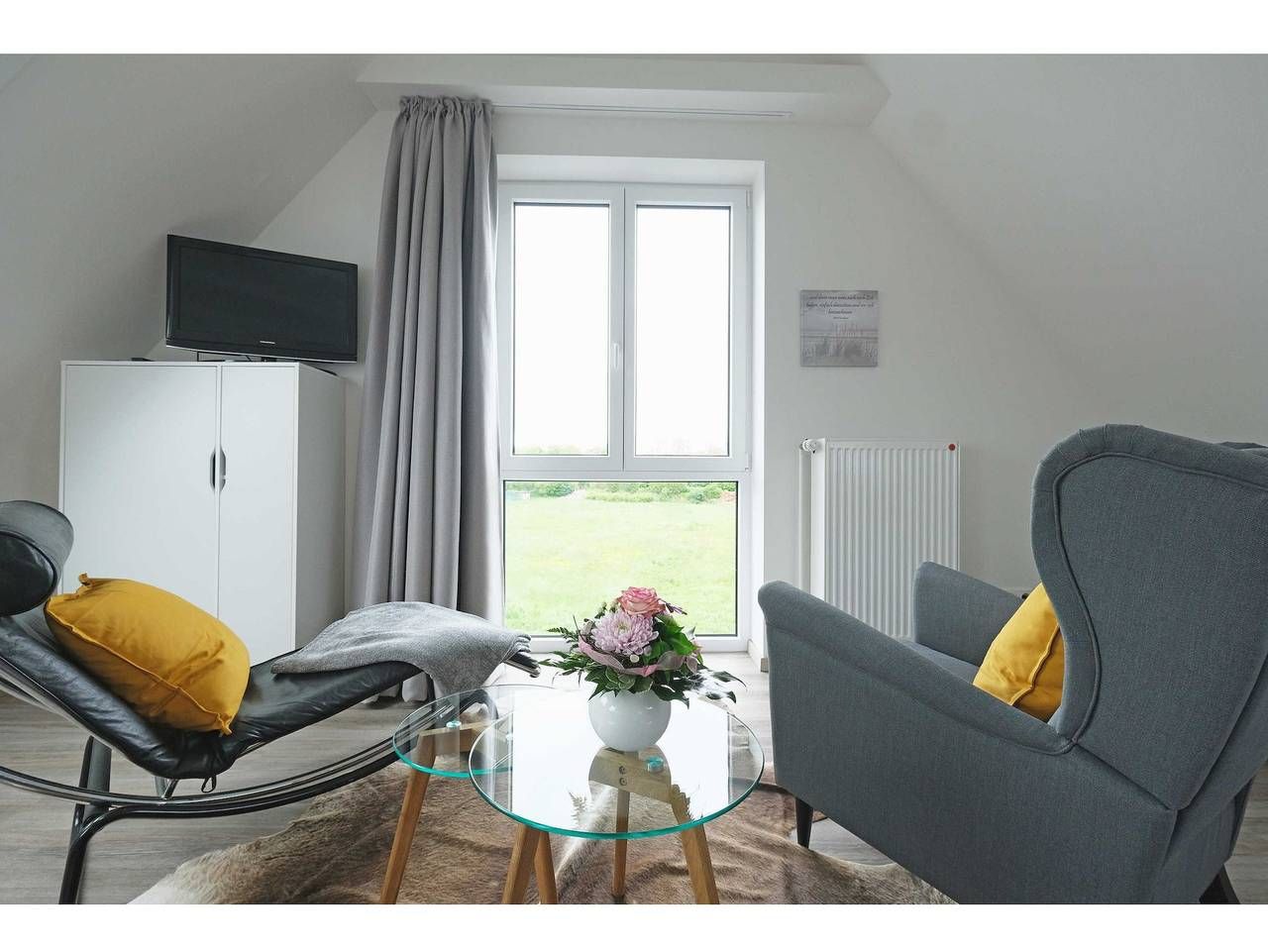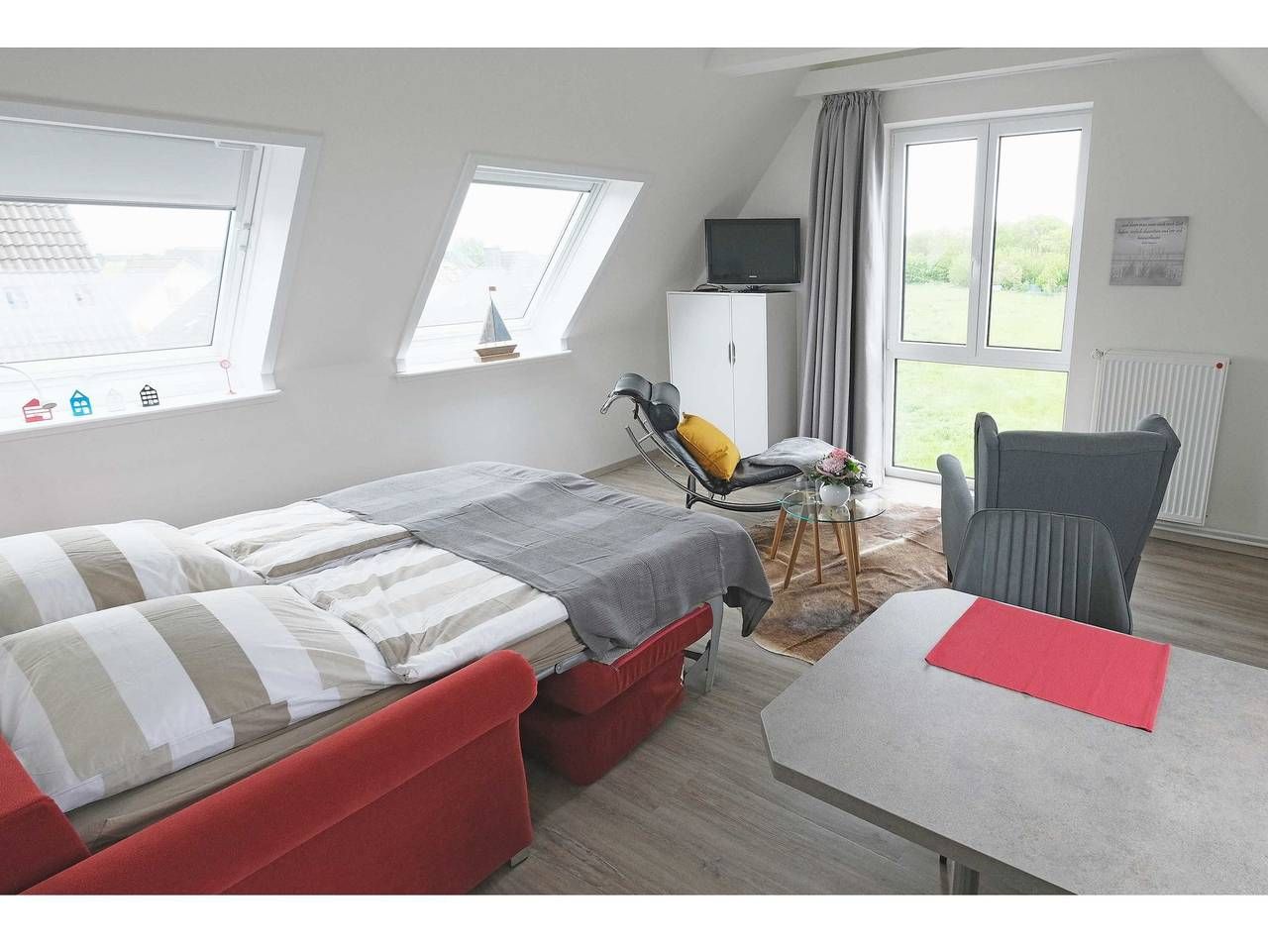 Einraum-Wohnung im 2. OG für 2 Personen. Die Wohnung wurde komplett renoviert und neu ausgestattet. Kombinierter Wohn-Schlafraum. Die bequeme Couch verfügt über eine Schlaffunktion. Ein gemütlicher Sessel und ein Relaxchair geben dem Raum eine wohlige Atmosphäre. Blick durch das große Fenster entspannt in's Grüne. Flachbildfernseher. Der Essplatz ist an die moderne Küchenzeile angebunden.