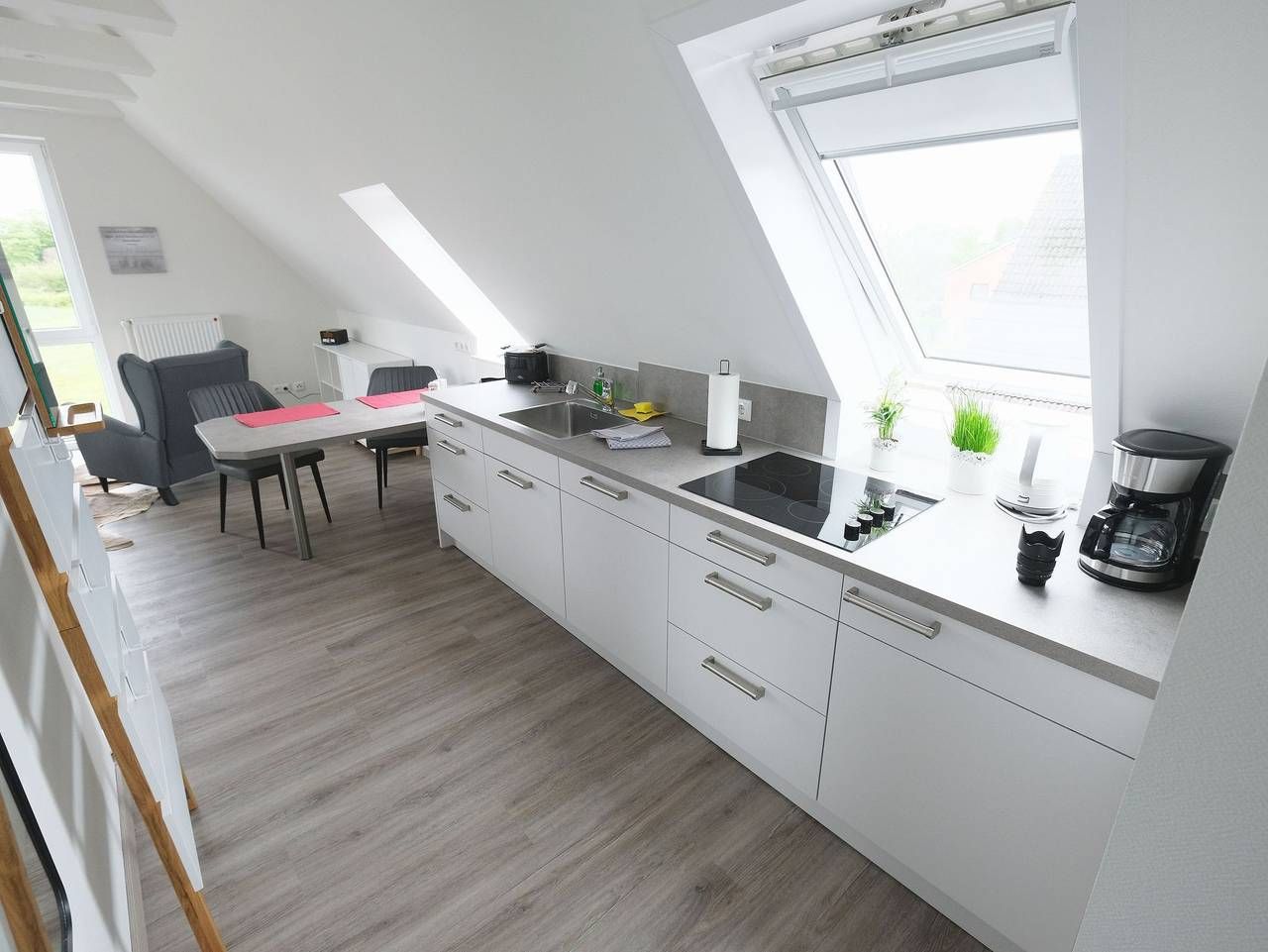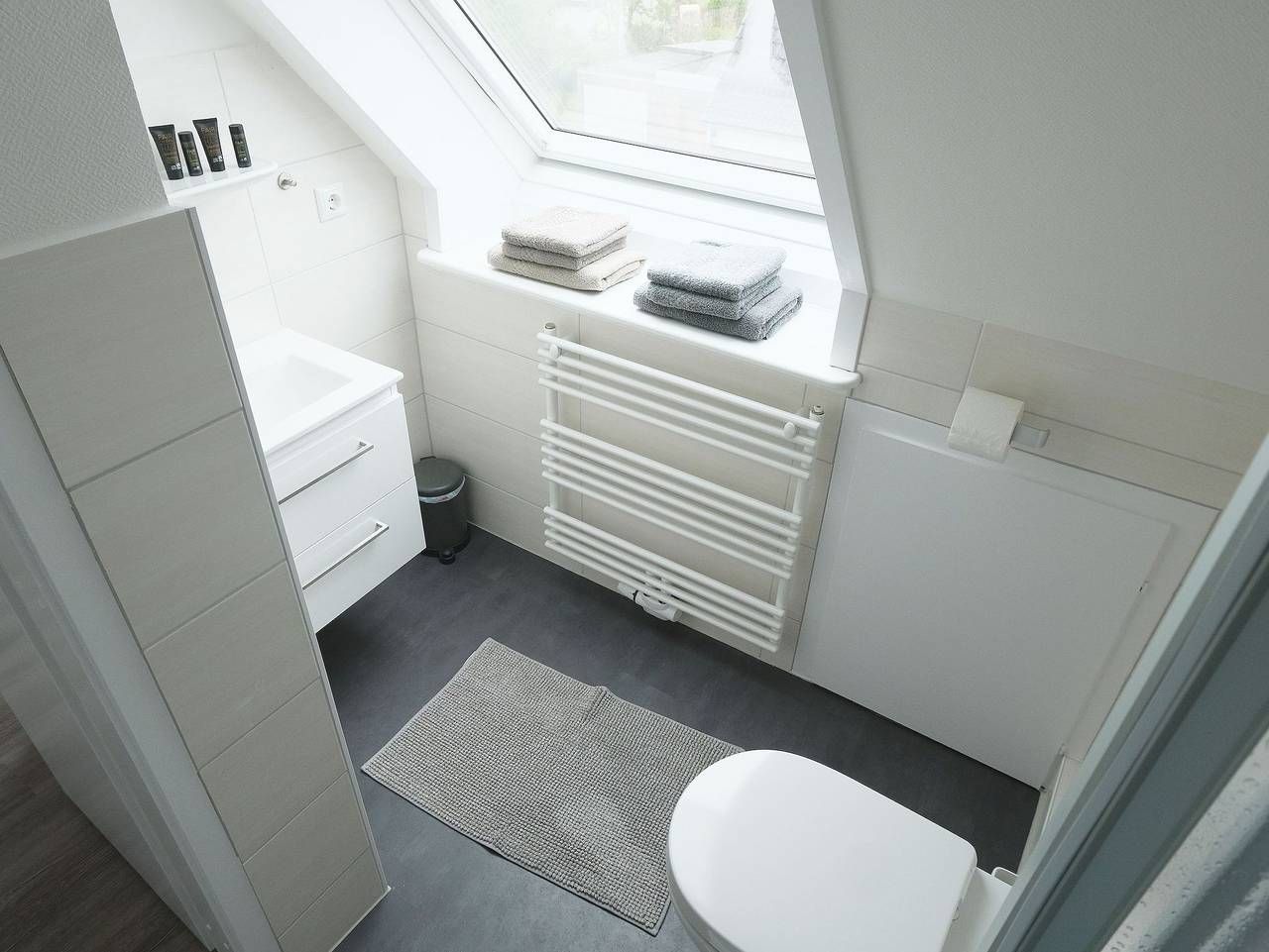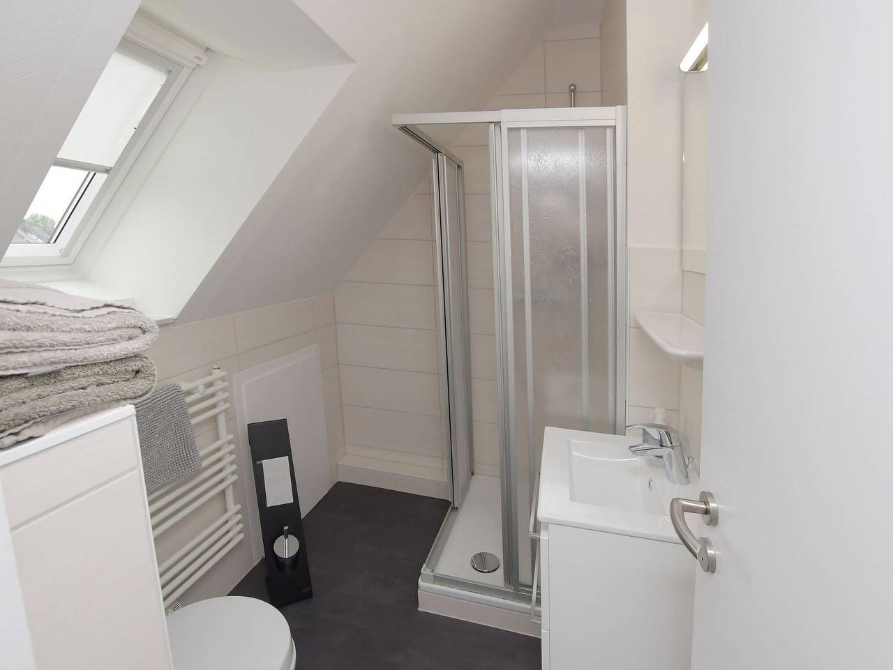 Auf Anfrage kann für Besorgungen ein vorhandenes einfaches Fahrrad benutzt werden. Für eigene Fahrräder steht auf Anfrage und nach Verfügbarkeit ein offener Fahrradunterstand zur Verfügung. Die Grill- und Feuerstelle im Garten steht allen Bewohnern zur Verfügung. Die neue Küchenzeile ist mit Ceranfeld (4-Kochstellen), Kühlschrank mit Gefrierfach, Geschirrspüler, Toaster, Kaffeemaschine, Wasserkocher und reichhaltig Geschirr ausgestattet. Babyreisebett und Hochstuhl auf Anfrage. Helles Duschbad/WC mit Tageslicht. Die Treppe vom 1. zum 2. OG ist steiler als üblich. Die beiden Wohnungen im DG nutzen gemeinsam eine überdachte Terrasse im Garten.