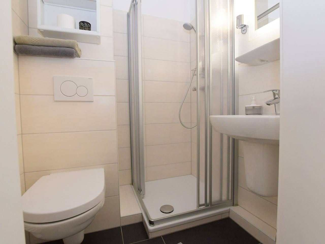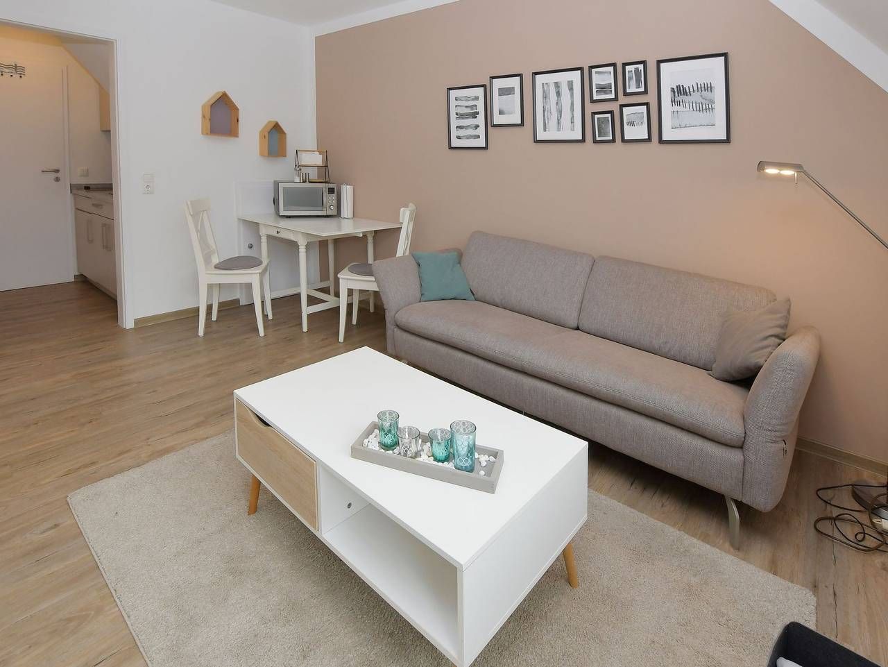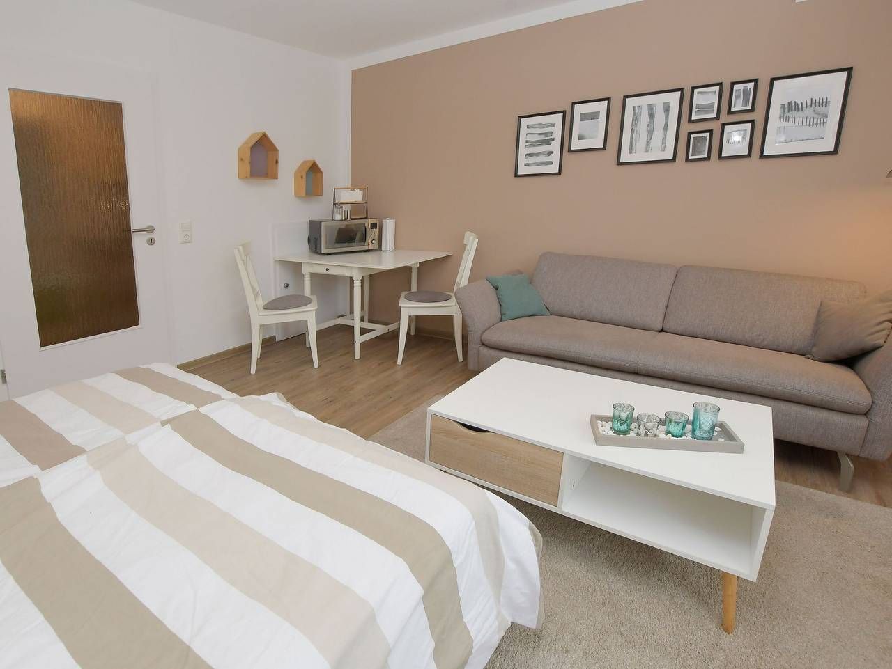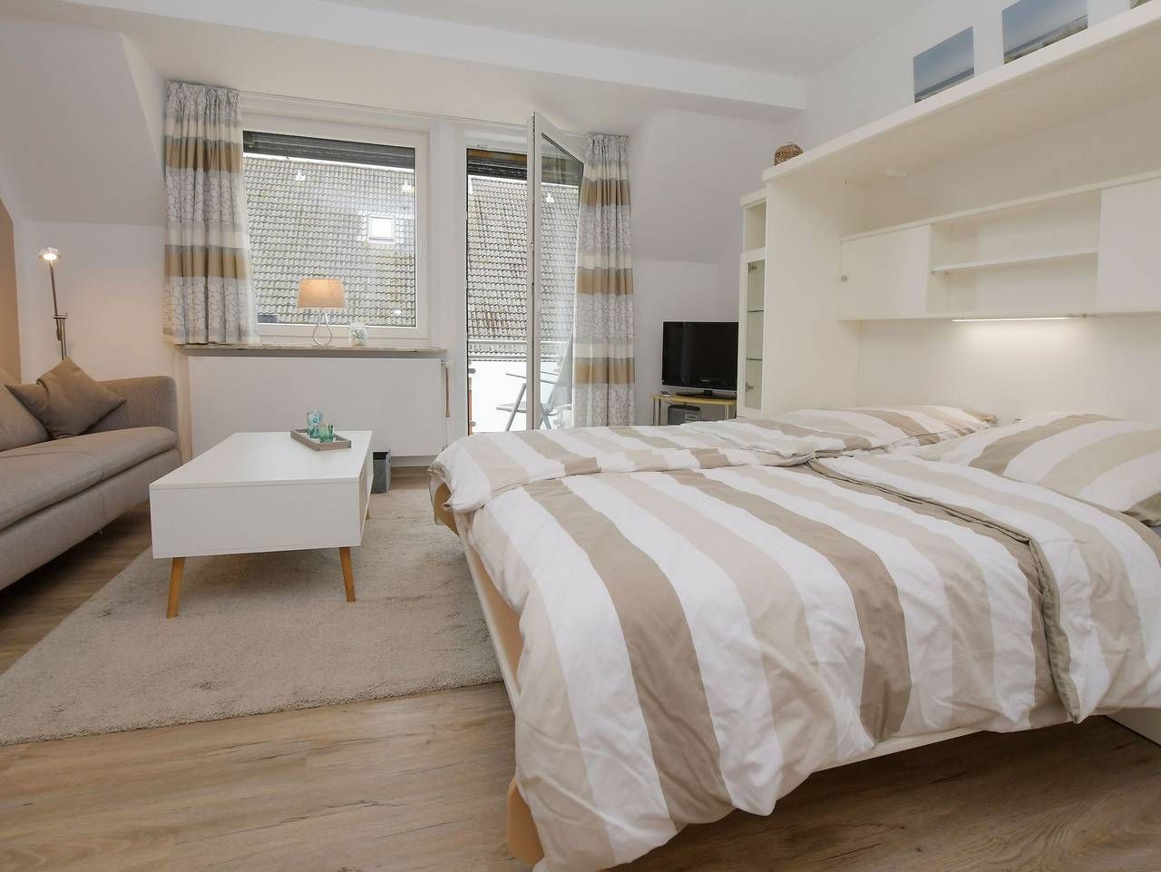 In sehr ruhiger und doch zentraler Wohngegend liegt dieses zweigeschossige Wohnhaus mit 5 Komfort-Ferienwohnungen. Genießen Sie Ihren Urlaub in familiärer Wohlfühl-Atmosphäre in der ersten und zweiten Etage des Hauses. Zum Zentrum sind es ca. 700 m und zum Wellenbad Meerzeit, Hauptstrand und Hafen ca. 10-15 Gehminuten. Auf Anfrage kann für Besorgungen und Ausflüge ein hauseigenes Fahrrad genutzt werden. Für eigene Fahrräder steht ein offener Fahradunterstand zur Verfügung. Für E-Bikes kann die geschlossene Garage zum Abstellen und Aufladen genutzt werden. Elektroautos können über die hauseigene Wallbox gegen Gebühr geladen werden. Die Grill- und Feuerstelle im Garten steht allen Bewohnern zur Verfügung und bietet die Möglichkeit für gemeinschaftliche Abende.. Das Haus liegt im Dreieck zwischen den Stränden, der Familienlagune und dem Ortskern, wo die bunte Fußgängerzone mit kleinen Geschäften, Cafès, Kneipen und Restaurants zum verweilen einlädt. Unsere ruhige und dennoch zentrale Lage lässt Sie fußläufig alles in 10 bis 15 Minuten erreichen. Sehr gemütliche Einraum-Wohnung mit Balkon im 1. OG für 2 Personen. • Kombinierter Wohn-Schlafraum mit Appartementwand, in die Betten mit Gesundheitsmatratzen integriert sind (1,60 x 2,00 m). Sie verfügt über viel Stauraum. Auf der Couch machen Sie es sich gemütlich. Flachbildfernseher. Der Fußboden ist mit Vinyl ausgelegt. Lose liegende Teppiche können aus Wunsch entfernt werden. • Die separate Küche ist mit 2-Platten-Cerahnkochfeld, Kühlschrank, Toaster, Kaffeemaschine, Wasserkocher und reichhaltig Geschirr ausgestattet. • Duschbad/WC. • Betten sind bezogen, Hand- und Duschtücher werden in Grundausstattung gestellt. • Der Südbalkon ist möbliert und mit Markise versehen. Kurabgabe