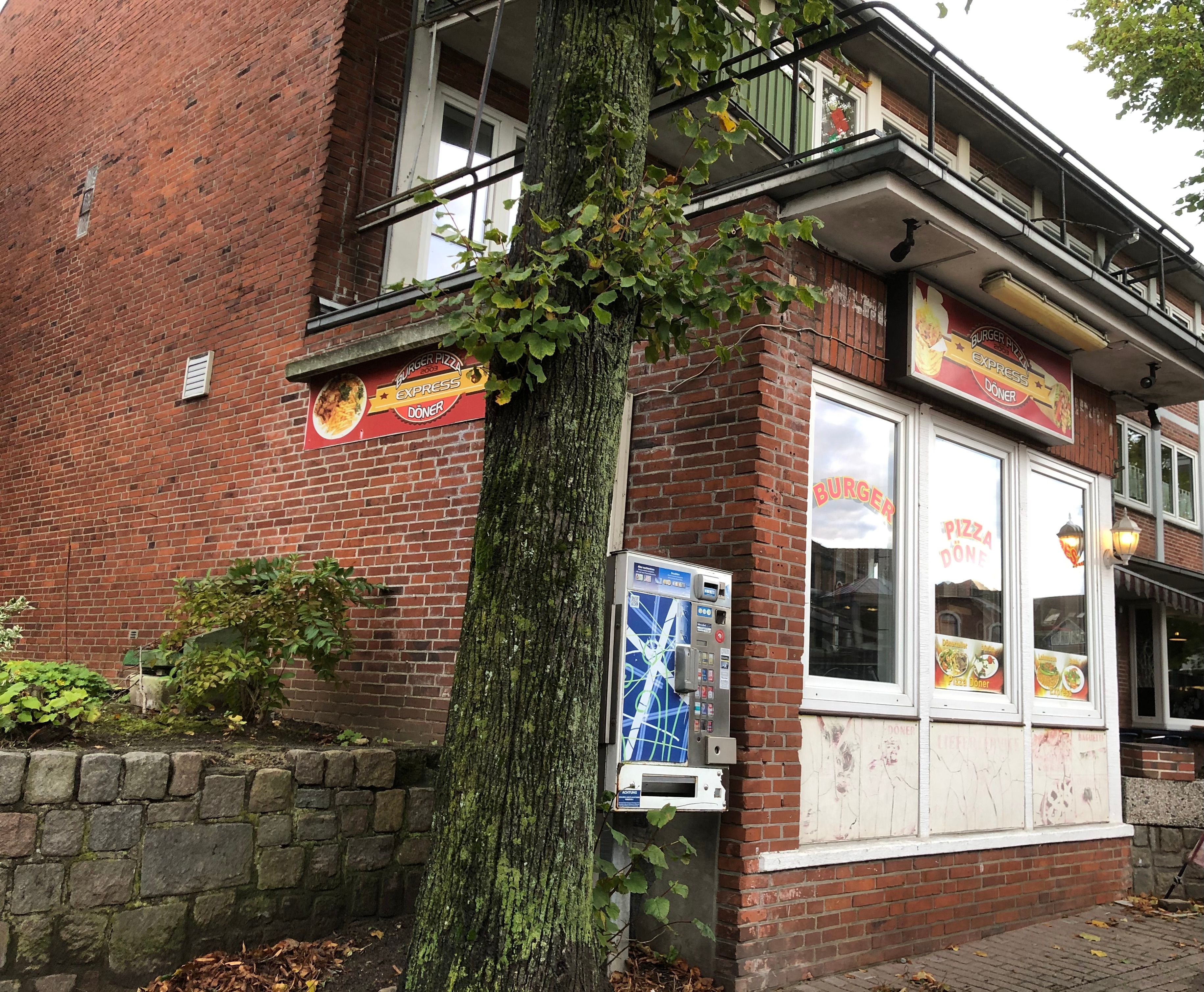 Im Burger Pizza Express gibt es verschiedene Speisen und Getränke - von Pizza über Burger bis hin zu Döner. Es sind Sitzmöglichkeiten vorhanden.