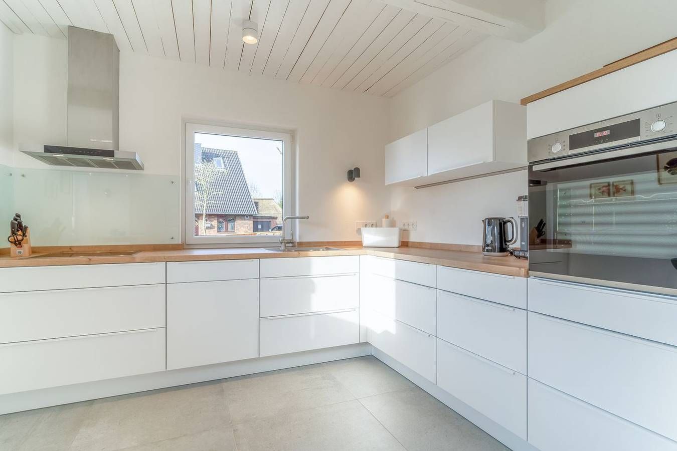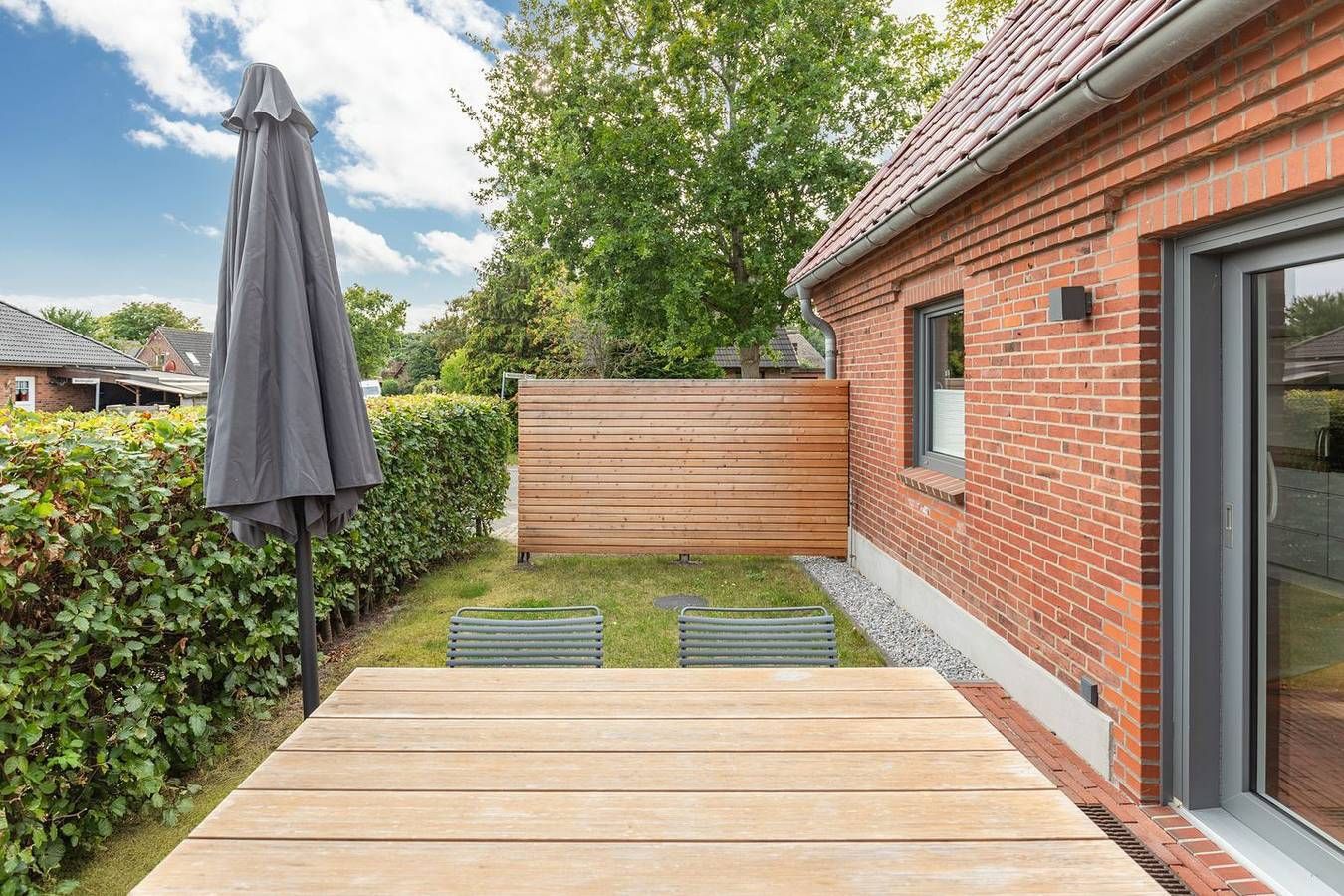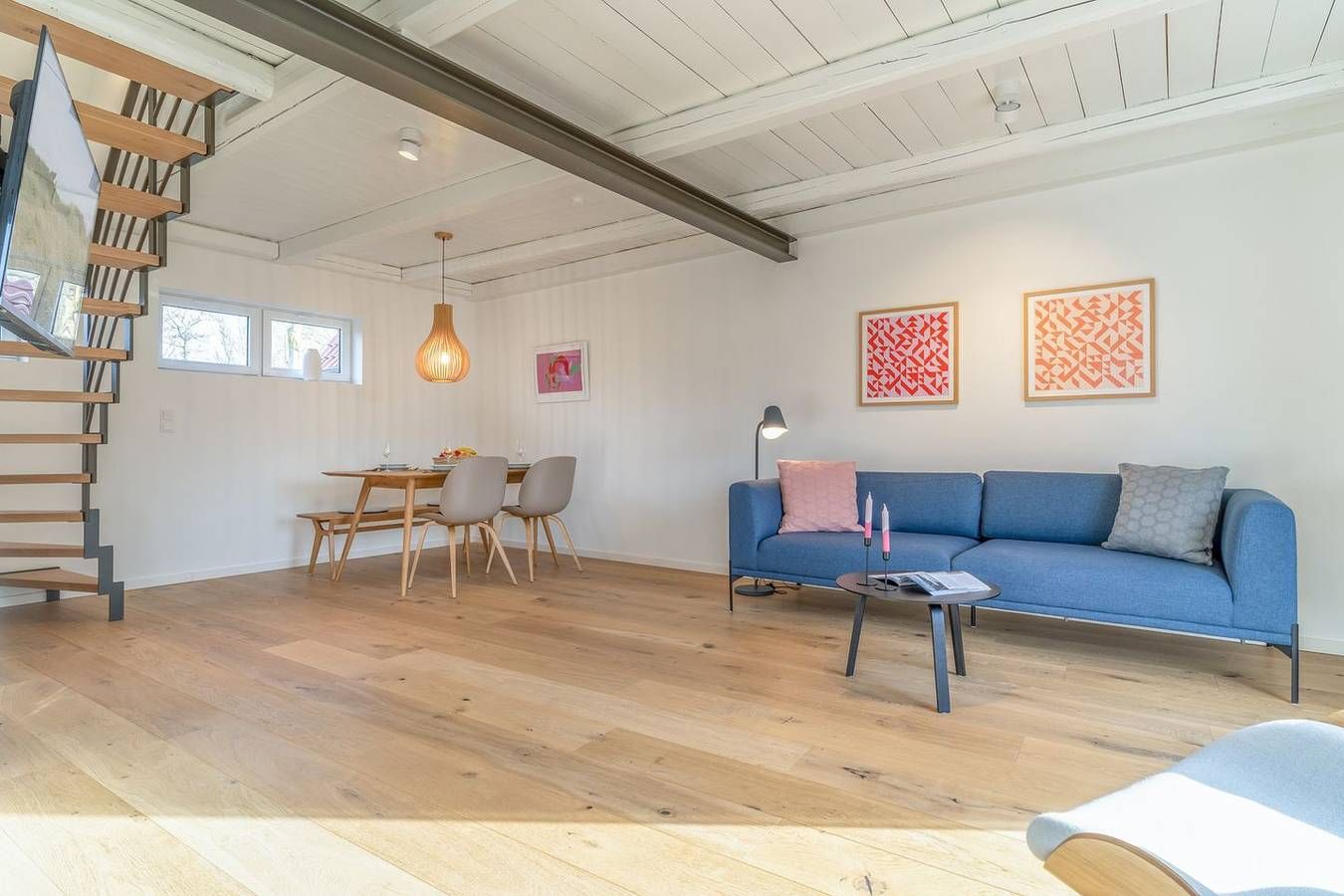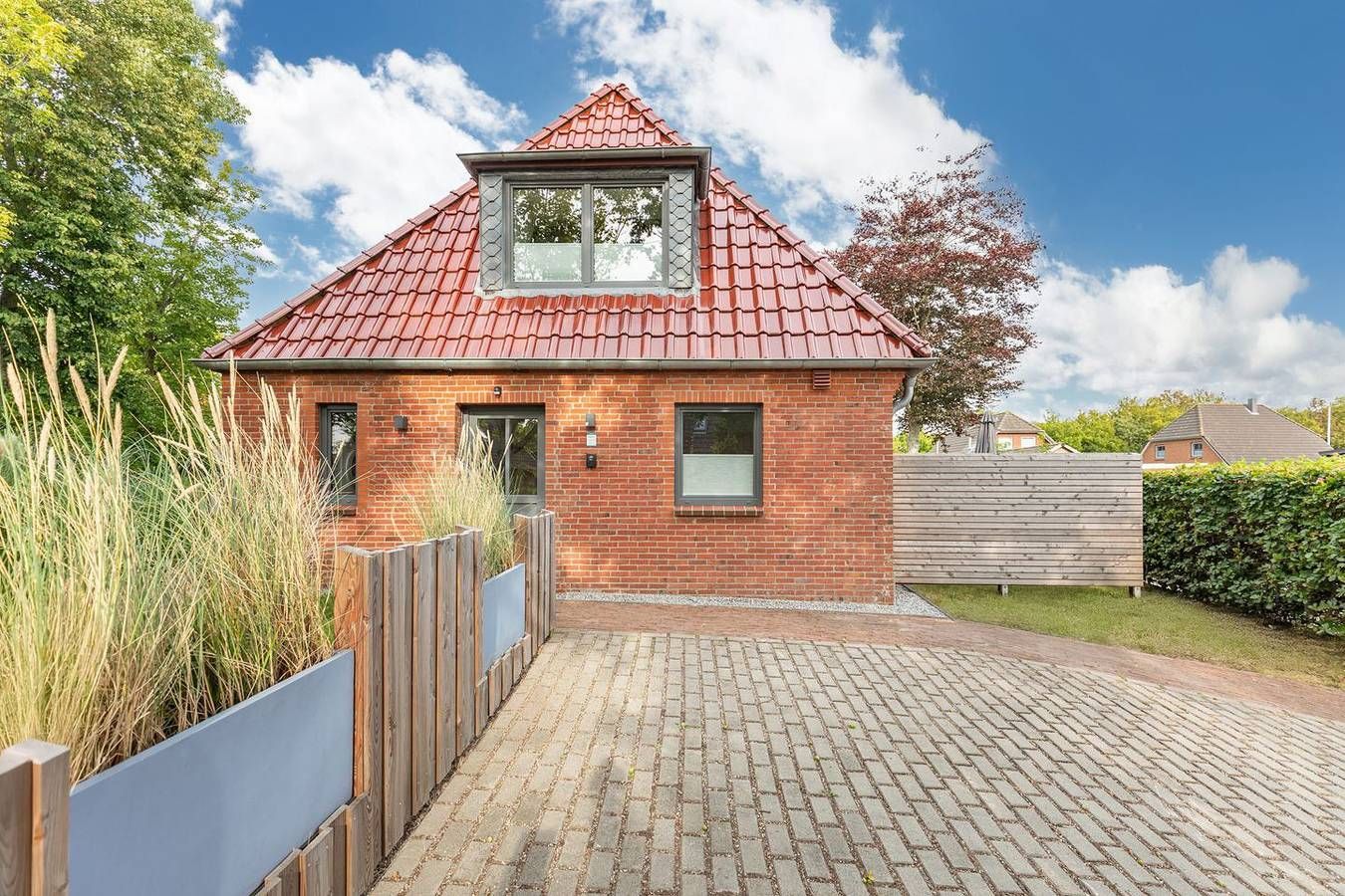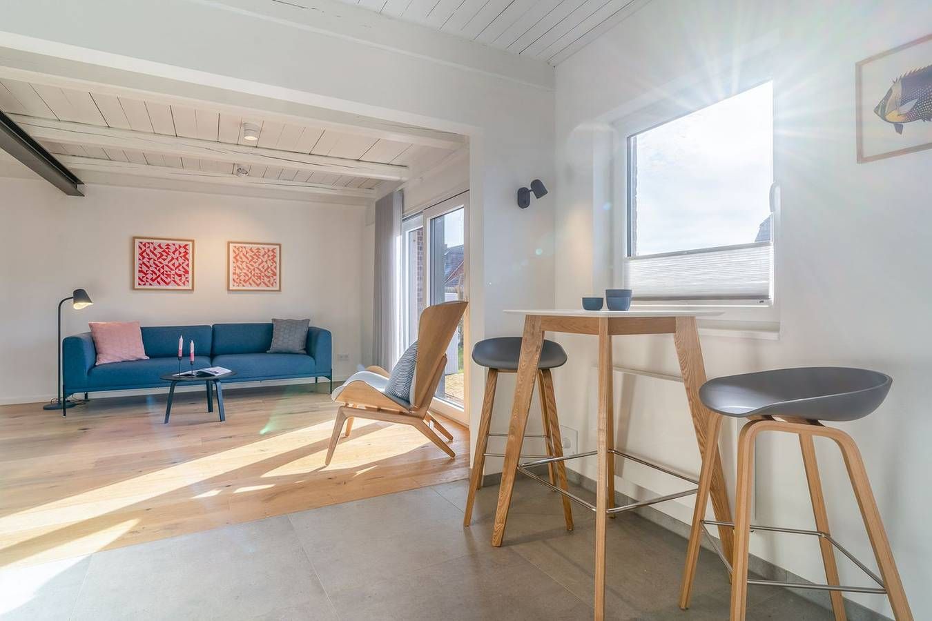 Vor den Toren von St. Peter-Ording liegt diese moderne und exklusive Doppelhaushälfte in ruhiger Lage für bis zu 4 Personen. Die Lage Die charmante Doppelhaushälfte befindet sich im idyllischen Tating, einem Ort, der durch seine ländliche Prägung und ruhige Atmosphäre besticht. Nur acht Autominuten trennen Sie von den ausgedehnten Sandstränden von St. Peter-Ording, einem Paradies für Sonnenanbeter und Wassersportler. Im Dorf selbst sind kleine Geschäfte, gemütliche Bäckereien und einladende Restaurants bequem zu Fuß zu erreichen. Alles Nötige für den täglichen Bedarf ist somit in unmittelbarer Nähe verfügbar. Für die sportlichen Aktiven bietet Tating Tennisplätze, einen Fahrradverleih sowie einen Golfplatz, die alle nur einen kurzen Spaziergang entfernt liegen. Diese Doppelhaushälfte ist somit der ideale Ausgangspunkt für einen entspannten und aktiven Urlaub an der Nordseeküste. Ausstattung Die stilvoll eingerichtete Doppelhaushälfte bietet auf knapp 90 qm auf zwei Ebenen Platz für bis zu 4 Personen. Im Wohnbereich können Sie sich auf dem großen Sofa und den gemütlichen Sesseln bei einem Film entspannen. TV und Internet stehen kostenlos zur Verfügung. Der große Esstisch lädt zu einem gemeinsamen Familienessen oder einem ausgiebigen Urlaubsfrühstück ein. Die moderne, offene Küche ist bestens ausgestattet, sodass die ganze Familie problemlos versorgt werden kann. Ein Duschbad im Erdgeschoss und ein Hauswirtschaftsraum mit Waschmaschine und Trockner runden das Bild ab. Über eine schöne Holztreppe gelangt man ins Obergeschoss mit zwei Schlafzimmern, die mit komfortablen Boxspringbetten (160x200) ausgestattet sind. Das moderne, lichtdurchflutete Duschbad im Obergeschoss besticht durch eine bodengleiche Dusche und Handtuchwärmer. Die moderne, hochwertige und minimalistisch gehaltene Einrichtung wurde geschickt mit skandinavischen Designermöbeln, natürlichen Materialien und Farben kombiniert. Typisch nordisch sind die erhaltenen Holzbalken im Deckenbereich. Es erwarten Sie großzügige Räume zum Wohlfühlen! Bei schönem Wetter lädt die Südterrasse mit Gartenmöbeln zum gemeinsamen Essen und Sonnenbaden im eigenen kleinen Garten ein. Besonderheiten Das familienfreundliche Nichtraucherhaus eignet sich besonders für Familien oder befreundete Paare. Ihr Vierbeiner (wadenhoch) ist bei uns herzlich willkommen. Gerne stellen wir unseren Gästen kostenloses WLAN zur Verfügung. Ihr Auto können Sie bequem auf einem Parkplatz vor dem Haus abstellen. Für Ihre Fahrräder steht Ihnen ein abschließbarer Schuppen zur Verfügung, in dem auch E-Bikes aufgeladen werden können. Das Ferienhaus wird durch eine Fußbodenheizung angenehm beheizt. Eine Erstausstattung an Bettwäsche und Handtüchern ist bei dieser Unterkunft obligatorisch und bereits im Endpreis enthalten. Zusätzliche Wäschepakete können in den optionalen Leistungen hinzugebucht werden.