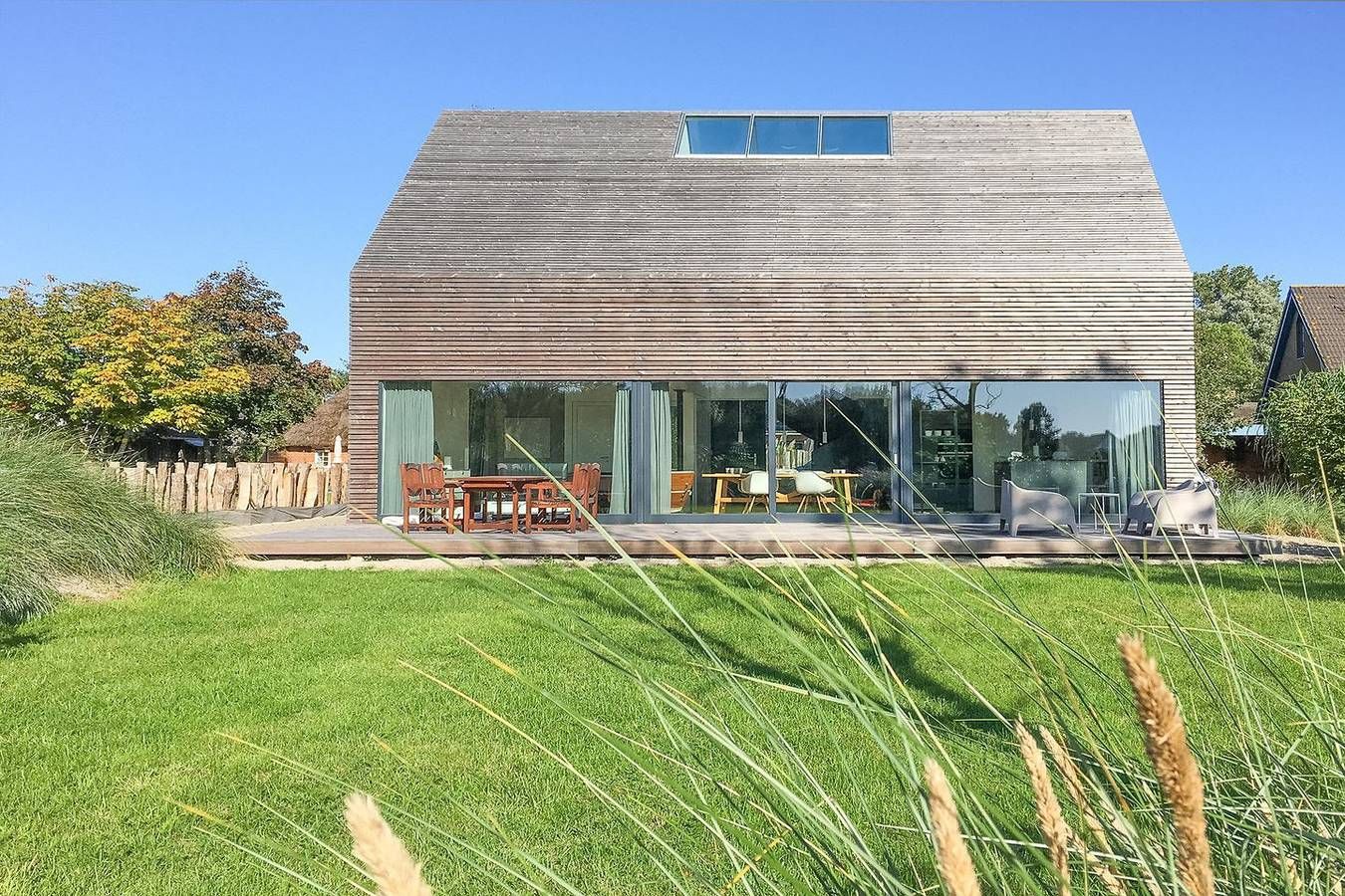 Luxus trifft Architektenhaus: Sie mögen ein modernes Raumkonzept gepaart mit viel Licht und einer durchdachten technischen Ausstattung? Hochwertige Inneneinrichtung, ruhige Lage in der Nähe vom traumhaften Sandstrand? Dann buchen Sie unser Scheunenhaus für Ihre nächste Auszeit am Meer. Aktueller Hinweis: Der Eingangsbereich dieses Hauses wird derzeit umgestaltet. Bis zur Fertigstellung der neuen Treppe erfolgt der Zugang über einen provisorischen Holzsteg. Die Lage Das Scheunenhaus wurde 2021 erbaut, wo einst eine landwirtschaftlich genutzte Scheune stand. Das komplett aus Holz errichtete Architektenhaus liegt in einer ruhigen Seitenstraße in dem Ort Tating, einem ländlich geprägten Dorf, unmittelbar vor den weitläufigen Sandstränden von St. Peter-Ording (8 Autominuten). Kleine Geschäfte, Bäckerei und Einkaufsmöglichkeiten für den täglichen Bedarf sind fußläufig erreichbar. Die Ausstattung Das ca. 123 qm große Ferienhaus ist modern und exklusiv eingerichtet und erstreckt sich auf zwei Ebenen. Der schöne Holzdielen-Fußboden im gesamten Haus gibt Ihnen eine behagliche Atmosphäre. Die großformatigen Glaselemente lassen angenehm viel Tageslicht hinein. Das Ferienhaus verfügt über drei Schlafzimmer: eines im Erdgeschoss mit einem Doppelbett (140x200), die anderen beiden (180 x 200 und 2 Einzelbetten) sind über eine Wendeltreppe im Obergeschoss erreichbar. Die Betten sind bei Ankunft liebevoll bezogen. Im Wohnbereich befindet sich eine Wohnlandschaft mit einer u-förmigen Couch und einem Relaxsessel samt Fußhocker. Nehmen Sie Platz vor dem großen Fernseher, genießen Sie den Blick durch die Terrassenfront in die Natur oder wärmen Sie sich am Kaminofen. Die top moderne Designküche mit Kochinsel motiviert zu gemeinsamen Kochaktionen und ermöglicht ein geselliges Beisammensein. Inmitten des Raumes nehmen Sie Platz am Esstisch mit 6 Stühlen. Ein Highlight des Hauses ist das geräumige Badezimmer mit freistehender Badewanne, Dusche, zwei Waschbecken, Sauna und einem überzeugenden Lichtkonzept für schöne Wellnessstunden. Im Erdgeschoss rundet ein Hauswirtschaftsraum mit Waschmaschine und Trockner und ein Gäste-WC das Bild ab. Der Außenbereich sticht zusätzlich hervor durch seinen Garten mit Dünenwall und Holzelementen. Von hier aus genießen Sie den unverbauten und bezaubernden Ausblick über die angrenzenden Weiden. Auf der großzügigen Terrasse stehen Ihnen Gartenmöbel zur Verfügung. Die Besonderheiten Der Holzdielenboden mit Fußbodenheizung verschafft Ihnen ein wohliges Raumgefühl. Fahrräder können in einem Fahrradschuppen sicher untergebracht werden. Direkt am Haus stehen Ihnen Parkmöglichkeiten zur Verfügung. Bitte beachten Sie, dass dieses Haus aktuell nicht über einen Internetanschluss verfügt. Ein mobiler Gigacube ist zwar vorhanden, das Datenvolumen jedoch begrenzt – daher wird das Haus bewusst ohne Internet angeboten. Eine Erstausstattung an Bettwäsche und Handtüchern wird bei dieser Unterkunft obligatorisch hinzugebucht und ist bereits im Endpreis enthalten. Zusätzliche Wäschepakete können in den optionalen Leistungen ergänzt werden. Bitte beachten Sie, dass sich das Haus aufgrund der offenen Bauweise und der Dachfenster in den Sommermonaten stärker aufheizen kann.