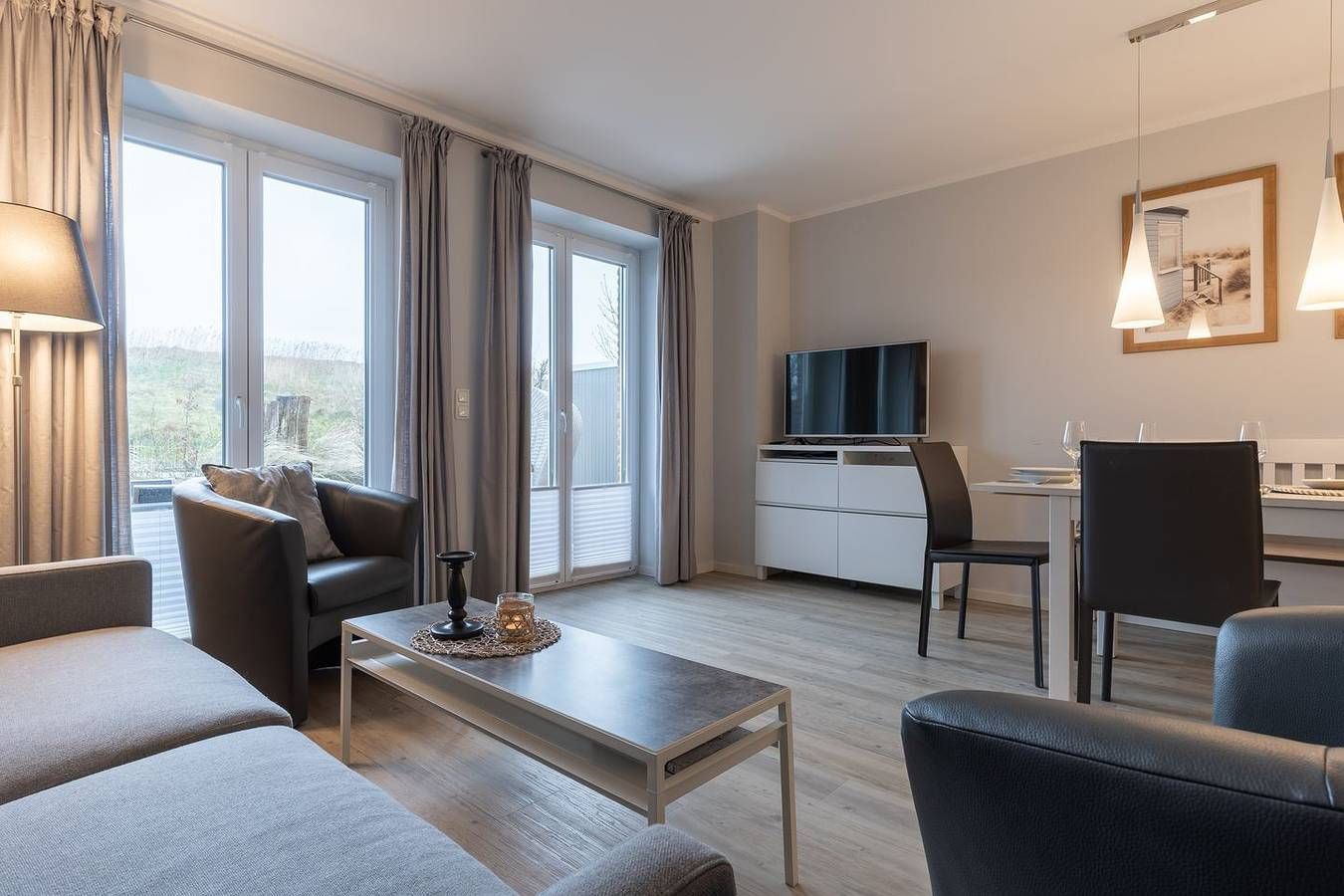 Die luxuriöse Mittelhausscheibe mit Garten, gemütlicher Terrasse und traumhaften Blick über den Deich befindet sich direkt am Ordinger Hauptstrand. Das Haus verfügt über ca. 84 m² Wohnfläche und teilt sich wie folgt auf: Im Erdgeschoss befindet sich der Wohnraum mit einer offenen Wohnküche und einem gemütlichen Essbereich. Ein Elektrokamin im Wohnraum bietet ruhevolle Entspannung. Die Küche ist mit hochwertigen Geräten und edlem Geschirr voll ausgestattet. Im Erdgeschoss ist ebenso ein Gäste WC, ein Flur mit Garderobe, ein Abstellraum unter der Treppe und Hauswirtschaftsraum mit Waschmaschine. Über eine Holztreppe gelangt man in das Obergeschoss mit zwei großzügigen Schlafzimmern, eines mit einem Doppelbett und das Andere mit 2 Einzelbetten. Ebenso ist im OG noch ein geräumiges Duschbad. Über eine weitere Holztreppe geht es vom Doppelzimmer der Einzelbetten ins Dachgeschoss mit gemütlichem Schlafsofa für 2 Personen. Hier kann man mit einem traumhaftem Weitblick bis zum Wasser herrlich entspannen oder übernachten. Mit viel Liebe zum Detail wurde großen Wert auf die Inneneinrichtung gelegt. Das ganze Haus verfügt über große Fenster und somit ist jeder Raum herrlich lichtdurchflutet. Eine hochwertige Außensauna auf dem Grundstück bietet genügend Freiraum zur Erholung. Nutzbar von 4 Appartements aus dem Haus. Urlaub pur und das ab der ersten Sekunde! Die Nähe zu den Hotspots, wie den km langen Kitestrand, das Beachmotel, Gosch etc., ist einzigartig in dieser Lage! In dem wunderschönen Ferienhaus ist max. ein Haustier zugelassen.