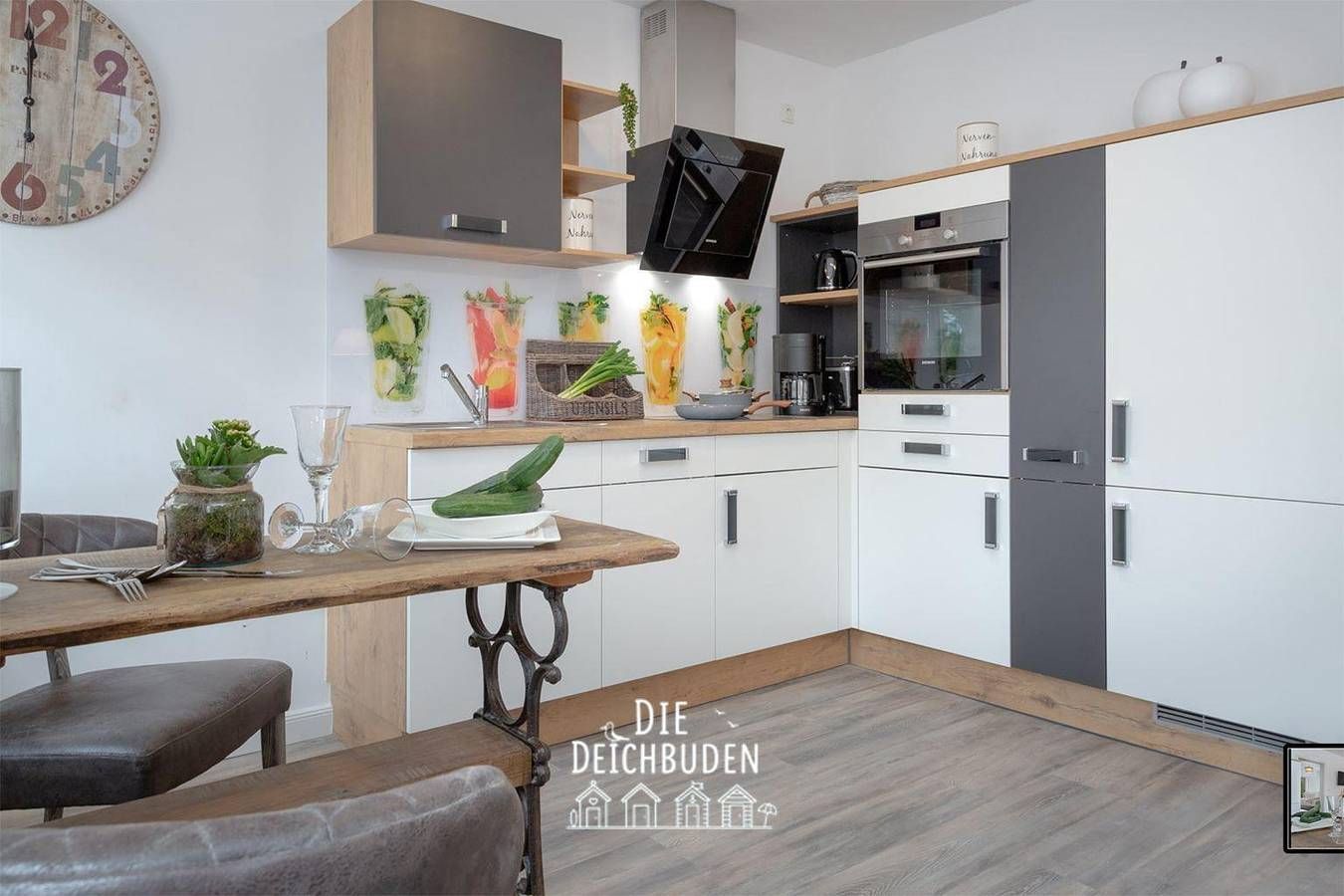Ferienwohnung Bude 6 in Büsum – Erdgeschoss, Terrasse mit Strandkorb & Hund erlaubt Usere Ferienwohnung Bude 6 liegt im Erdgeschoss unserer Apartmentanlage Die Deichbuden und bietet gemütlichen Wohnkomfort direkt am Deich. Sehr helle und moderne, mit viel Liebe eingerichtete Erdgeschoss Wohnung. Sie verfügt über eine moderne, offene Einbauküche mit Backofen und einem schönem Ceranfeld, sowie Bad mit Wellnessdusche, Flat Screen TV, Musikanlage und WLAN. Im Wohnbereich, in dem sich auch die Küche und ein schöner Essplatz befinden, steht ein gemütliches Sofa. Im Schlafzimmer, ebenfalls mit Flat Screen TV, steht ein Doppelbett 180 x 200 cm (ohne Fußende). Ein Strandkorb auf der Terrasse, ein eigener kostenfreier PKW Stellplatz und ein abschließbarer Fahrradunterstand gehören zur Wohnung. Unser Appartmenthaus 'Die Deichbuden' finden Sie am Ortseingang des wunderschönen Büsumer Deichhausen. Von hier aus hat man einen herrlichen Blick auf den Deich, die Wiesen und den Wald. Kinderreisebett und Hochstuhl stehen auf Anfrage zur Verfügung. In der Appartementanlage befindet sich ein Gemeinschaftsraum mit Münzwaschmaschinen, Münztrocknern, Bügelbrett und Bügeleisen. Waschraum für Hunde vorhanden. Bitte beachten Sie, dass eine eventuell anfallende Kurabgabe nicht im Gesamtpreis enthalten ist. Diese ist vor Ort zu leisten.
