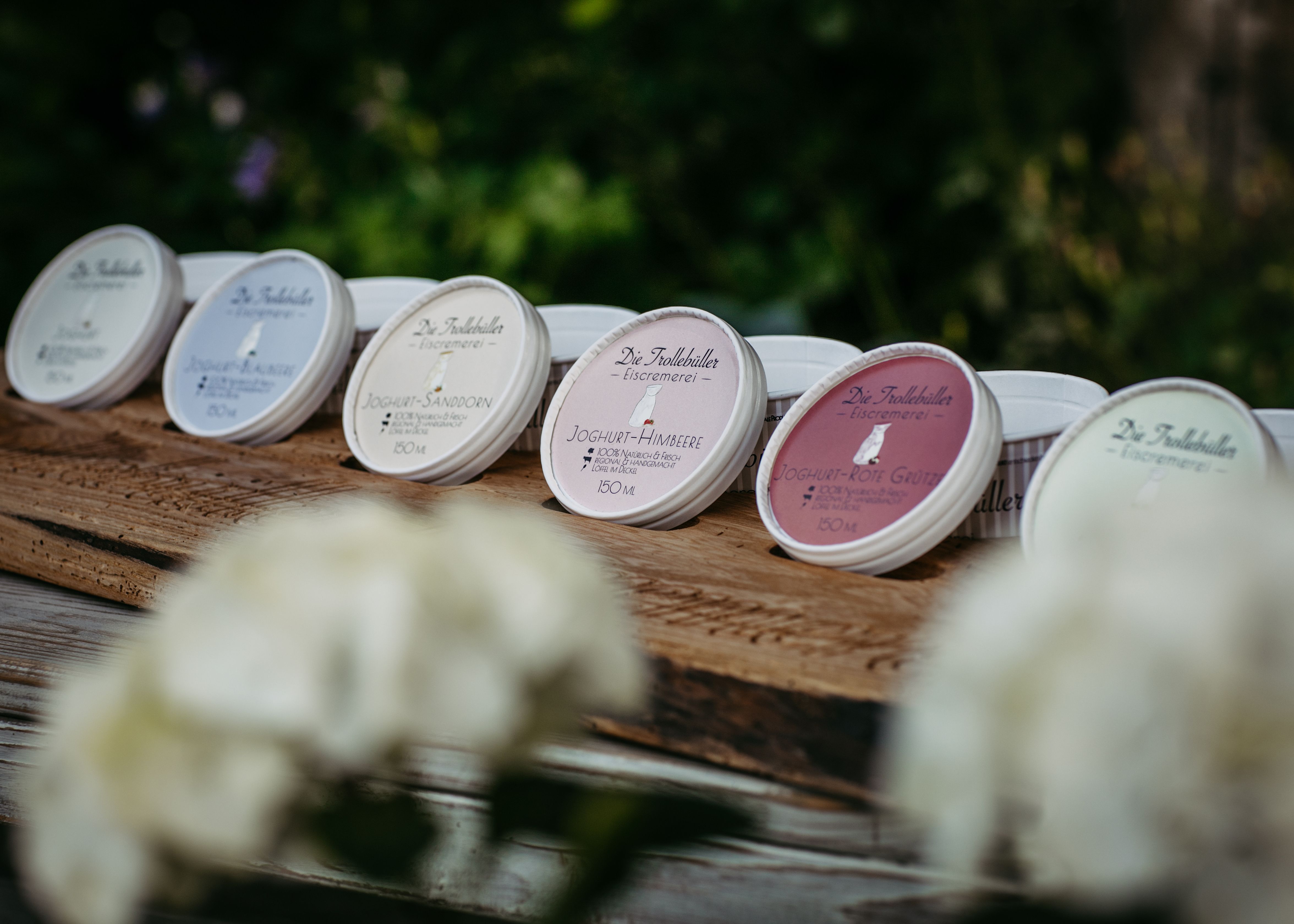 Die Grundlage für ersteres liefert die Milch der 130 hofeigenen Milchkühe. Die Sahne kommt von der Langenhorner Meierei aus dem Nachbardorf. Auch sonst beziehen die Steensens ihre Zutaten so weit wie möglich aus der näheren Umgebung. "Am liebsten arbeiten wir mit Produkten aus der Region, direkt vom Erzeuger, so wissen wir immer, was in unseren Bechern steckt", sagt Sina Steensen, der als FEINHEIMISCH-Mitglied neben der Regionalität vor allem die Qualität ihrer Produkte wichtig ist. An den Rezepten wird so lange getüftelt, bis Geschmack und Konsistenz perfekt sind: Salziges Karamell, Weiße Schokolade-Mohn ..., der Kreativität sind kaum Grenzen gesetzt. Besonders beliebt sind die Sorten aus selbstgemachtem Joghurt.