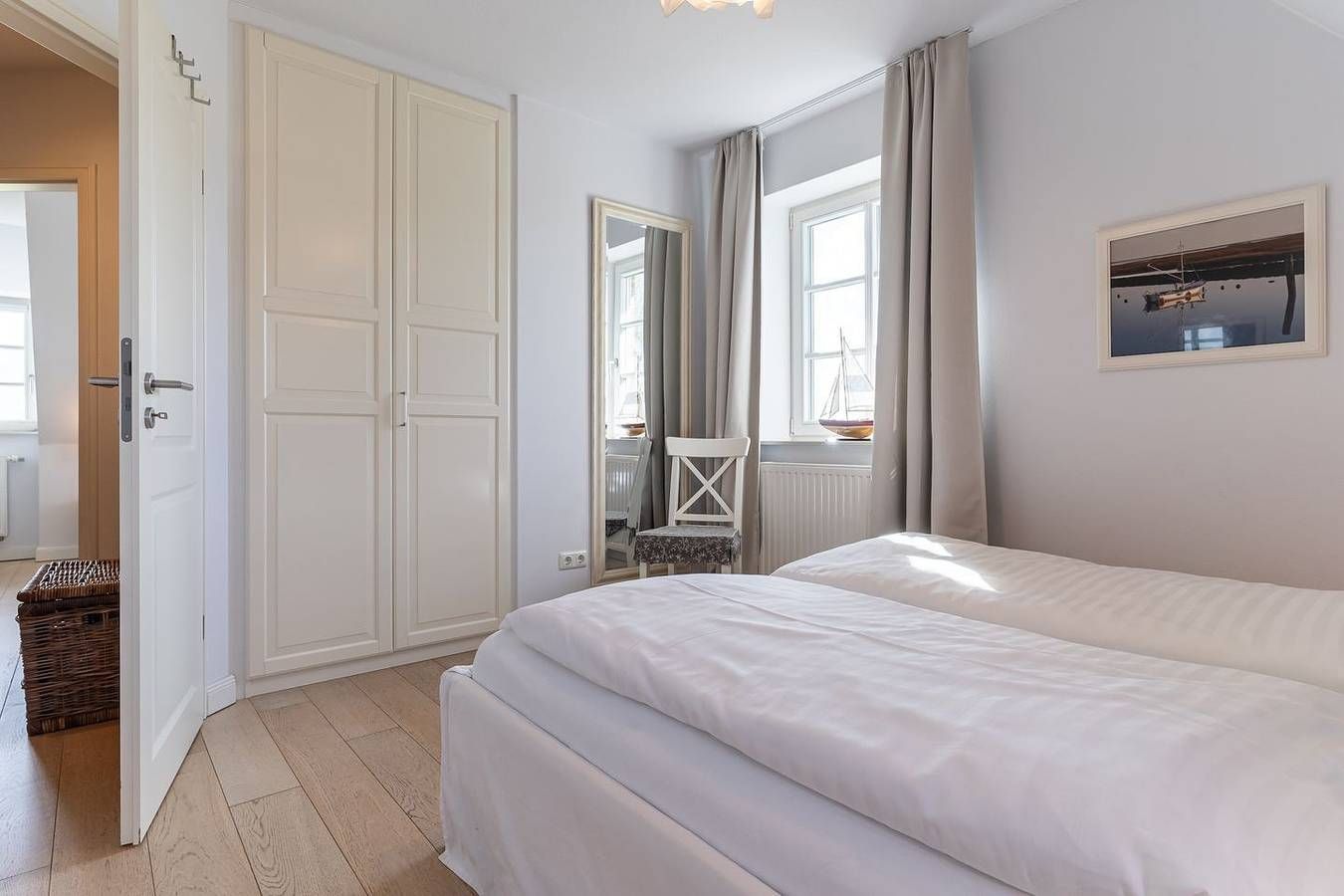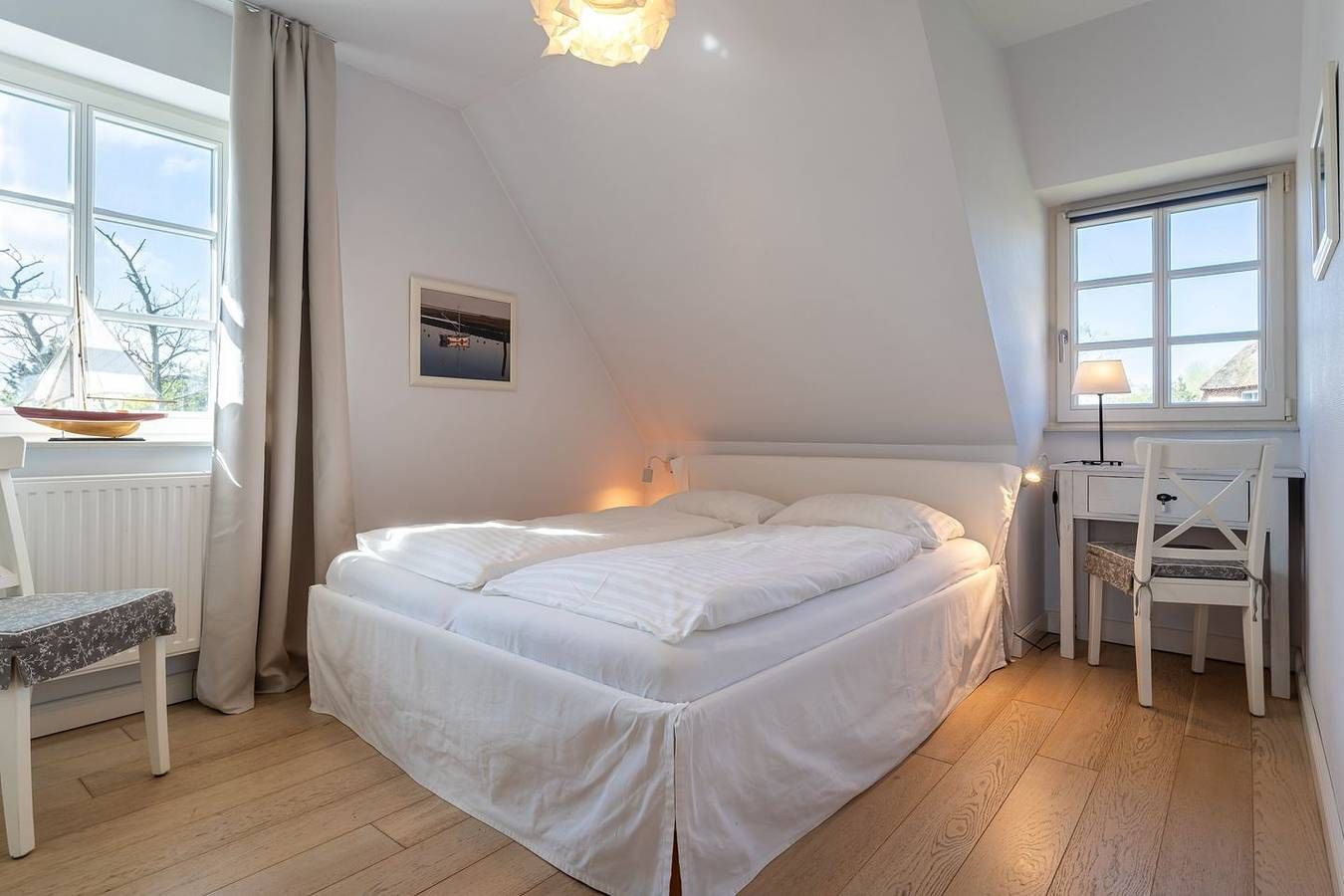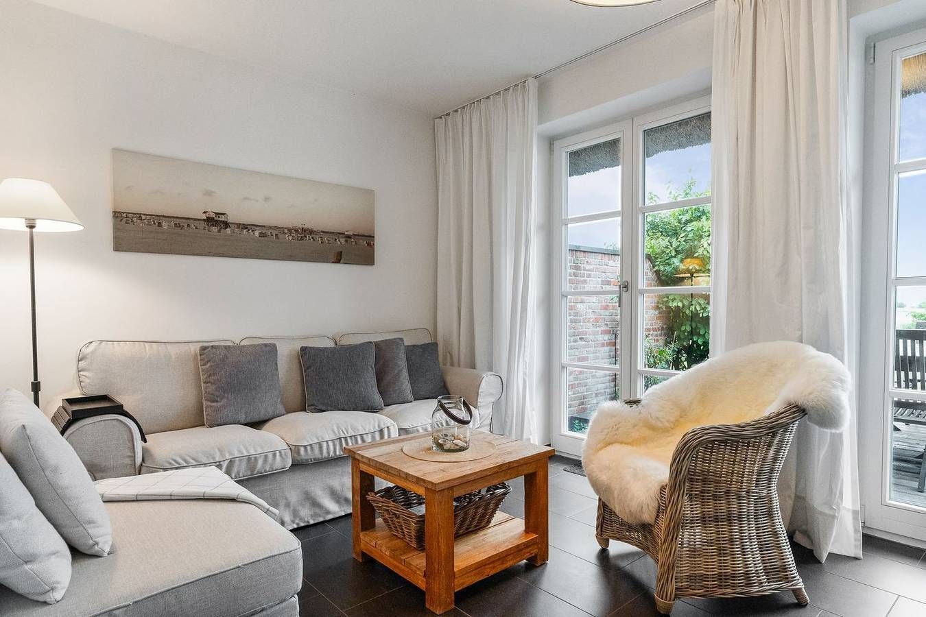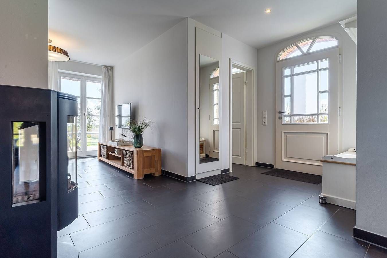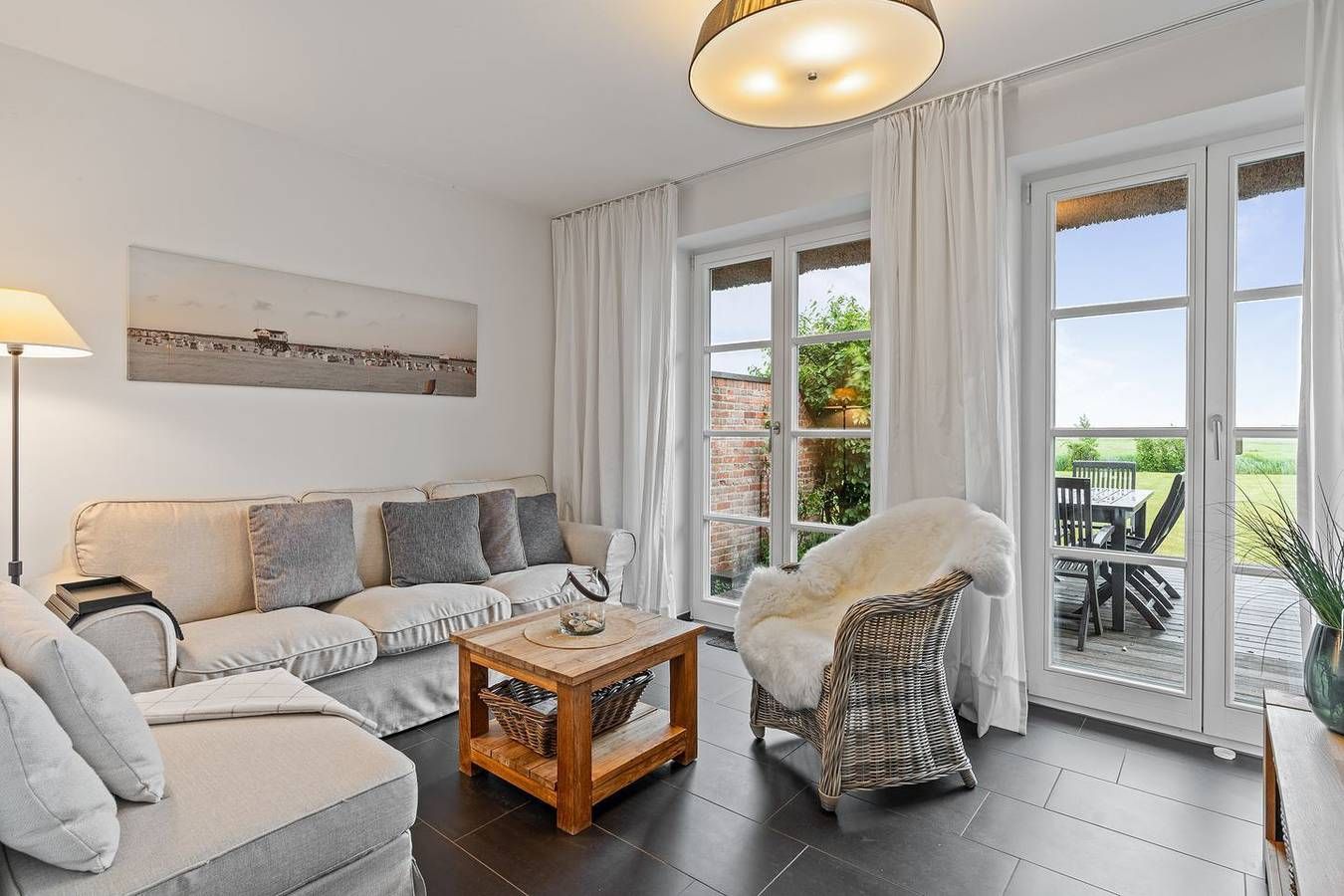 Ein echter Geheimtipp für alle, die nach Erholung suchen! Diese wunderschöne Doppelhaushälfte unter Reet bietet einen atemberaubenden Blick über Felder, Wiesen und das Marschland. Nur einen malerischen 7-minütigen Spaziergang von der Böhler Strandüberfahrt entfernt und auch der Golfplatz liegt in gemütlichen 10 Gehminuten Entfernung. Die großzügige Wohnfläche erstreckt sich über etwa 90 m² und erstreckt sich über drei Ebenen: Im Erdgeschoss erwarten Sie ein einladender Eingangsbereich, ein behaglicher Wohnraum mit offener Küche, ein gemütlicher Essbereich, ein knisternder Kamin und Zugang zu den sonnigen Terrassen, sowie ein Badezimmer mit Dusche/WC. Die beiden Terrassen sind liebevoll mit hochwertigen Gartenmöbeln ausgestattet und laden dazu ein, bei schönem Wetter den ganzen Tag im Freien zu verweilen und die Natur zu genießen. Im Obergeschoss befinden sich zwei Schlafzimmer mit komfortablen Doppelbetten (1x 180 x 200 cm und 1x 160 x 200 cm) sowie ein stilvolles Badezimmer mit Badewanne/WC und separater Dusche. Das Dachgeschoss beherbergt ein weiteres liebevoll eingerichtetes Schlafzimmer mit zwei Einzelbetten (je 90 x 200 cm). Im Außenbereich erwartet Sie ein charmantes Saunahaus mit einem kleinen Ruheraum - perfekt zum Entspannen und Abschalten. Auf dem Grundstück stehen Ihnen gut zugängliche Stellplätze für zwei Fahrzeuge zur Verfügung, damit Sie sich direkt vor Ihrer Unterkunft entspannt zurücklehnen können. In diesem Ferienhaus sind Sie herzlich dazu eingeladen, max. zwei Fellnasen mitzubringen, damit auch Ihre vierbeinigen Familienmitglieder eine Auszeit in dieser traumhaften Umgebung genießen können.