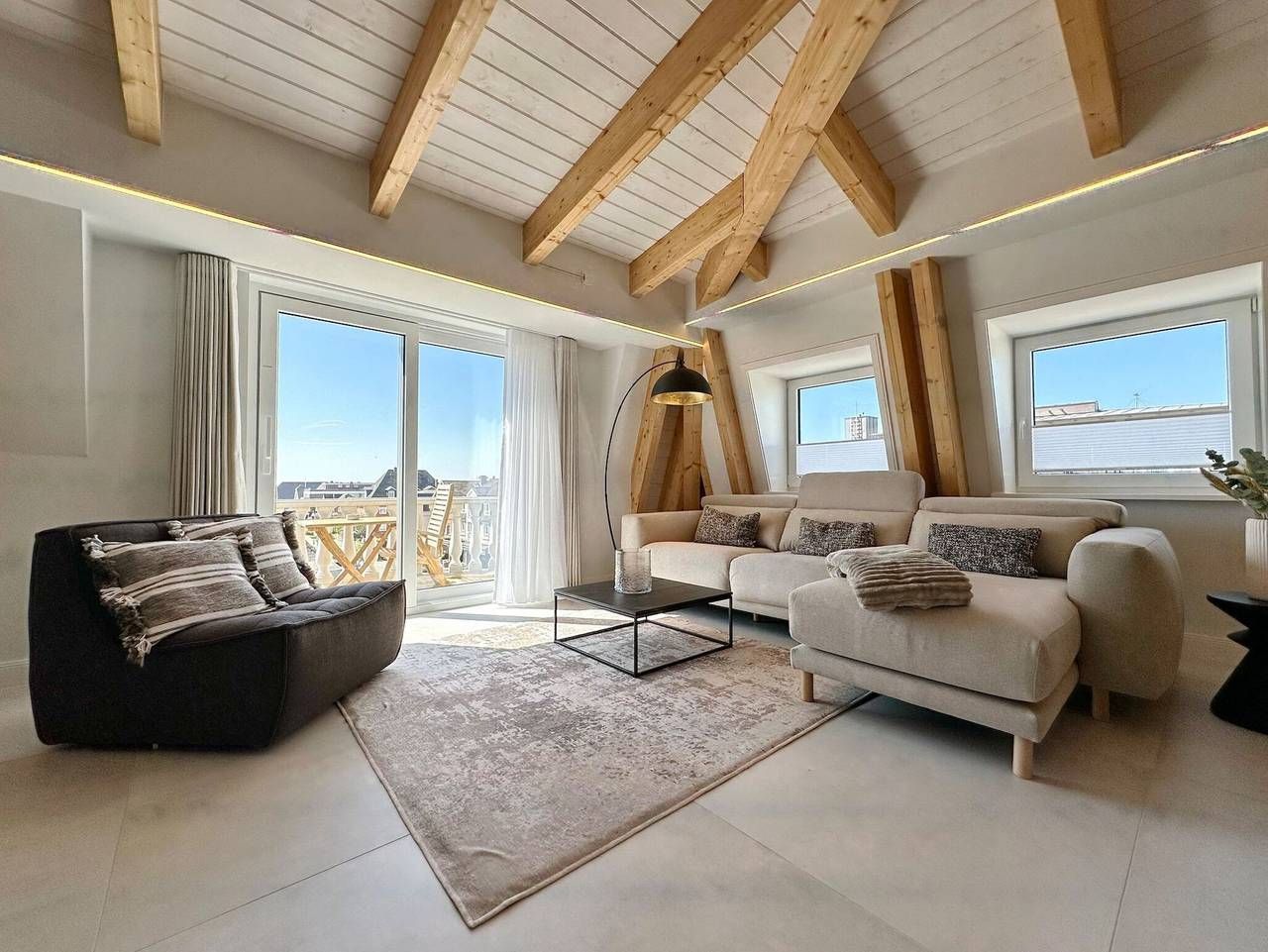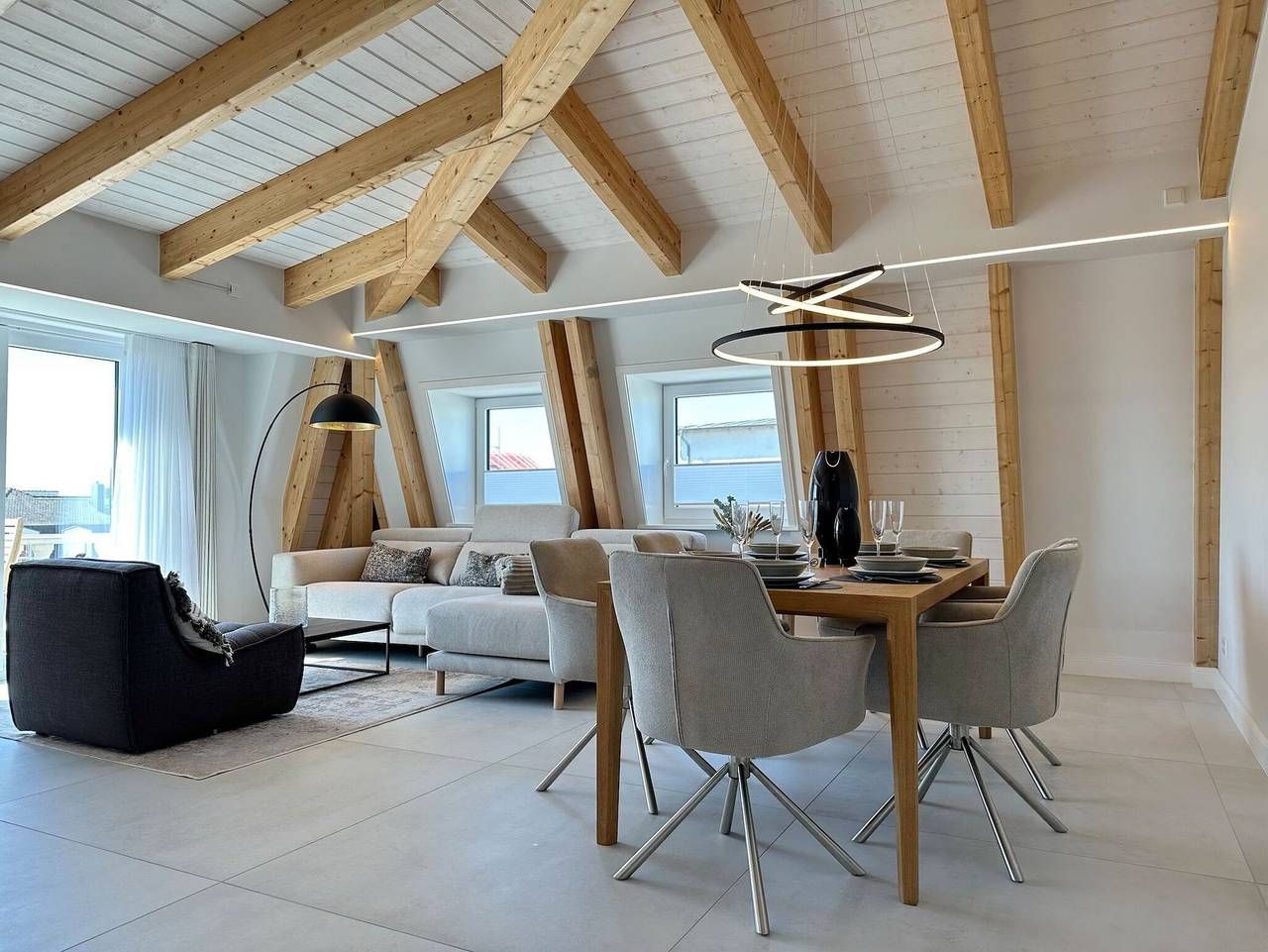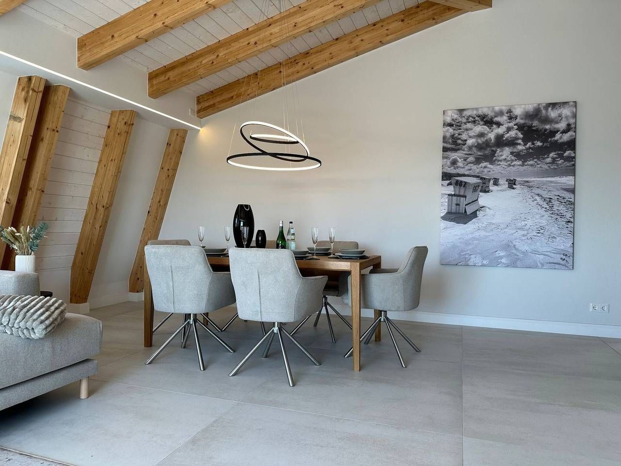 Die Anlage Ebbe + Flut ist im Jahr 2023/24 entstanden und befindet sich in zentraler Lage Westerlands. Die Innenstadt ist nur wenige Meter entfernt, den Strand erreichen Sie bequem zu Fuß in 400m Entfernung. Die hochwertige 4-Zimmer-Wohnung im 3. OG mit ca. 109 qm ist für maximal 6 Personen. Vom geräumigen Flur mit Garderobe gelangen Sie durch die offene Küche in das Wohnzimmer mit Südbalkon. Die hochwertige Küche bietet neben Bora Induktionsherd auch Geschirrspüler, Kühlschrank mit Gefrierfach und Backofen mit integrierter Mikrowelle. Alle Schlafräume bieten mit Boxspringbetten (2x 180x200 und 200x200) der Marke FBF hochwertigen Schlafkomfort und verfügen über Einbauschränke. Das Hauptschlafzimmer verfügt über eine Dusche und separates WC, einen Südbalkon und eine Dachterrasse Richtung Osten. Für die anderen Schlafräume stehen 1 weiteres Duschbad /WC und ein Gäste-WC zur Verfügung (jeweils 1 Kinderbett zubuchbar). Die Wohnung ist mit großformatigen Fliesen ausgelegt und verfügt über Fußbodenheizung. Lediglich die Schlafräume sind mit Teppichware versehen. Internet (ohne Gewähr) und insgesamt 3 Smart-TV sind vorhanden. Im Haus befindet sich ein großzügiger Wellnessbereich mit Schwimmbad, finnischer Sauna und Ruheraum sowie eine Waschküche mit Gemeinschaftswaschmaschine/Trockner. Das Schwimmbad ist mit einer Größe von 20 x 5m das Größte unserer Anlagen. In der gesamten Anlage ist das Rauchen und Halten von Hunden untersagt. Bettwäsche und Handtücher sind zur Anreise aufgezogen. Ein Tiefgaragenstellplatz kann kostenpflichtig dazu gebucht werden. Eine Ladestation für E-Autos befindet sich am Haus und kann kostenpflichtig genutzt werden. Ihre Fahrräder können Sie in der Tiefgarage auf einen dafür vorgesehenen Abstellplatz stellen (ist nicht zusätzlich gesichert).