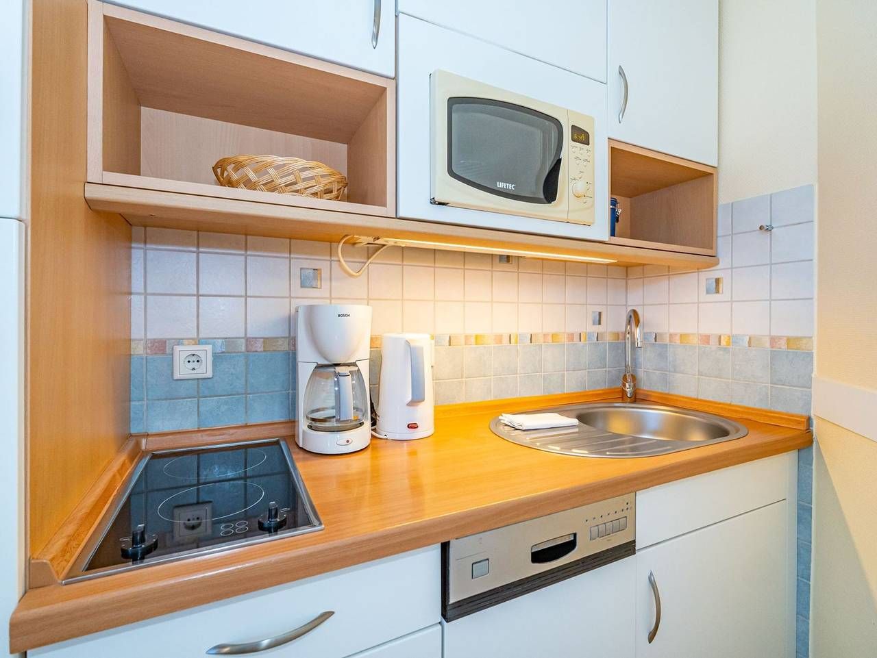Exklusive, schicke 2-Zimmer-Eckwohnung! Exklusive, Allergiker-geeignete 2-Zimmer-Nichtraucher-Ferienwohnung mit gehobenem Komfort (ca. 50 m²) in der 2. Etage. Vom Vorflur mit Garderobe gelangt man in das schicke Wohnzimmer (mit Austritt zum Balkon, mit Strandkorb, Balkonmöbeln und Auflagen), in das geräumige Duschbad/WC und in das Schlafzimmer. Das Wohnzimmer hat eine sehr gute Eckgarnitur (mit Doppelschlafcouch 1,27 x 2,00 m), Kabel-Flachbild-TV, einen Essplatz und Mini-Kompaktanlage. Das Schlafzimmer hat (mit Austritt zum Südostbalkon) ein gutes Doppelbett (mit 7-Zonen-Latex-Einzelmatratzen, 1,00 x 2,00 m) und einen geräumigen Kleiderschrank. Die moderne Küchenzeile hat einen Geschirrspüler, Mikrowelle mit Grillfunktion, ein 2-Platten-Ceranfeld und einen Kühlschrank mit 3-Sterne-Gefrierfach. Kaffeemaschine, Wasserkocher und Toaster gehören zur Grundausstattung. Ein Tiefgaragenplatz kann für Euro 14,00 pro Tag mit gebucht werden. In dieser Ferienwohnung ist das Mitbringen von Haustieren nicht gestattet.