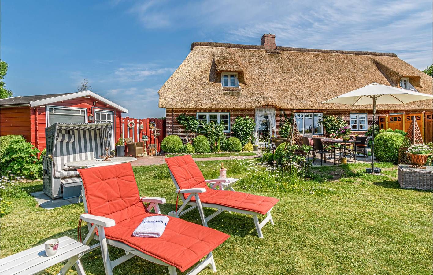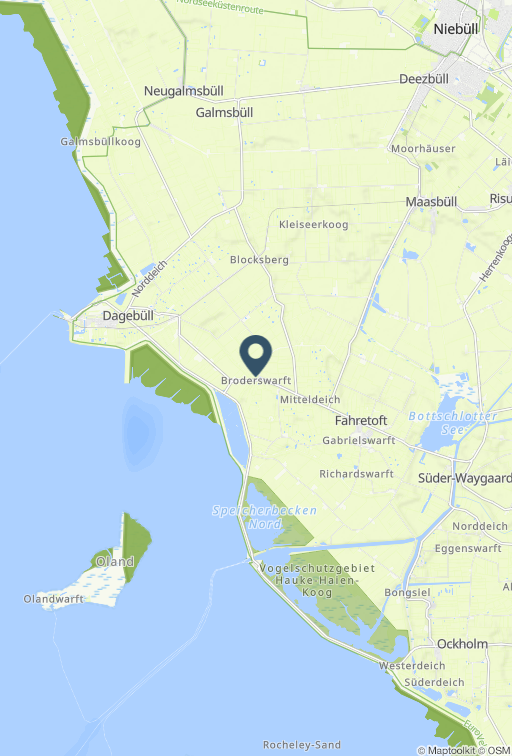 Den Urlaub an der Nordsee ganz besonders erleben. Diese wunderschöne Reetdachkate liegt mit nur wenigen anderen Häuser auf der Broderswarft in Fahretoft. Hier können ganz in Ruhe Ihren nächsten Nordseeurlaub freuen und den Nationalpark Wattenmeer für sich entdecken. Das Haus wurde mit sehr viel Liebe zum Detail eingerichtet und bietet mit zwei Schlafzimmern, der großzügigen Küche und Wohnzimmer viel Platz für einen entspannten Aufenthalt. Ein ganz besonderes Highlight dieses Hausen ist der große Garten, der mit vielen Sitz- und Liegemöglichkeiten ausgestattet ist. Hier finden Sie den ganzen Tag ein Plätzchen an der Sonne. Egal ob ein gemütlicher Kaffee am Nachmittag auf der Terrasse, ein Sonnenbad auf der Wiese oder ein Buch im Strandkorb, hier können Sie alles an der frischen Nordseeluft genießen. Im Gartenhaus können Sie Ihre Fahrräder unterstellen, auch ein Stromanschluss für E-Bikes ist vorhanden. Die Schlüsselübergabe erfolgt im NOVASOL-Servicebüro in Dagebüll. Obwohl fast in Alleinlage liegt Fahretoft sehr günstig an der Nordsee. Die Häfen Schlüttsiel und Dagebüll sind schnell erreicht. Von hier aus starten die Fähren zu den Inseln und Halligen der Nordsee. Auch Niebüll und Klanxbüll mit der Zugverbindung nach Sylt ganz in der Nähe. Das Haus eignet sich wunderbar für alle Tagesausflüge an der Nordseeküste. In Dagebüll finden Sie gute Auswahl an Restaurants, Cafés und Bars. Einkäufe erledigen Sie im nahen Niebüll. Nur für Ferienaufenthalte