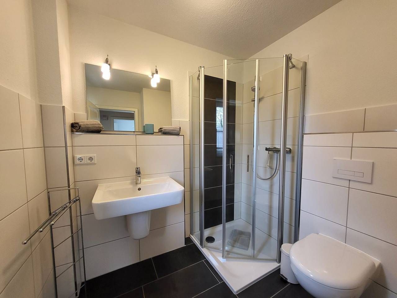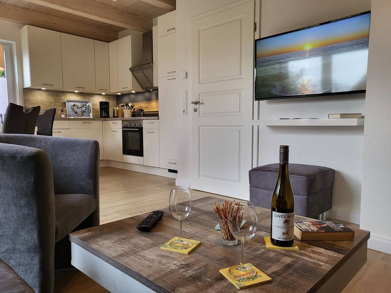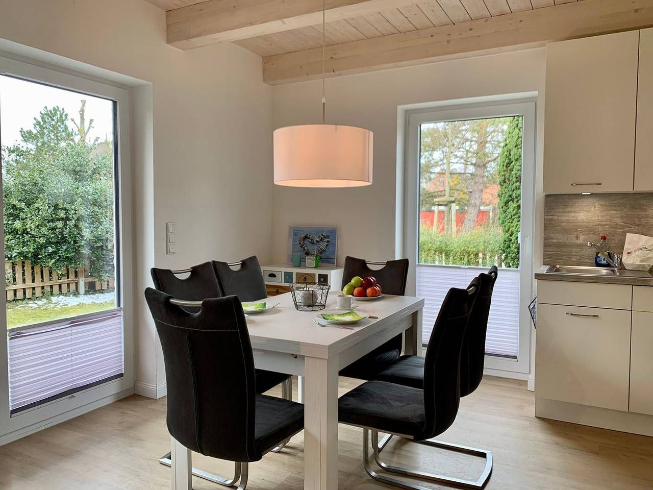 Doppelhaushälfte "Storch" in St. Peter Ording Das moderne, 2019 neu erbaute Ferienhaus liegt zentral und dennoch wunderbar ruhig im beliebten Ortsteil Dorf. Hier genießen bis zu 5 Personen einen unvergesslichen Urlaub in St. Peter Ording. Der ursprüngliche Ortskern mit zahllosen Restaurants, Cafés und Einkaufsmöglichkeiten ist nur wenigen Gehminuten entfernt. Spiel und Spaß für die Kleinen bietet das Indoor-Kinderspielhaus und der nahegelegene Westküstenpark. Die nächste Strandüberfahrt liegt direkt hinter dem Marktplatz und führt zum beliebten Südstrand. Zur edlen Doppelhaushälfte gehört eine große, möblierte Terrasse und ein komplett eingezäunter Garten für erholsame Sonnenstunden. Durch Lage und Ausstattung eignet sich die Doppelhaushälfte wunderbar für den Familienurlaub, Kinder sind hier herzlich willkommen. Auch der Urlaub mit Hund in St. Peter Ording ist hier möglich. Durch die großen Panoramafenster und den Durchgang zur Terrasse wirkt das moderne Wohn- und Esszimmer wunderbar hell und einladend. Zur Ausstattung gehört hier eine urgemütliche Sitzecke mit edler Ledercouch und einem Ledersessel samt Fußhocker. Für die stets passende Atomsphäre sorgt eine LED-Säule mit Farbspektrum. Für die multimediale Unterhaltung sorgen ein großer Flachbild-TV. Eine Auswahl an Büchern und Gesellschaftsspielen steht zur Verfügung. In den Raum integriert liegt die hochwertige Küche, zu deren Ausstattung unter anderem Cerankochfeld und Herd, ein Kühlschrank mit Gefrierfach sowie Geschirrspüler und Kaffeemaschine. Angrenzend sitzt die gesamte Familie am großen Esstisch zusammen. Ebenfalls im Erdgeschoss gelegen, befindet sich ein Schlafzimmer mit komfortablem 160x200cm Doppelbett.Ein kleines Duschbad mit Gäste-WC ist ebenfalls im EG vorhanden. Zwei weitere Schlafzimmer befinden sich im Oberschoss. Beide sind ausgestattet mit großem 180x200cm Doppelbett, eines verfügt über einen eigenen Flachbild-TV. Auf der Diele stehen eine gemütliche Couch und zwei Sessel zur Verfügung. Hier kann gemeinsam ferngesehen werden, die Couch lässt sich im Anschluss mit wenigen Handgriffen zur Schlafcouch umfunktionieren. Ein Badezimmer mit ebenerdiger Dusche und WC ist ebenfalls auf der Etage. Zur Ausstattung gehören hier unter anderem Waschtrockner und Fön. Willkommen im Urlaub – Willkommen in St. Peter Ording! Wichtige Informationen: Parkett. Nichtraucher. 1 Hund willkommen. PKW-Stellplatz vorhanden, Waschmaschine, Trockner und Bügelzubehör vorhanden, Babyreisebett und Kinderhochstuhl vorhanden. Eingezäunter Garten. Familienfreundlich, kinderfreundlich, hundefreundlich.