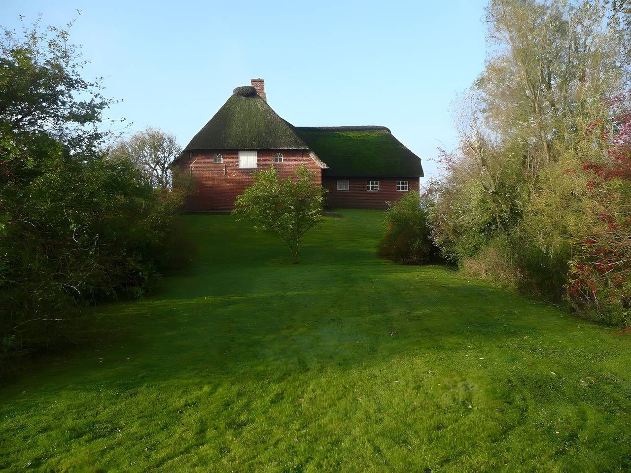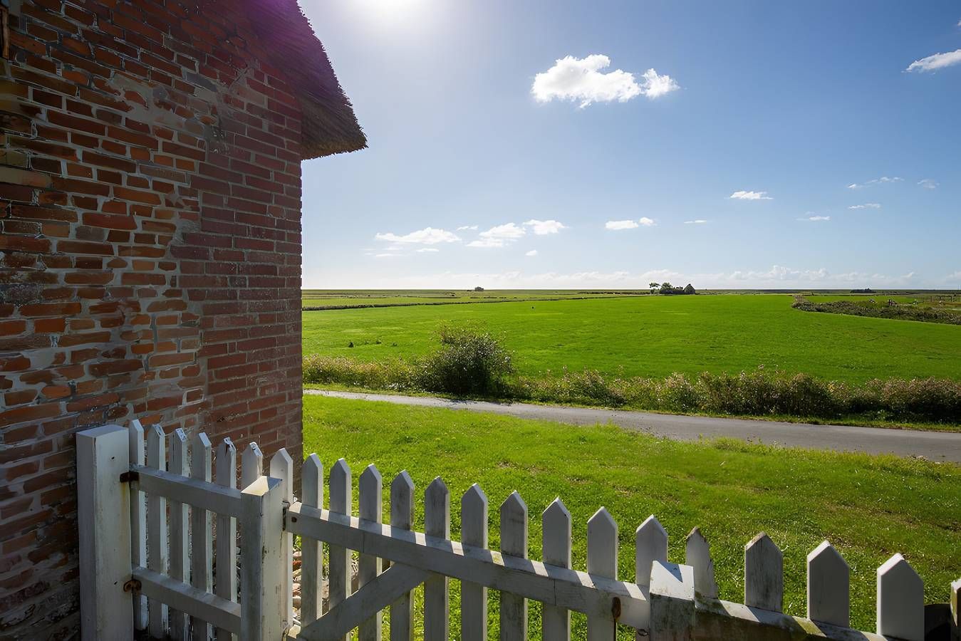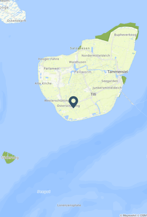 Die Friesenkate (80 m²) ist für 3 Personen geeignet und ein typisch uthlandfriesisches Haus, gebaut in L-Form mit der klassischen Innenaufteilung dieser Zeit. Die Wohnräume sind übereinander angeordnet. Ein durchgehender Flur trennt die ehemalige Knechtskammer und die Nebenräume sowie den früheren Stall vom Wohnbereich. In den Nebenräumen befinden sich heute zwei moderne Bäder und ein Hauswirtschaftsraum. Die Felder zwischen den Deckenbalken werden in historischen Friesenhäusern als Fach oder Fächer bezeichnet und sind 2,40 m breit. In diesen Bereichen kann man bequem stehen, während die Stehhöhe unter den Balken teilweise nur 1,80 m beträgt. Auch die Innentüren stammen aus alter Zeit und sind mit historischen Beschlägen versehen. Die lichte Durchgangshöhe orientiert sich an der geringeren Körpergröße der Menschen des 19. Jahrhunderts. Das Ferienhaus liegt im wenig besiedelten Südwesten von Pellworm, umgeben von unverbauter Natur. Die Friesenkate steht in Alleinlage auf einem zur Warft erweiterten Mitteldeich aus dem 17. Jahrhundert. Der Rundumblick reicht bis zum Leuchtturm, der in seiner Bauweise den Leuchtfeuern von Hörnum und Westerhever ähnelt, über das weite Marschland, vereinzelte Höfe und die schwarz-weiß gefleckten Kühe des Nachbarhofs. Das Grundstück ist von Buschwerk eingerahmt und bietet Privatsphäre, während es gleichzeitig Ausblicke in alle Richtungen ermöglicht. Der Wechsel von Sonne, Wolken, Licht und Schatten lässt die Umgebung wie ein großes, sich ständig veränderndes Gemälde erscheinen. Durch die Alleinlage und das fehlende Kunstlicht lässt sich der Sternenhimmel hier besonders gut beobachten. Das etwa 2.000 m² große Grundstück mit altem Baumbestand lädt nach Einbruch der Dunkelheit zu ausgiebigen Ausblicken auf die Milchstraße ein. An der Westseite des Hauses steht eine Holzbank bereit, die dazu einlädt, die Landschaft stundenlang zu genießen.