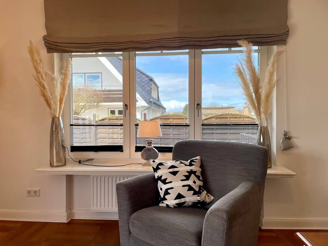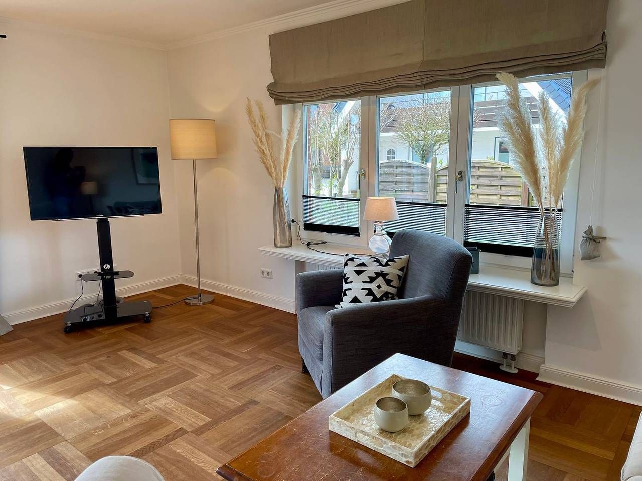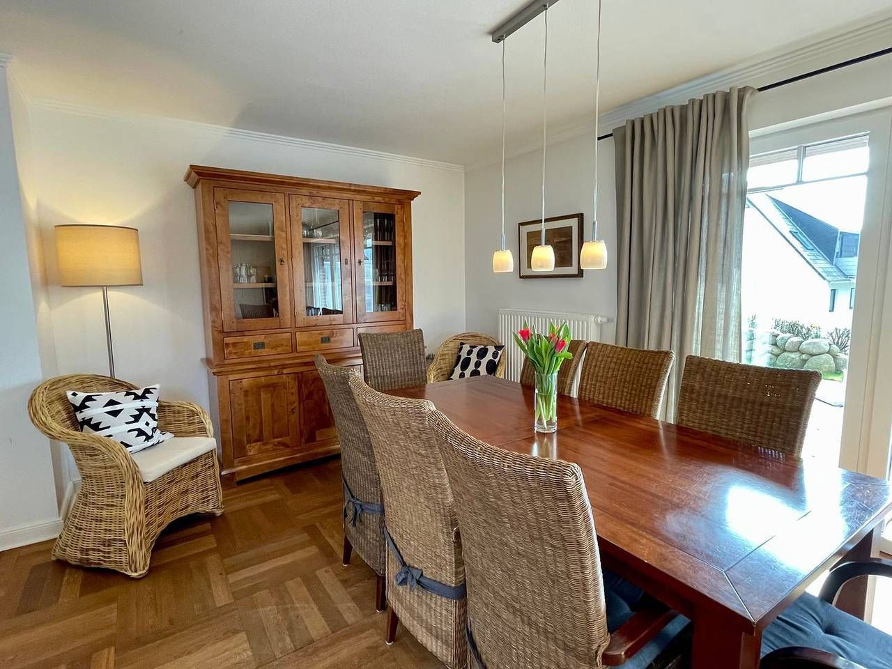 Dieses großzügige Ferienhaus bietet auf ca. 200 m² Wohnfläche über zwei Ebenen (Erdgeschoss und Dachgeschoss) außergewöhnlich viel Platz für einen entspannten Urlaub mit Familie oder Freunden. Mit fünf komfortablen Schlafzimmern, zwei vollwertigen Bädern und einem zusätzlichen Gäste-WC finden selbst größere Gruppen jederzeit ausreichend Raum zum Wohlfühlen. Ein separates Büro bietet zudem die Möglichkeit, auch im Urlaub ungestört zu arbeiten oder in Ruhe zu lesen. Die separate Küche ist modern ausgestattet und lädt zu gemeinsamen Kochabenden ein. Das Herzstück des Hauses bildet das großzügige Wohnzimmer mit edlem Parkettboden, einem geräumigen Esstisch und einer gemütlichen Sitzgarnitur – ideal für gesellige Stunden oder ruhige Abende. Von hier aus gelangen Sie direkt auf die wind- und sichtgeschützte Terrasse, ausgestattet mit Gartenmöbeln und eigenem Strandkorb, perfekt für entspannte Momente an der frischen Luft. Das Haus überzeugt mit zeitlosem Wohnkomfort, hochwertigen Materialien und warmen, harmonischen Farben, die sofort ein Gefühl von Behaglichkeit vermitteln. Die Lage könnte kaum besser sein: Nur 300 Meter trennen Sie vom feinsandigen Strand, und die neu gestaltete Promenade mit zahlreichen Restaurants, Cafés und Eisdielen erreichen Sie nach einem kurzen Spaziergang von ca. 600 Metern – ideal für Spaziergänge, Genuss und Meeresluft pur. Im Erdgeschoss befinden sich neben Küche und Wohnzimmer ein Schlafzimmer mit Doppelbett sowie ein Schlafzimmer mit Einzelbett. Im Obergeschoss erwarten Sie drei weitere Schlafzimmer sowie das separate Büro. Mehrere Flachbildfernseher, eine Stereoanlage und WLAN im gesamten Haus sorgen auch an regnerischen Tagen für Unterhaltung und Komfort. Für längere Aufenthalte stehen Ihnen zudem ein Wasch-Trockner, Bügelbrett und Hotelsafe für Ihre Wertsachen zur Verfügung. Zwei private Parkplätze befinden sich direkt am Haus. Ein kleiner Hund ist nach Absprache und gegen Aufpreis herzlich willkommen. Für weitere Fragen oder besondere Wünsche steht Ihnen die Vermietung „Appartements Eberhardt“ jederzeit gerne zur Verfügung.