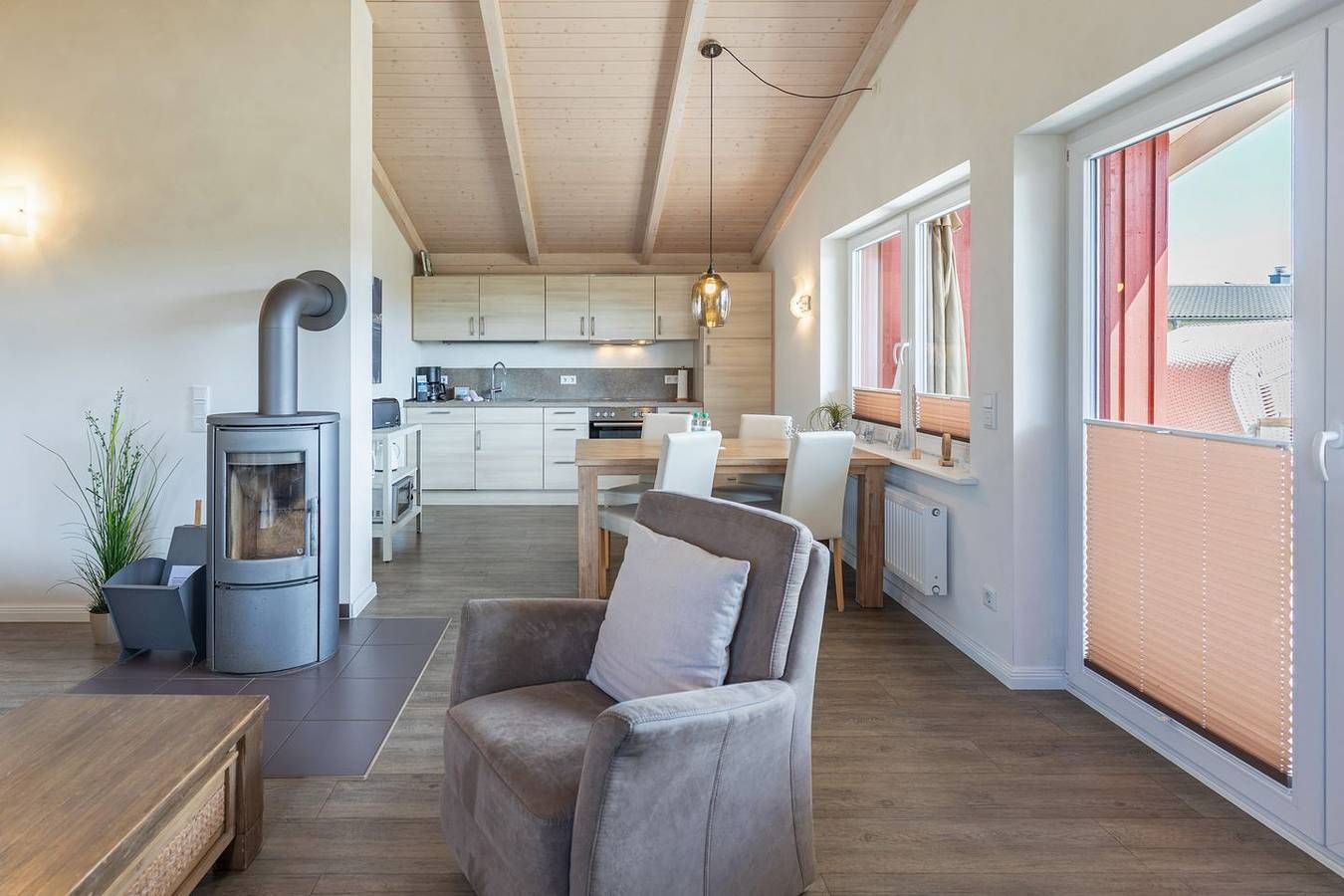 Unser luxuriös ausgestattetes, ebenerdiges Ferienhaus lässt keine Wünsche offen für einen erholsamen und unvergesslichen Nordseeurlaub. Mit seinen 2 Schlafzimmern bietet es Platz für bis zu vier Personen. Einen Steinwurf entfernt von der Nordsee finden Sie ein Zuhause, das mit allem Komfort (z. B. großes Badezimmer mit Sauna, Kaminofen) ausgestattet ist. Hinweis: Dagebüll wächst weiter – in der Nachbarschaft dieser Unterkunft entsteht derzeit ein neues Apartmenthaus. In diesem Zusammenhang kann es zeitweise zu baubedingten Geräuschentwicklungen kommen. Wir verfolgen den Baufortschritt aufmerksam und tun alles dafür, dass Ihr Aufenthalt dennoch so angenehm und erholsam wie möglich wird. Lage Besuchen Sie uns im familienfreundlichen Ort Dagebüll mit seinem bewachten Badestrand am grünen Deich, mit seinen vielen Wanderwegen direkt am Wasser, mit den vielen Unternehmungsmöglichkeiten an Land und auf dem Wasser. Von Dagebüll aus starten die Fähren zu den Inseln Föhr und Amrum, sodass Sie bequem zu Fuß oder mit dem Fahrrad die Inseln in einem Tagesausflug besuchen können. Auch die Halligen können Sie von Dagebüll aus per Schiff oder bei Ebbe zu Fuß besuchen. Lassen Sie sich das Wattenmeer mit seiner Welt in geführten Wattwanderungen näher bringen. Das Ferienhaus liegt in einem großzügig angelegten Ferienhausgebiet, das ausschließlich mit luxuriösen Holzhäusern bebaut wurde. Sie finden hier eine Ladenzeile mit Geschäften für den täglichen Bedarf (Café mit Frühstücksangebot, Fischrestaurant, Fahrradverleih, Kaufmann uvm.) Ausstattung Das 85 qm große Ferienhaus ist modern und exklusiv im skandinavischen Charme eingerichtet. Die zwei Schlafzimmer mit jeweils einen Komfort-Doppelbett (180 x 200 cm) bieten Platz für bis zu vier Personen. Das gemütliche Wohnzimmer ist mit einem Smart-TV ausgestattet. Der Kaminofen sorgt auch in der kälteren Jahreszeit für behagliche Stunden. Die offene Küche bietet Ihnen eine exklusive und umfangreiche Ausstattung, die das Herz eines jeden Hobbykochs höher schlagen lässt: Ceranfeld mit 4 Kochplatten, Backofen, Kühlschrank mit ***Gefrierfach, Mikrowelle, Geschirrspüler, Filterkaffeemaschine uvm. Das Badezimmer lässt keine Wünsche offen: zwei Waschbecken, eine große Badewanne, eine ebenerdige Dusche und eine schöne Sauna geben Ihrem Urlaub den richtigen Rahmen. Das Ferienhaus verfügt über ein zusätzliches WC. Auf der überdachten, windgeschützten Terrasse können Sie auf bequemen Gartenstühlen, den Sonnenliegen oder im Strandkorb die Sonne genießen. In einem Gemeinschaftsraum halten wir für unsere Gäste Waschmaschinen und Trockner gegen Gebühr bereit. Die Besonderheiten Wir legen viel Wert darauf, dass Sie sich von Ihrem ersten Urlaubsmoment bei uns erholen können. Deshalb ist uns eine individuelle Betreuung und Beratung während Ihres Aufenthalts wichtig. In unserem Servicebüro vor Ort sind wir gerne für Sie erreichbar. In unserem Nichtraucher-Ferienhaus heißen wir Vierbeiner herzlich willkommen. Das Grundstück ist mit einem 80 cm hohen Zaun umgrenzt. Gerne stellen wir Ihnen kostenfreies WLAN zur Verfügung. Die ausgewiesenen Preise gelten für einen Buchungszeitraum ab 5 Tagen. Bei Buchungen unter 5 Tagen wird eine Kurzreisepauschale erhoben. Eine Erstausstattung an Bettwäsche und Handtüchern stellen wir Ihnen bei dieser Unterkunft kostenlos zur Verfügung. Zusätzliche Wäschepakete können in den optionalen Leistungen hinzugebucht werden.