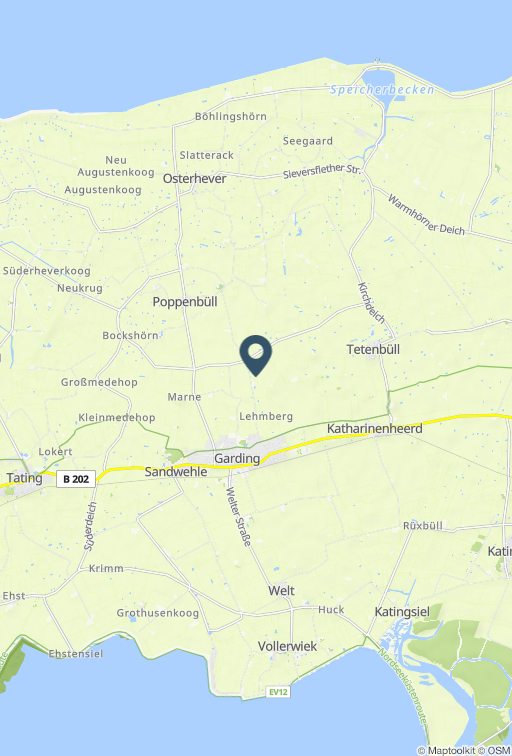 Der vollbewirtschaftete Bauernhof liegt im Herzen der Halbinsel Eiderstedt. Viele interessante Ausflugsziele sind von hier aus bequem zu erreichen. Zum Beispiel der kilometerlange Sandstrand von St. Peter-Ording oder der bekannte Westerhever Leuchtturm. Einkaufsmöglichkeiten, Gastronomiebetriebe sowie ärztliche Versorgung, bietet die Stadt Garding in ca. zwei Kilometern Entfernung.