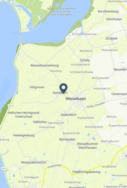 Wir befinden uns in dem kleinen Örtchen Norddeich (PLZ 25764) im schönen Schleswig-Holstein. Bitte nicht verwechseln mit Norddeich bei Norden in Niedersachsen. Ganz in unserer Nähe sind Wesselburen, Tönning, Büsum, St. Peter...