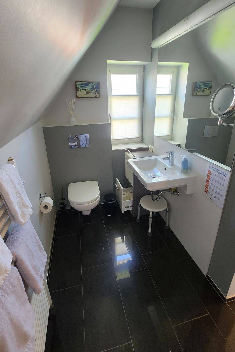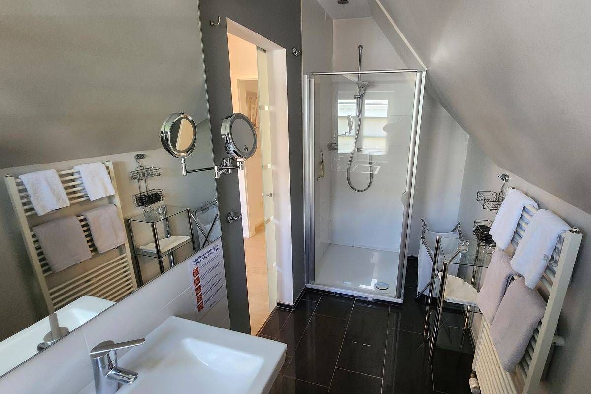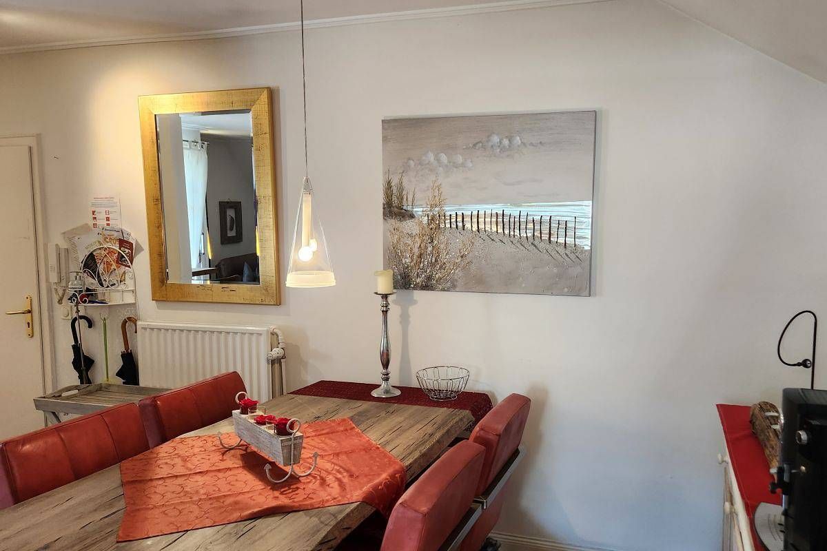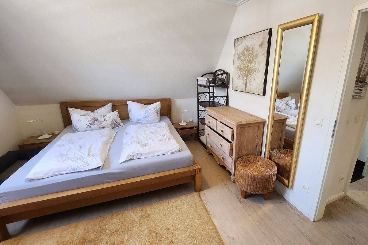 Der Wohn- /Essbereich ist eingerichtet mit einem großen Ecksofa, einem TV- Gerät und einem Esstisch. Die separate Küche ist mit einem Herd mit Cerankochfeld und Backofen, Geschirrspüler, Kühlschrank, Kaffeemaschine, Toaster, Wasserkocher ausgestattet. Das Schlafzimmer ist mit einem Doppelbett (1,80 m x 2,00 m - ohne Fußende) und einem Kleiderschrank eingerichtet. Das Badezimmer, welches vom Schlafzimmer erreichbar ist, ist mit einer ebenerdigen Dusche, WC, Handtuchwärmer und Föhn ausgestattet.