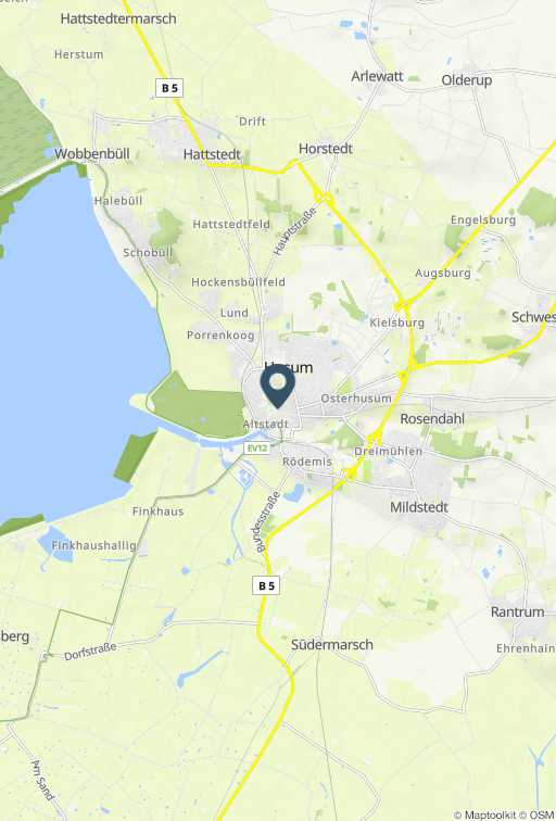 Der Marktplatz und die Innenstadt sowie der Hafen sind in wenigen Gehminuten erreichbar. Die Nordsee und den Badestrand erreichst du nach ca. 3 km. Die Entfernung zum Husumer Bahnhof beträgt ca. 950 m. Die Fahrzeit zur Messe Husum & Congress beträgt ca. 10 Fahrminuten.
