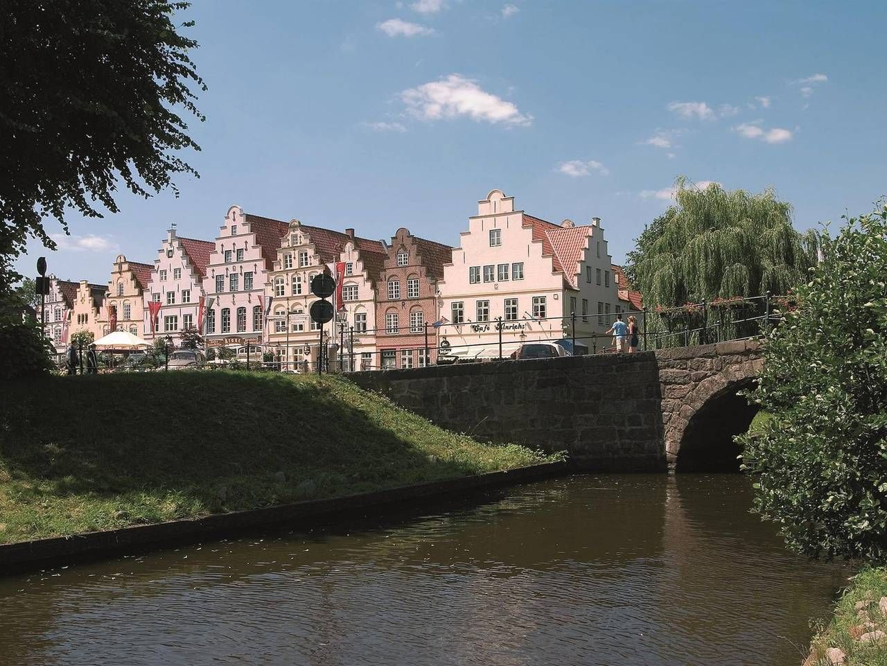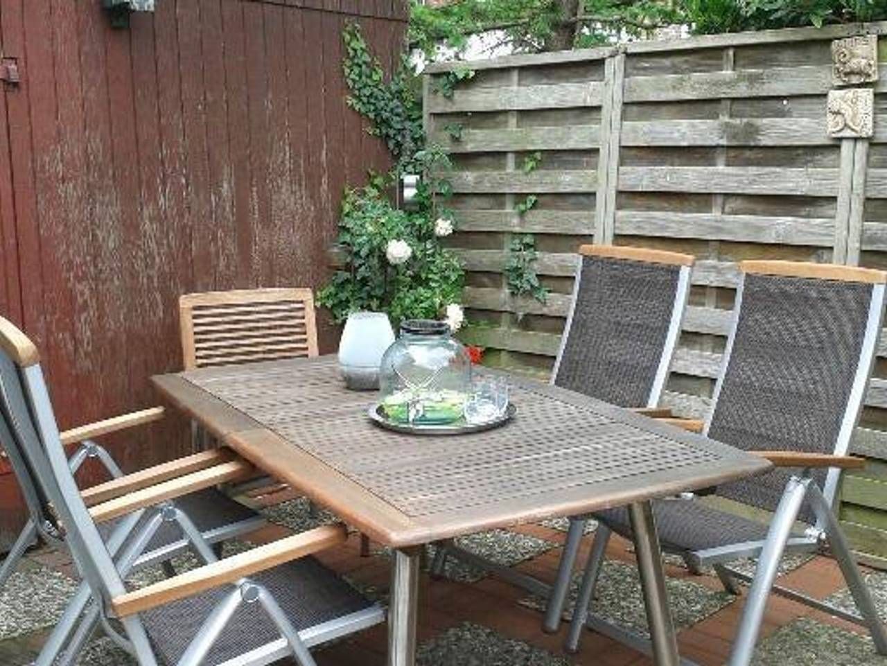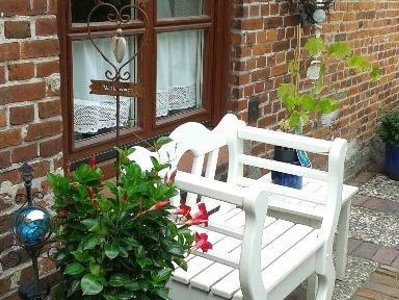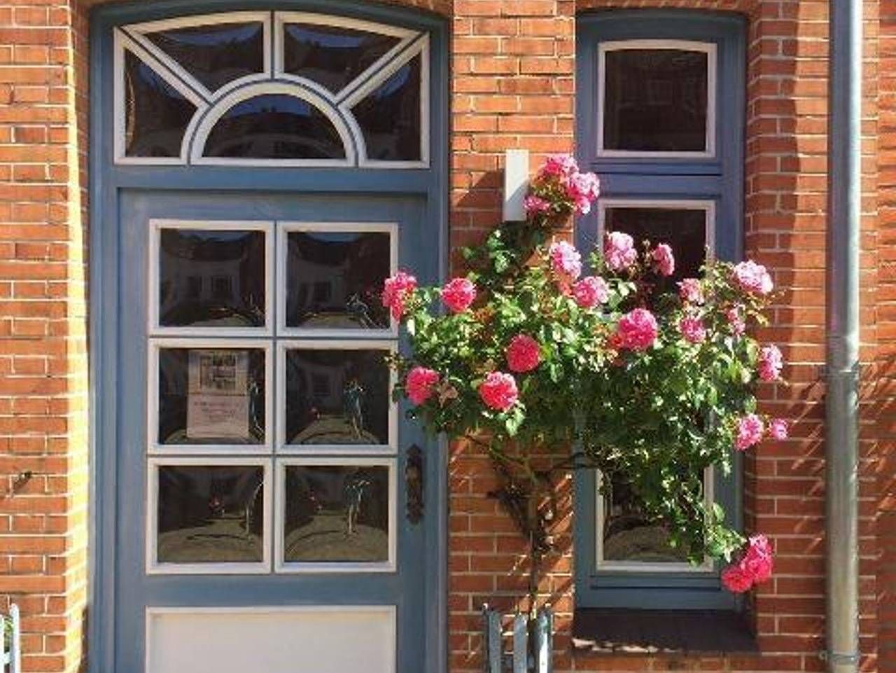 Das 1623 erbaute Handwerkerhaus wurde 1985 kernsaniert. Laut Stadtarchiv befand sich dort ursprünglich eine Bierbrauerei und später eine Stellmacherei. Die Hausmarke Amboss mit Rosen wurde nach der Sanierung 1985 eingesetzt und soll an die Handwerker des Hauses und die Rosen in Friedrichstadt erinnern. Der begrünte Innenhof ist liebevoll gestaltet und lädt zum Verweilen ein. Hier befindet sich auch eine Abstellmöglichkeit für Fahrräder. Zum Haus gehört auch ein eigener Bootssteg an der Gracht. Die Altstadt mit Geschäften, Restaurants und Cafés, Museen und Kirchen und dem Marktplatz sind fußläufig unter 10 Minuten zu erreichen. Die zweigeschossige, gemütliche und ruhige Ferienwohnung befindet sich im Anbau des Hauses mit eigenem Eingang im Innenhof. Sie wurde mit viel Liebe zum Detail renoviert und eingerichtet. Im Erdgeschoss befinden sich Bad mit Dusche und WC sowie eine kleine Diele mit Einbauschrank für die Garderobe und der Wohnraum mit einer gut ausgestatteten Küchenzeile und einem Essplatz. Die Sitzecke mit Couch und Sessel lädt zum entspannen ein. Tischleuchten Lampen in den dekorierten Fensternischen strahlen eine nordische Atmosphäre aus. Es wirkt hyggelig und gemütlich. Ein Flachbildfernseher mit Kabelanschluss und ein Radio mit CD-Player sind selbstverständlich vorhanden. Die Schlafgelegenheiten im Obergeschoss erreicht man über eine etwas steile, aber sichere Holztreppe.