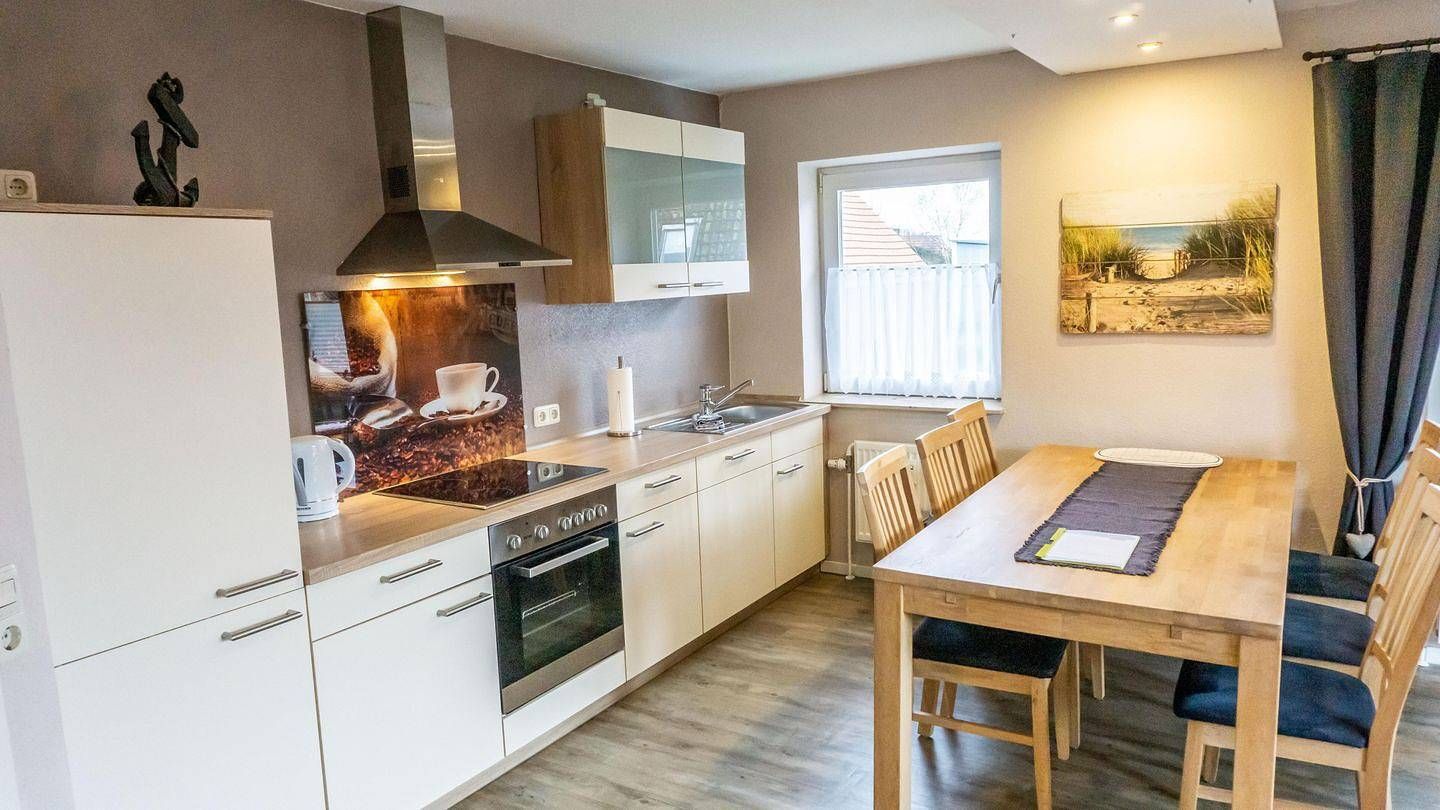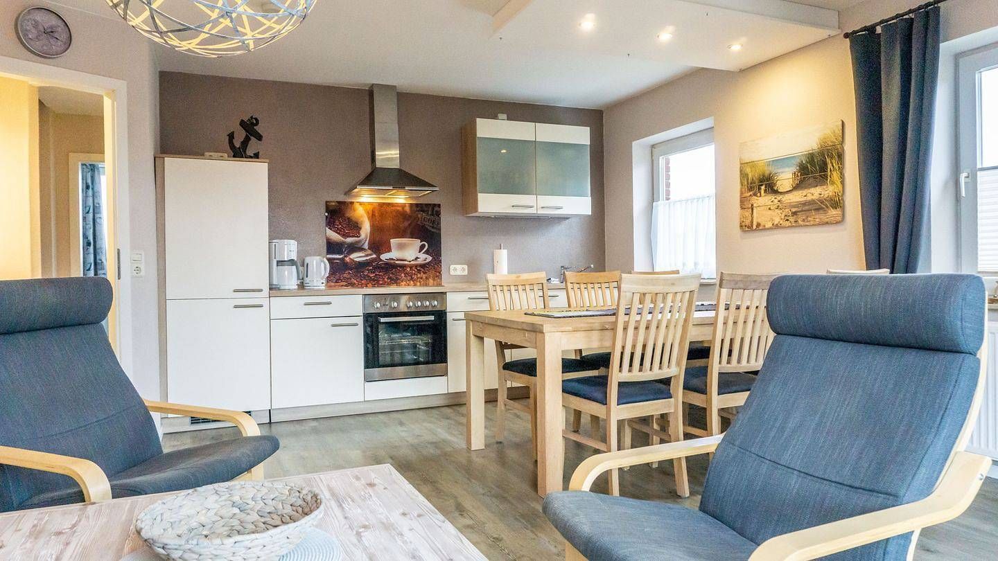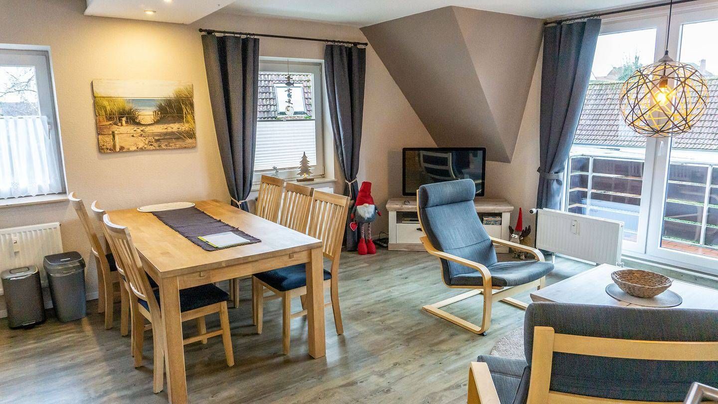 Ferienappartement, OG, ca. 83 qm, 5 Personen, Nichtraucher, WLAN Wohn-Essraum mit Sofagarnitur, Sessel. Offene Küche mit Geschirrspüler und Kaffeefiltermaschine. Essbereich für 5 Personen, Sat-TV, DVD-Player und Radio. Kleiner...