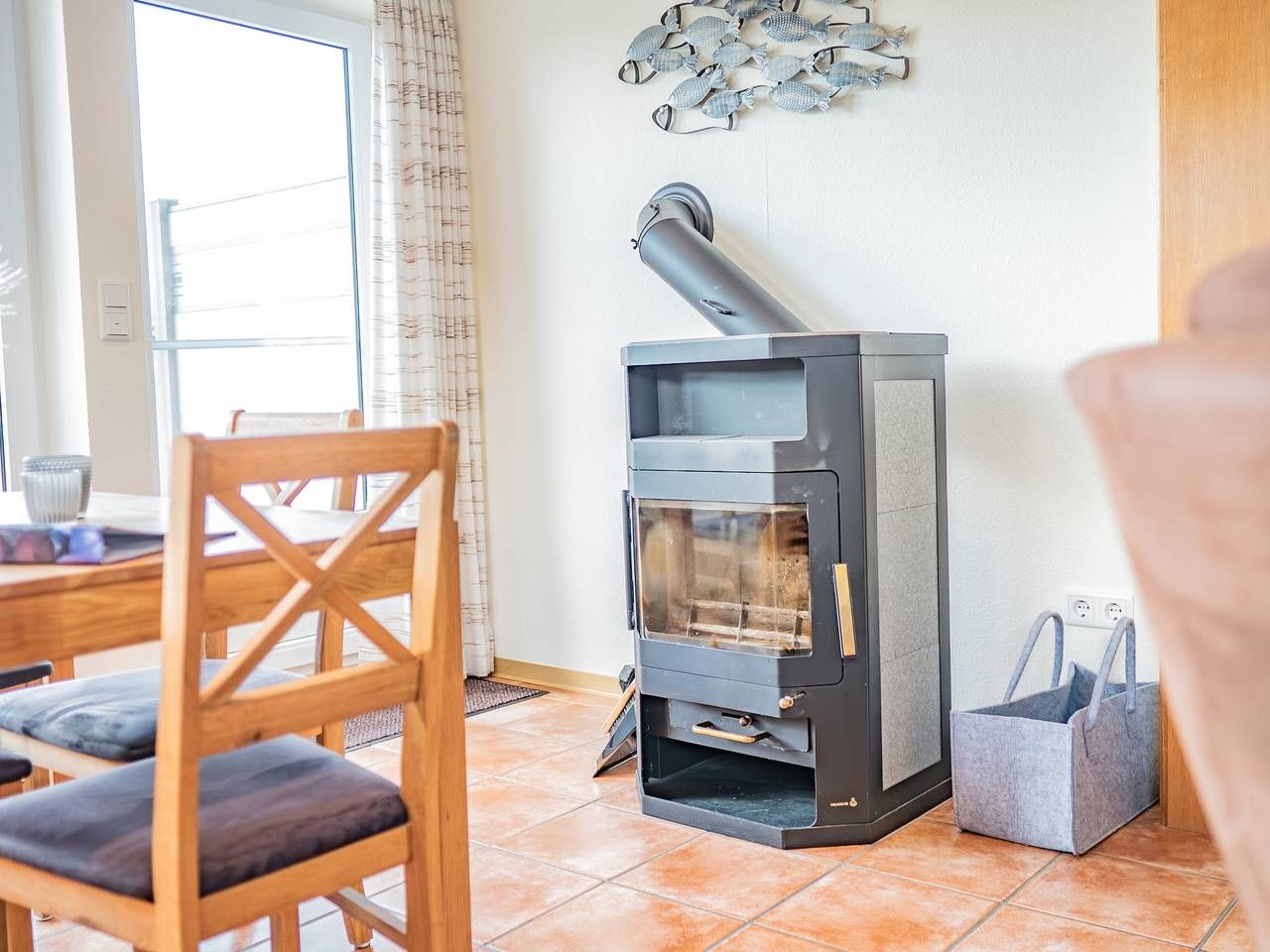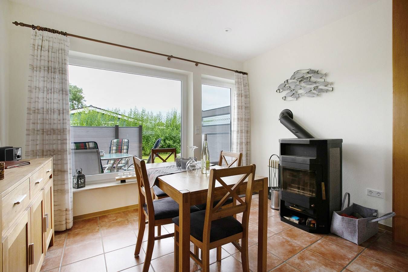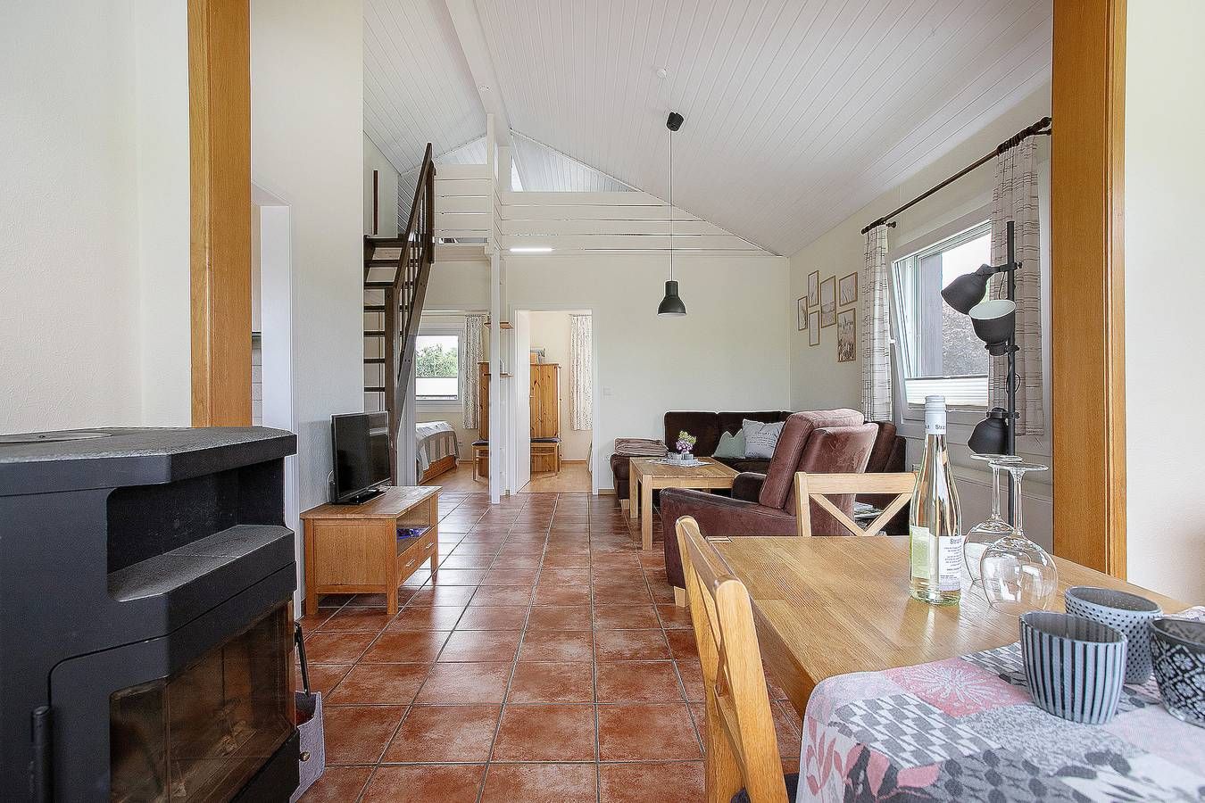 Unser Ferienhaus mit 60 Quadratmetern Wohnfläche, alles im Erdgeschoss und allergikerfreundlich mit Fliesen- und Laminatböden, bietet Platz für 4 Personen in 2 Doppelbetten. Zusätzlich gibt es zwei Liegen auf einem Dachboden mit begrenzter Stehhöhe (geeignet für Kinder zwischen 10 und 16 Jahren). Im Wohnzimmer befindet sich eine gemütliche Polstersitzgruppe mit TV und DVD-Player. Die helle Essecke lädt zu gemeinsamen Mahlzeiten mit der ganzen Familie ein und hat einen direkten Zugang zur Terrasse. Genießen Sie das Knistern des Feuers im gemütlichen Holzofen. Bitte bringen Sie Ihr eigenes Brennholz mit. Es gibt zwei Schlafzimmer, jedes mit einem Doppelbett. Die moderne und voll ausgestattete separate Küche verfügt über einen Backofen, Geschirrspüler, Kühlschrank mit Gefrierfach, Mikrowelle, Toaster und Wasserkocher sowie eine zusätzliche Essecke. Es gibt ein helles Duschbad mit WC und einen separaten abschließbaren Abstellraum für Sportgeräte. W-LAN kann kostenlos genutzt werden. Hunde sind willkommen, die Gegend des Gartens ist komplett eingezäunt. Handtücher und Bettwäsche sind vor Ort vorhanden und im Preis inbegriffen.
