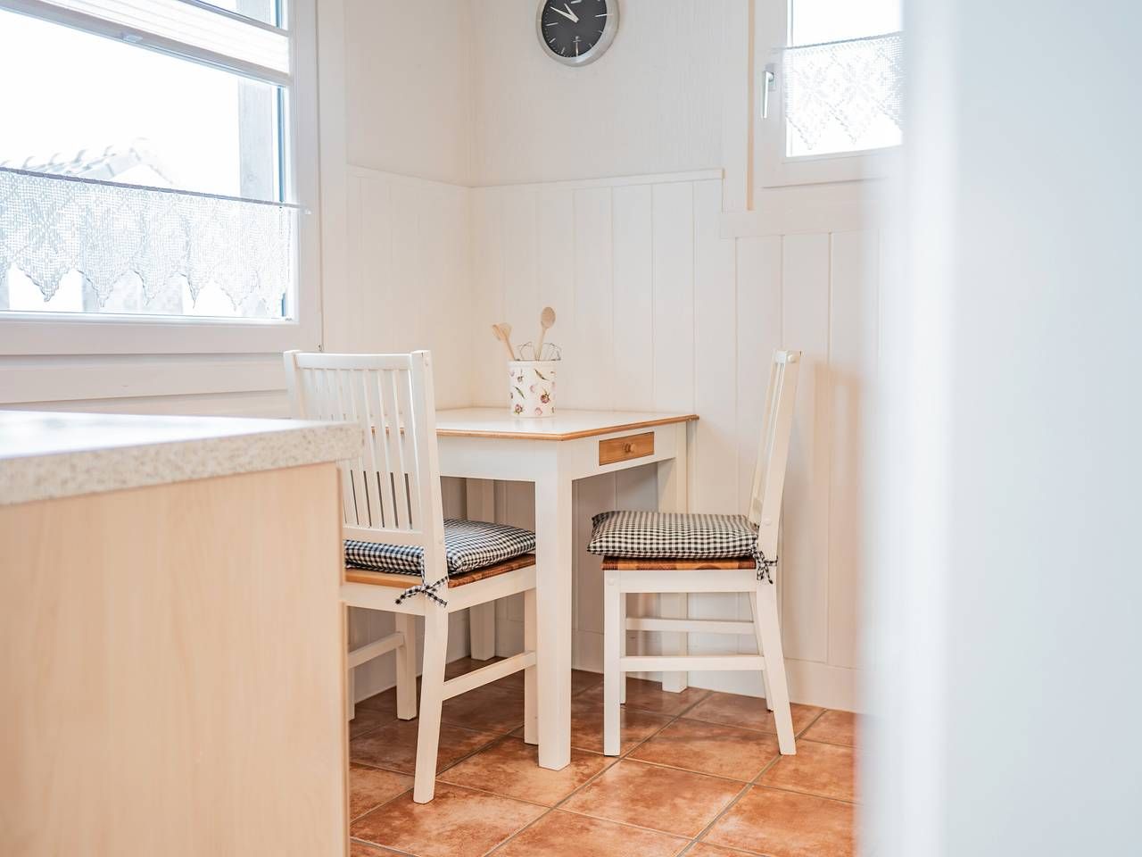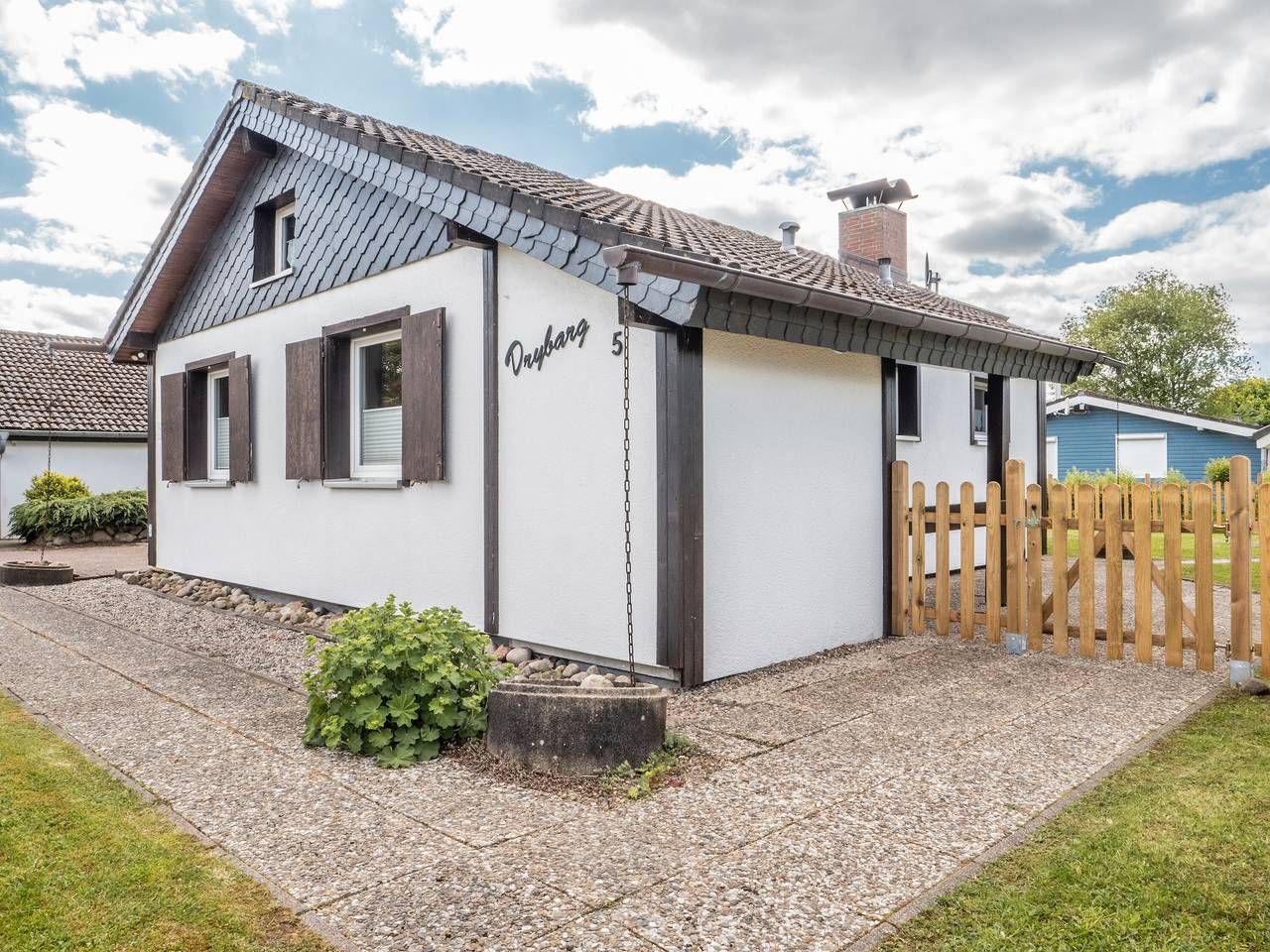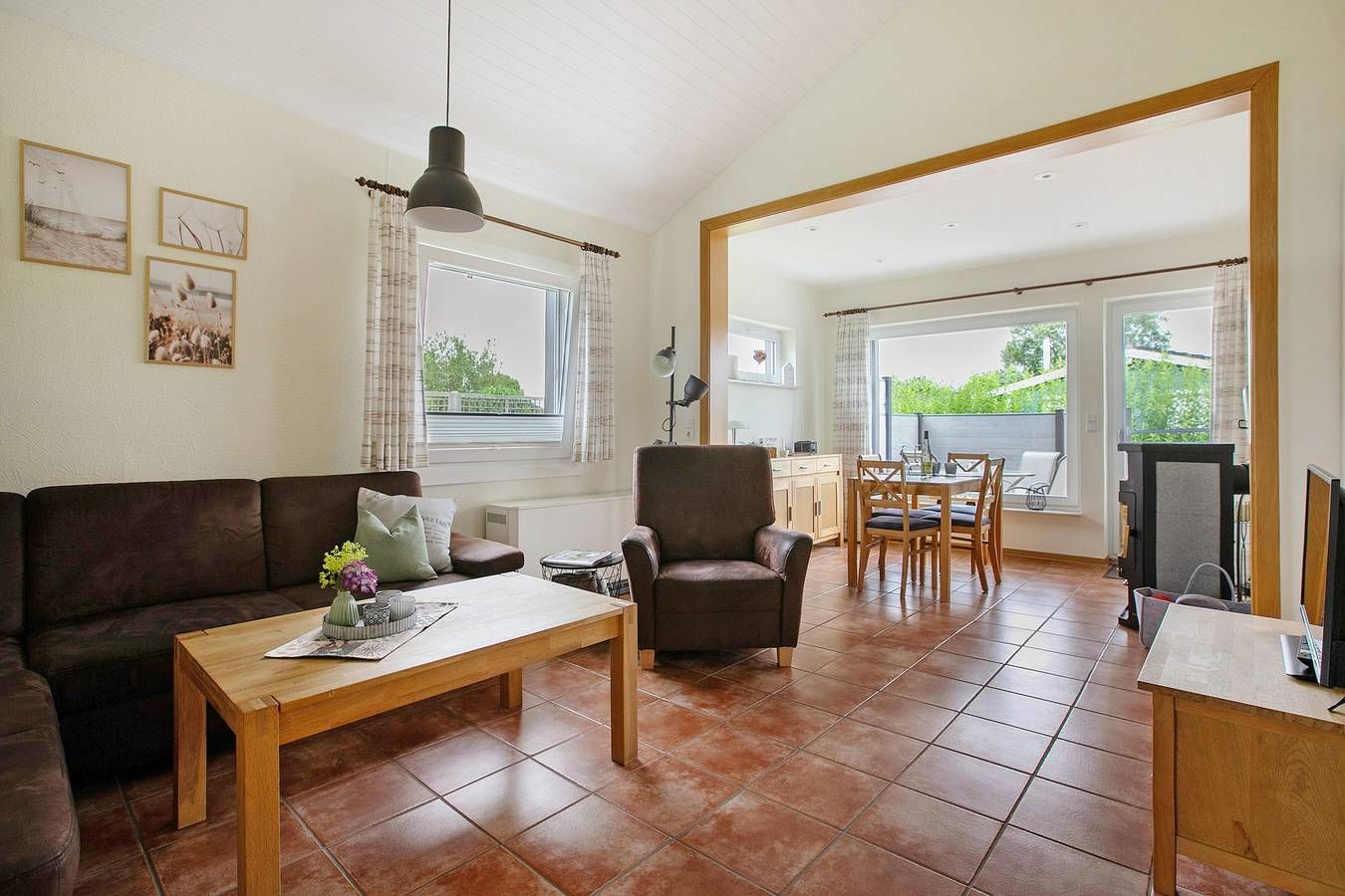 Unser Ferienhaus mit 60 Quadratmetern Wohnfläche, alles im Erdgeschoss und allergikerfreundlich mit Fliesen- und Laminatböden, bietet Platz für 4 Personen in 2 Doppelbetten. Zusätzlich gibt es zwei Liegen auf einem Dachboden mit begrenzter Stehhöhe (geeignet für Kinder zwischen 10 und 16 Jahren). Im Wohnzimmer befindet sich eine gemütliche Polstersitzgruppe mit TV und DVD-Player. Die helle Essecke lädt zu gemeinsamen Mahlzeiten mit der ganzen Familie ein und hat einen direkten Zugang zur Terrasse. Genießen Sie das Knistern des Feuers im gemütlichen Holzofen. Bitte bringen Sie Ihr eigenes Brennholz mit. Es gibt zwei Schlafzimmer, jedes mit einem Doppelbett. Die moderne und voll ausgestattete separate Küche verfügt über einen Backofen, Geschirrspüler, Kühlschrank mit Gefrierfach, Mikrowelle, Toaster und Wasserkocher sowie eine zusätzliche Essecke. Es gibt ein helles Duschbad mit WC und einen separaten abschließbaren Abstellraum für Sportgeräte. W-LAN kann kostenlos genutzt werden. Hunde sind willkommen, die Gegend des Gartens ist komplett eingezäunt. Handtücher und Bettwäsche sind vor Ort vorhanden und im Preis inbegriffen.