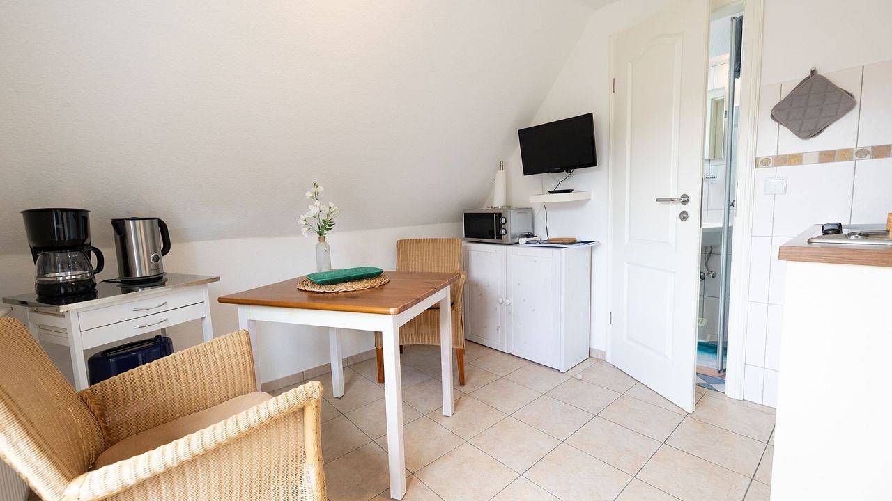 Beschreibung der Wohnung Die Ferienwohnung „Popenstuuv" (Friesisch: Puppenstube) im 1. Obergeschoss des Hauses „Waltraud" in Norddorf auf Amrum ist eine 2-Zimmer-Ferienwohnung mit Schlafmöglichkeiten für 1 bis 2 Personen....
