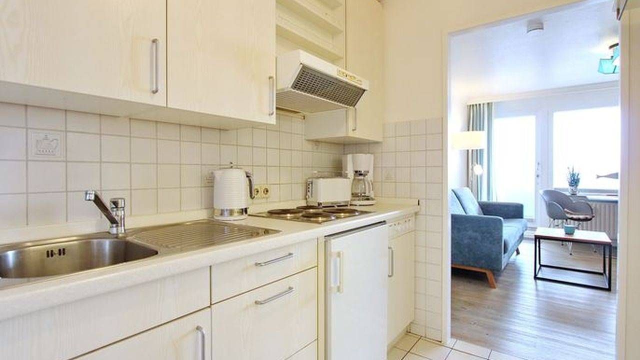 Beschreibung der Wohnung Diese Einzimmerwohnung befindet sich in der 4. Etage im Haus am Meer, nur wenige Schritte vom Strand und Meer entfernt. Der kombinierte Wohn-/Schlafraum mit vorgelagertem Ostbalkon (inkl. Balkonmöbel) verfügt über ein Doppelschrankbett, eine Couch und einen Essplatz mit 2 Stühlen. Im Badezimmer gibt es eine Dusche, einen Badezimmerhocker, einen mobilen Haltegriff, einen Fön und einen Kosmetikspiegel. Ausreichend Ablagefläche und Stauraum für ihre persönlichen Dinge ist vorhanden. Um sich während des Urlaubs selbst zu verpflegen steht ihnen im Flur eine Küchenzeile mit 4 Platten Herd, Dunstabzugshaube und zusätzlicher Nespressomaschine zur Verfügung. Zur technischen Ausstattung dieser Wohnung gehört: ein Smartfernseher von Panasonic. Den kostenfreien Zugang zum WLAN Hot Spot (WEG Haus am Meer - Passwortfrei - ohne Gewähr) können sie nutzen. Wohnungsgröße: ca. 30 m². [nbsp] Sonstiges Diese Einzimmerwohnung befindet sich in der 4. Etage im Haus am Meer, nur wenige Schritte vom Strand und Meer entfernt. Der kombinierte Wohn-/Schlafraum mit vorgelagertem Ostbalkon (inkl. Balkonmöbel) verfügt über ein Doppelschrankbett, eine Couch und einen Essplatz mit 2 Stühlen. Im Badezimmer gibt es eine Dusche, einen Badezimmerhocker, einen mobilen Haltegriff, einen Fön und einen Kosmetikspiegel. Ausreichend Ablagefläche und Stauraum für ihre persönlichen Dinge ist vorhanden. Um sich während des Urlaubs selbst zu verpflegen steht ihnen im Flur eine Küchenzeile mit 4 Platten Herd, Dunstabzugshaube und zusätzlicher Nespressomaschine zur Verfügung. Zur technischen Ausstattung dieser Wohnung gehört: ein Smartfernseher von Panasonic. Den kostenfreien Zugang zum WLAN Hot Spot (WEG Haus am Meer - Passwortfrei - ohne Gewähr) können sie nutzen. Wohnungsgröße: ca. 30 m². [nbsp]