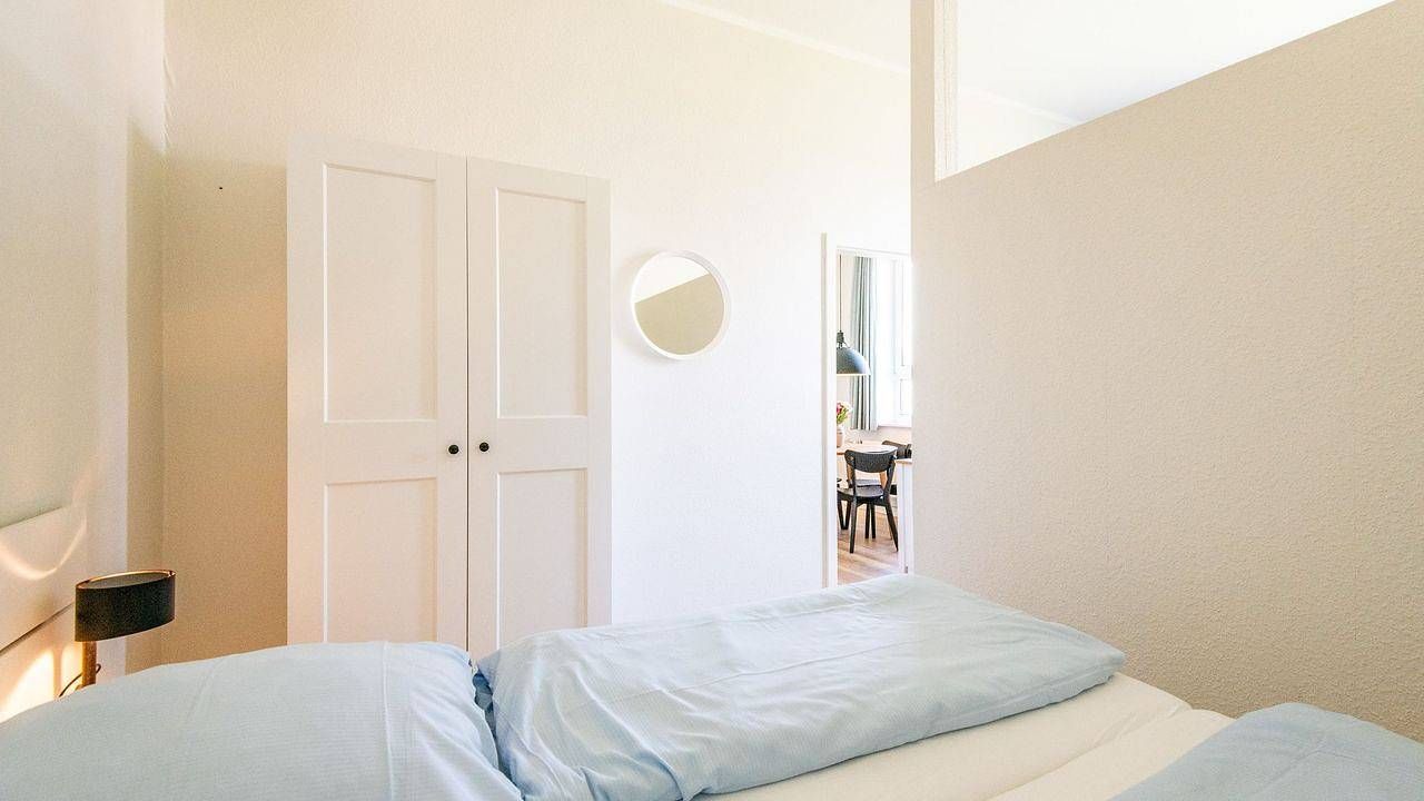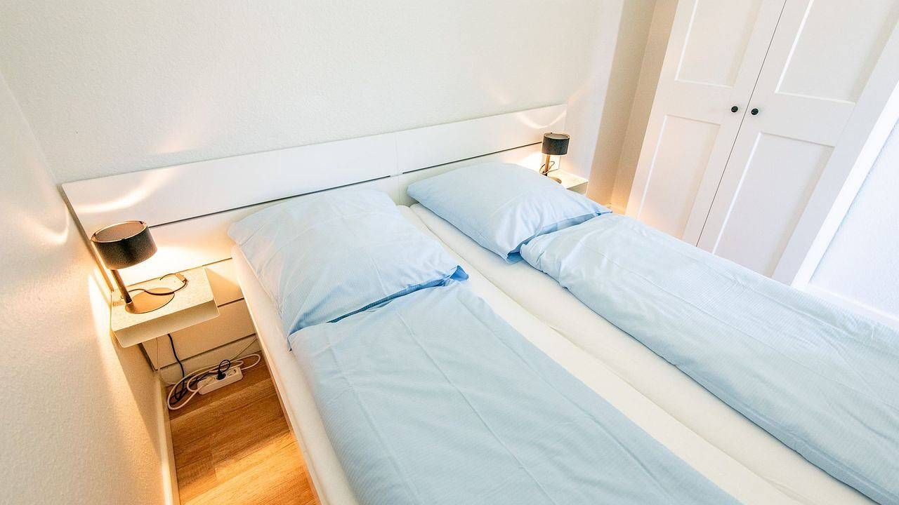 Beschreibung der Wohnung Es erwartet Sie eine im Frühjahr 2022 renovierte Ferienwohnung im 1. Stock unseres Hauses. Diesen erreichen Sie über das Treppenhaus, oder bequem mit dem Aufzug. Die Küchenzeile befindet sich im Eingangsbereich der Wohnung. Sie ist mit allem nötigen wie Herd, Backofen, Spülmaschine, Kaffeemaschine, Wasserkocher und Toaster, sowie Kochutensilien und Besteck bestückt. Die Essecke gliedert sich direkt an die Küchenzeile an. Von hier aus gelangt man in den geteilten Wohn-Schlafbereich und ins separate Schlafzimmer mit einem Einzel- und einem Etagenbett für 3 Personen. Der Wohn-Schlafbereich ist mit einer gemütlichen Sofaecke sowie einem TV-Gerät ausgestattet. Der Schlafbereich ist durch eine Wand (ohne Tür) vom Wohnbereich getrennt und mit einem bequemen Doppelbett und einem Kleiderschrank möbliert. Das Badezimmer ist mit einer bodengleichen Dusche, einem Waschbecken, einem WC und einer Handtuchheizung ausgestattet.