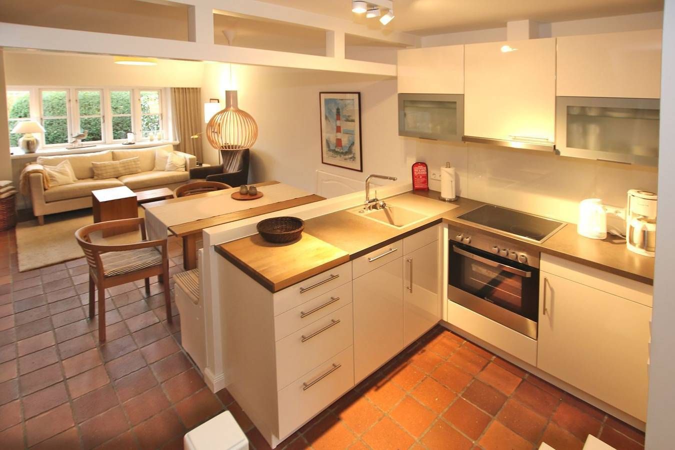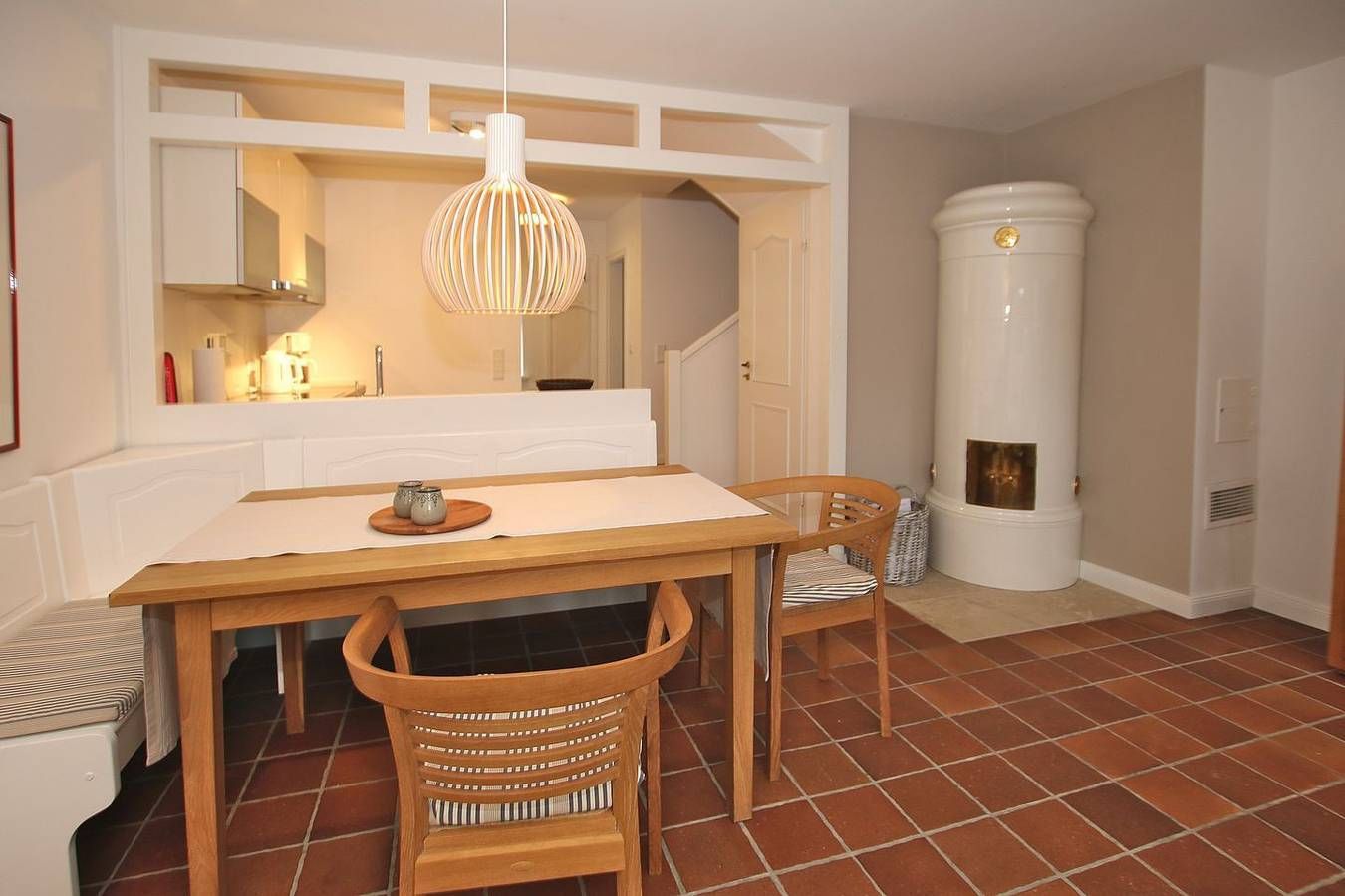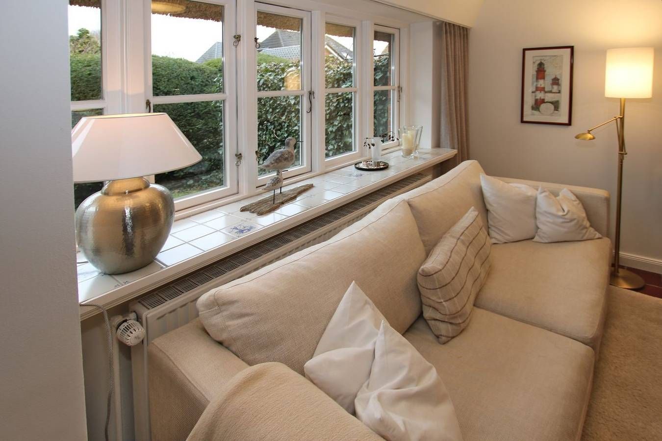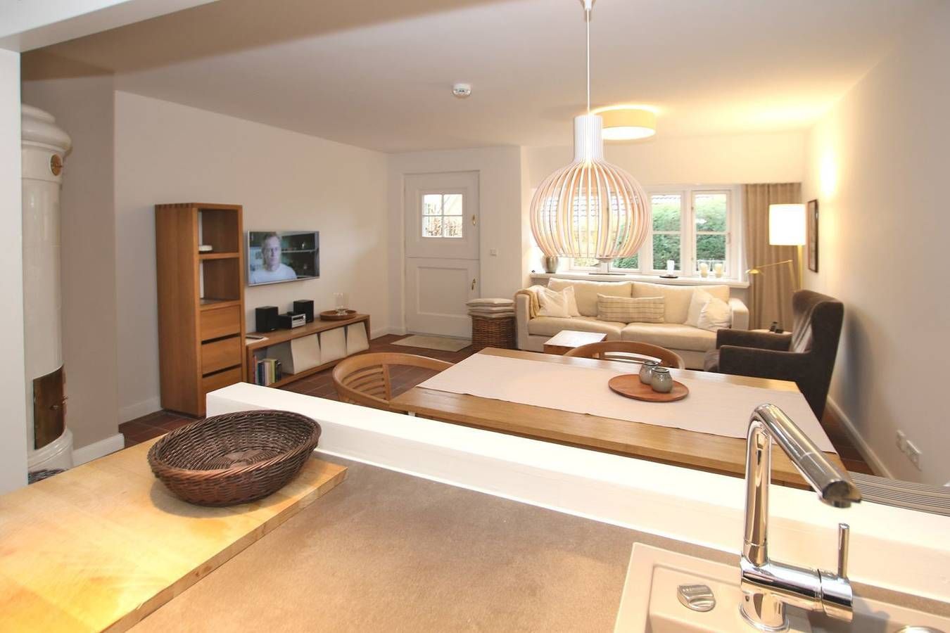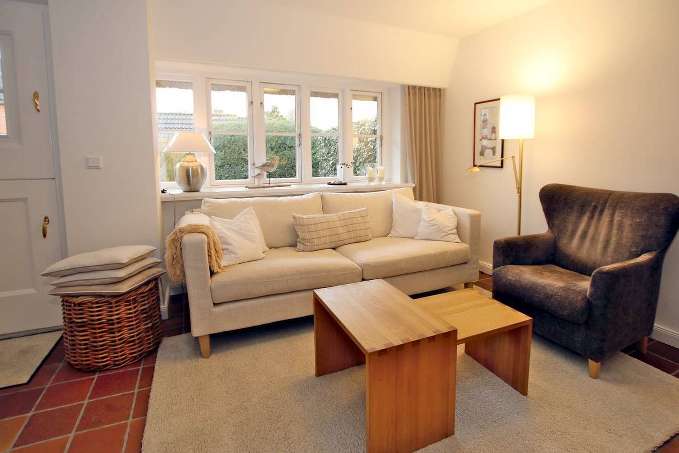 Ferienwohnung in Wrixum auf Föhr, Ohl Dörp 22 Pastoratshof, Haus 7: Gemütliche 3-Zimmer-Nichtraucher -Wohnung in einem Reetdachhaus. WOHNZIMMER: mit 3er Couch und 1 Sessel, Kachelofen. KÜCHENBEREICH: Komplett ausgestattet mit...